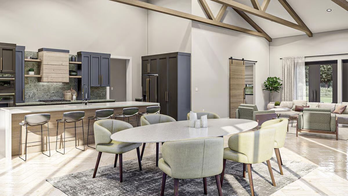 The open-concept living area unites the kitchen, dining, and great room beneath a soaring cathedral ceiling.