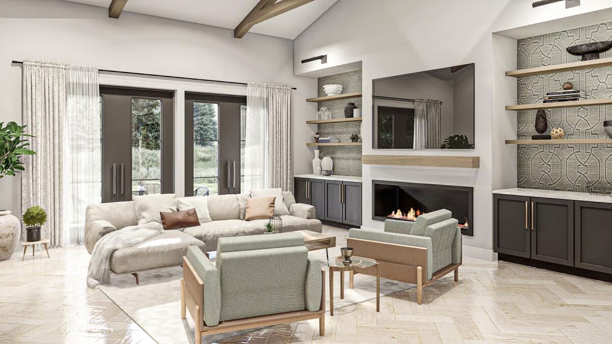 The great room is a true centerpiece, featuring French doors, a built-in fireplace with custom cabinetry, and an inviting layout ideal for entertaining or relaxing.