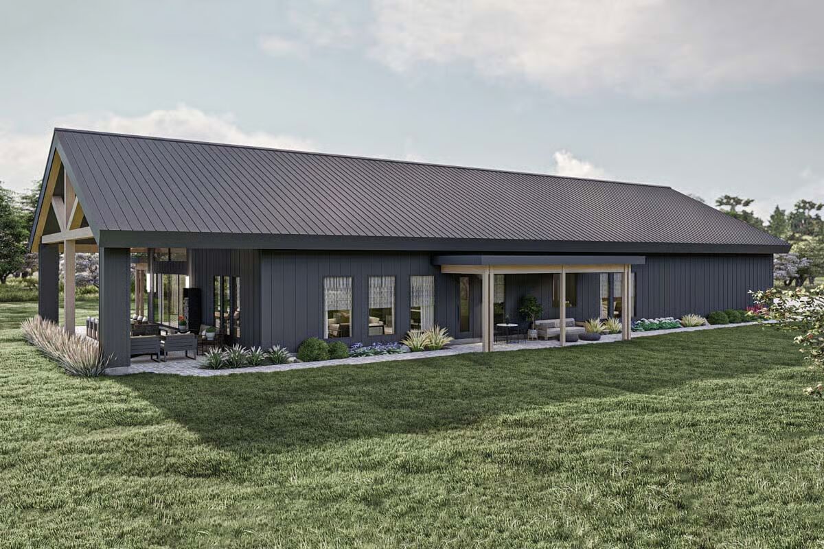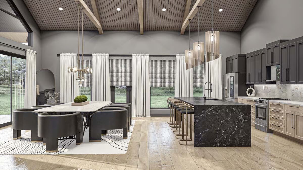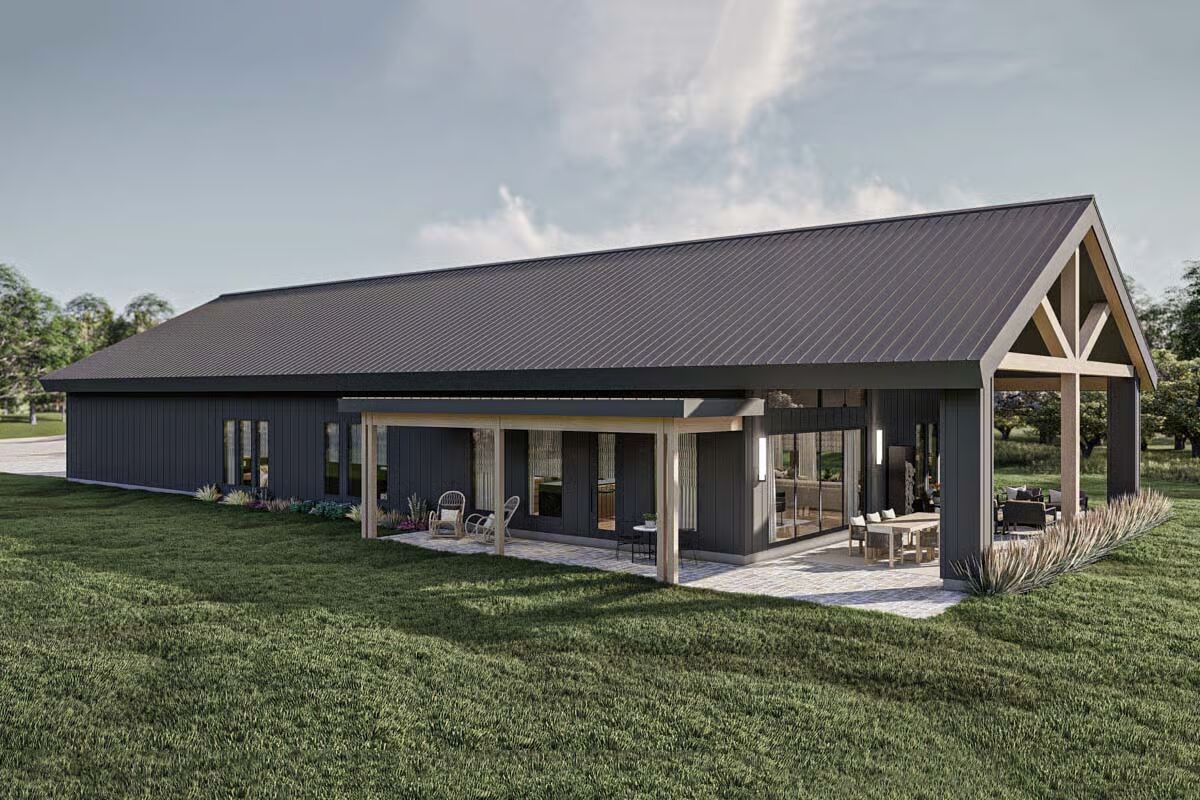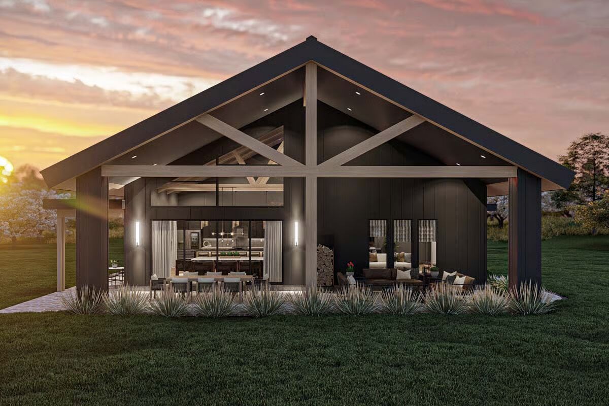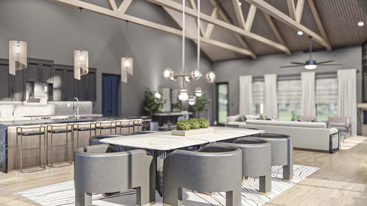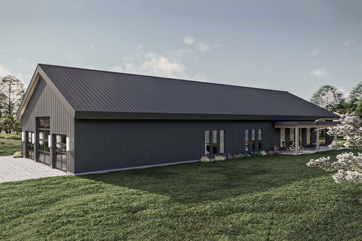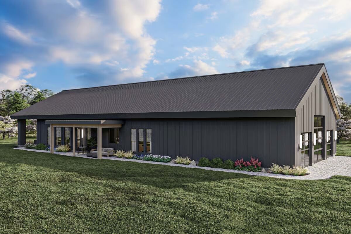 Behold the long, commanding presence of this dark-clad barndominium, a testament to contemporary rural living with a chic edge.Admire the sleek, dark exterior and the inviting covered patio that offers a seamless transition to the outdoors.This striking barndominium shows off its expansive profile and a covered outdoor dining area perfect for al fresco meals.The modern farmhouse appeal is strong in this side view, which highlights the clean lines and generous windows of the structure.Experience the dramatic beauty of this barndominium at sunset, with its grand open-concept living spilling onto the patio.Gaze upon the impressive facade of the three-car garage, featuring stylish frosted doors that hint at the treasures within.Step into the entryway featuring a stylish console, statement mirror, and large windows that connect the interior to the lush outdoor space.Relax in this sophisticated seating area, featuring a modern corner fireplace and chic black marble-topped coffee tables.The magnificent living room offers a cozy fireplace, a striking marble-clad feature wall, and vaulted ceilings with exposed beams.The spacious great room flows seamlessly between the living and dining areas, all bathed in natural light from the large windows.A side view of the kitchen reveals the striking contrast between the black marbled island and the lighter wood cabinetry.The gourmet kitchen features sophisticated dark cabinetry and a stunning marbled waterfall island with seating for five.Enjoy views of the beautiful landscape from the dining table, perfectly framed by expansive windows and a vaulted roofline.Wood-slat ceilings soar over the combined kitchen and dining area, creating a warm, contemporary, and open-concept space.The dining space anchors the great room, sitting beneath a dramatic lighting fixture and framed by the structure’s exposed timber trusses.The master bedroom is a serene retreat with a striking wood-slat accent wall and an elegant, modern chandelier.Indulge in the luxurious primary bath, complete with a freestanding soaking tub and a sleek double vanity set against marble.This cozy bedroom features a stylish black wainscoting headboard and soft, neutral tones for a tranquil guest experience.