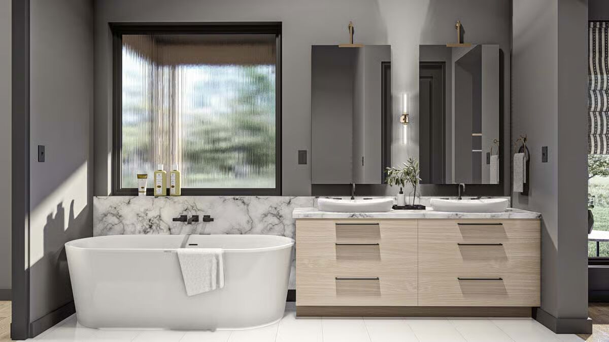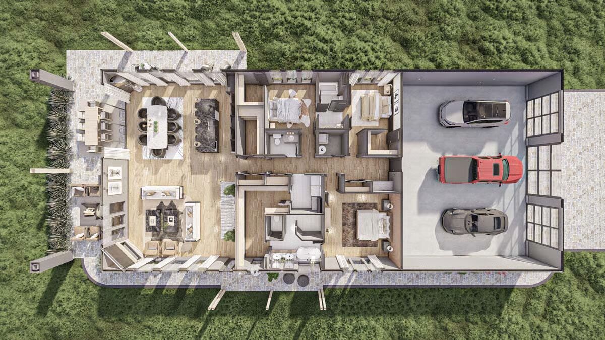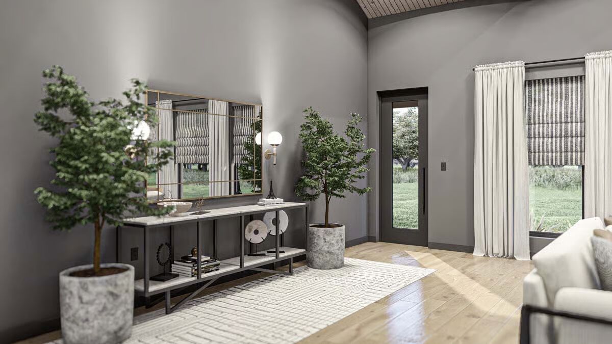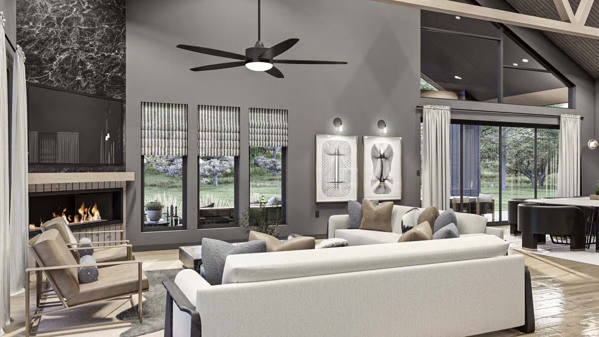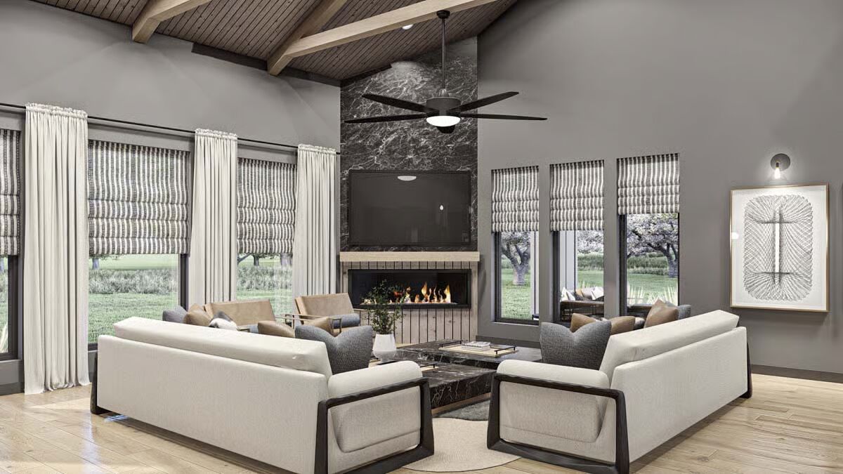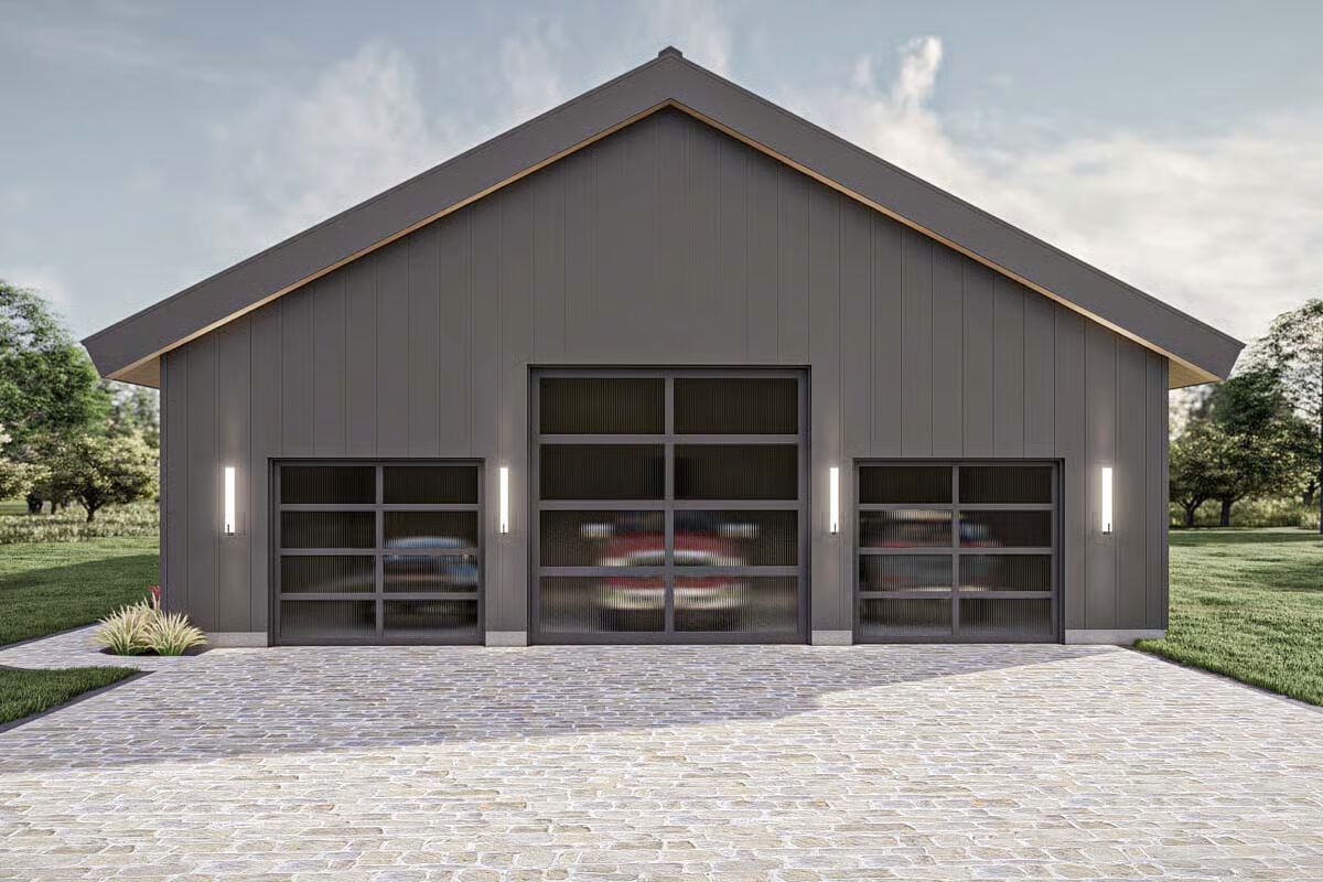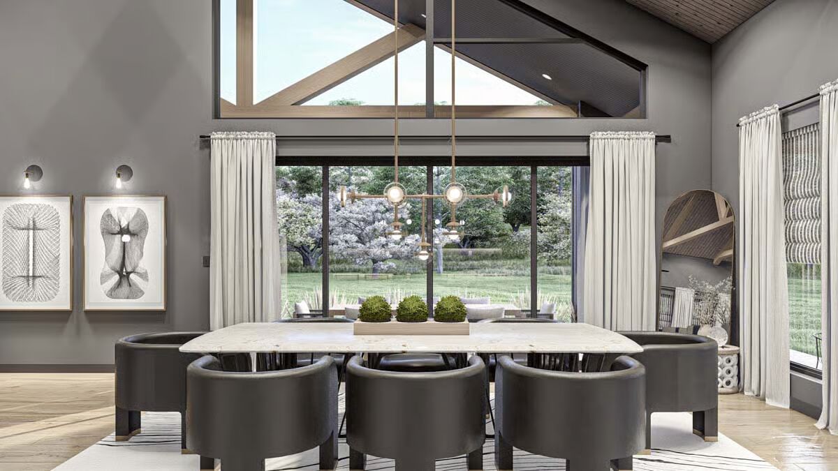 Behold the long, commanding presence of this dark-clad barndominium, a testament to contemporary rural living with a chic edge.Admire the sleek, dark exterior and the inviting covered patio that offers a seamless transition to the outdoors.This striking barndominium shows off its expansive profile and a covered outdoor dining area perfect for al fresco meals.The modern farmhouse appeal is strong in this side view, which highlights the clean lines and generous windows of the structure.Experience the dramatic beauty of this barndominium at sunset, with its grand open-concept living spilling onto the patio.Gaze upon the impressive facade of the three-car garage, featuring stylish frosted doors that hint at the treasures within.Step into the entryway featuring a stylish console, statement mirror, and large windows that connect the interior to the lush outdoor space.Relax in this sophisticated seating area, featuring a modern corner fireplace and chic black marble-topped coffee tables.The magnificent living room offers a cozy fireplace, a striking marble-clad feature wall, and vaulted ceilings with exposed beams.The spacious great room flows seamlessly between the living and dining areas, all bathed in natural light from the large windows.A side view of the kitchen reveals the striking contrast between the black marbled island and the lighter wood cabinetry.The gourmet kitchen features sophisticated dark cabinetry and a stunning marbled waterfall island with seating for five.Enjoy views of the beautiful landscape from the dining table, perfectly framed by expansive windows and a vaulted roofline.Wood-slat ceilings soar over the combined kitchen and dining area, creating a warm, contemporary, and open-concept space.The dining space anchors the great room, sitting beneath a dramatic lighting fixture and framed by the structure’s exposed timber trusses.The master bedroom is a serene retreat with a striking wood-slat accent wall and an elegant, modern chandelier.Indulge in the luxurious primary bath, complete with a freestanding soaking tub and a sleek double vanity set against marble.This cozy bedroom features a stylish black wainscoting headboard and soft, neutral tones for a tranquil guest experience.