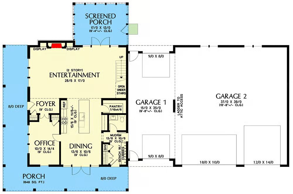 A mudroom connects the main living area to the oversized drive-through garage, which features a dramatic 37′ x 39′ open bay with soaring ceilings, offering unmatched flexibility for storage, vehicles, or hobbies.