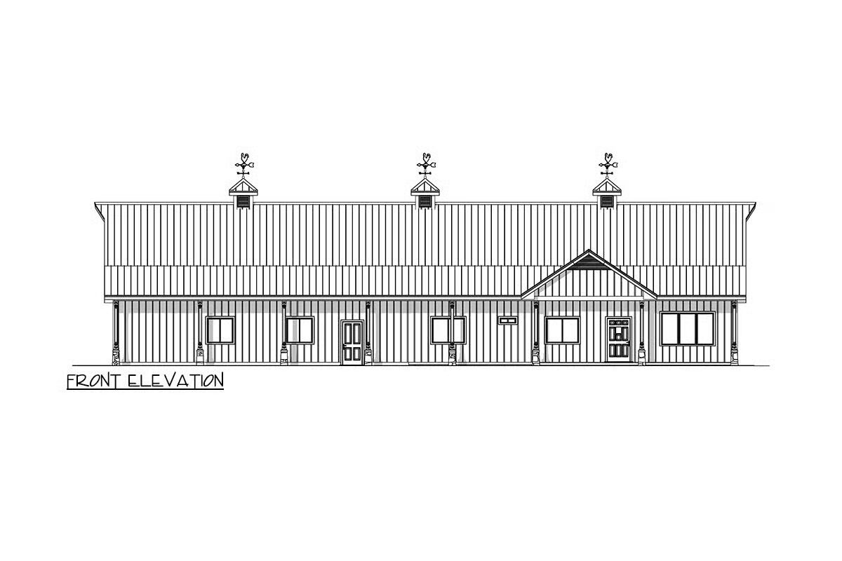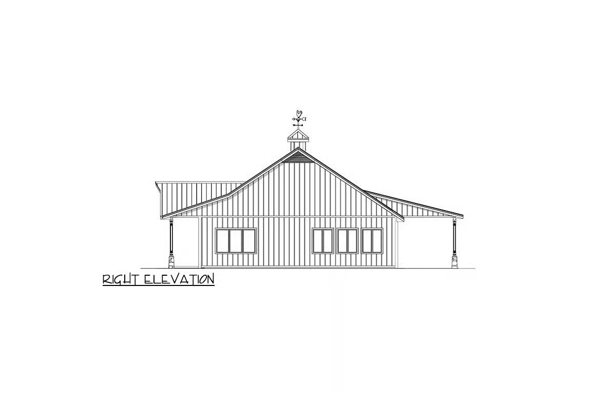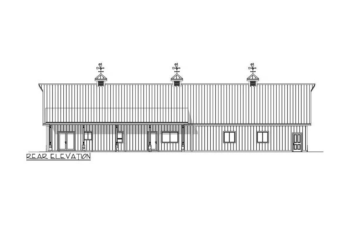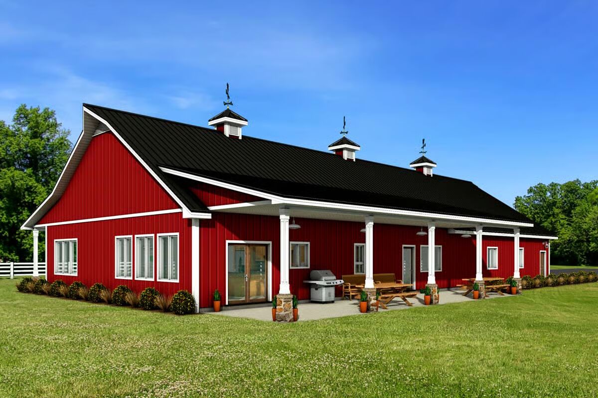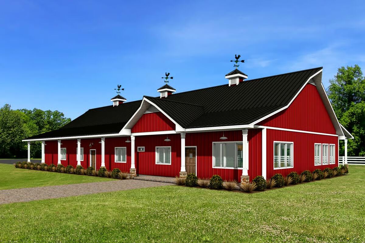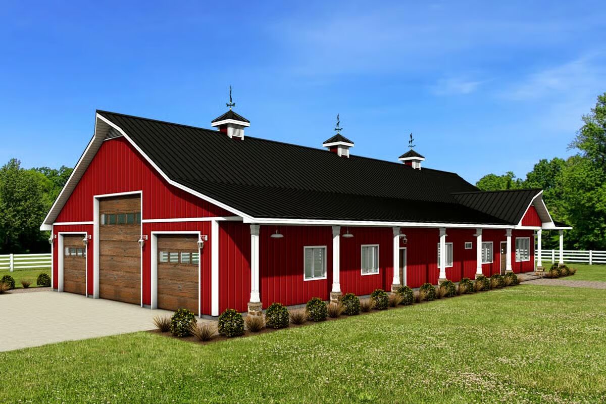 This barndominium-style home offers 1,980 sq. ft. of heated living space, with 3 bedrooms and 2.5 bathrooms, designed with conventional wood framing and 2×6 exterior walls for durability and efficiency.