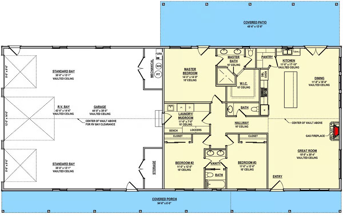 Welcome to the gallery of photos for the Barndominium-Style House with Vaulted RV Garage – 1980 Sq Ft Home and 1780 Sq Ft Garage. The floor plan is shown below: