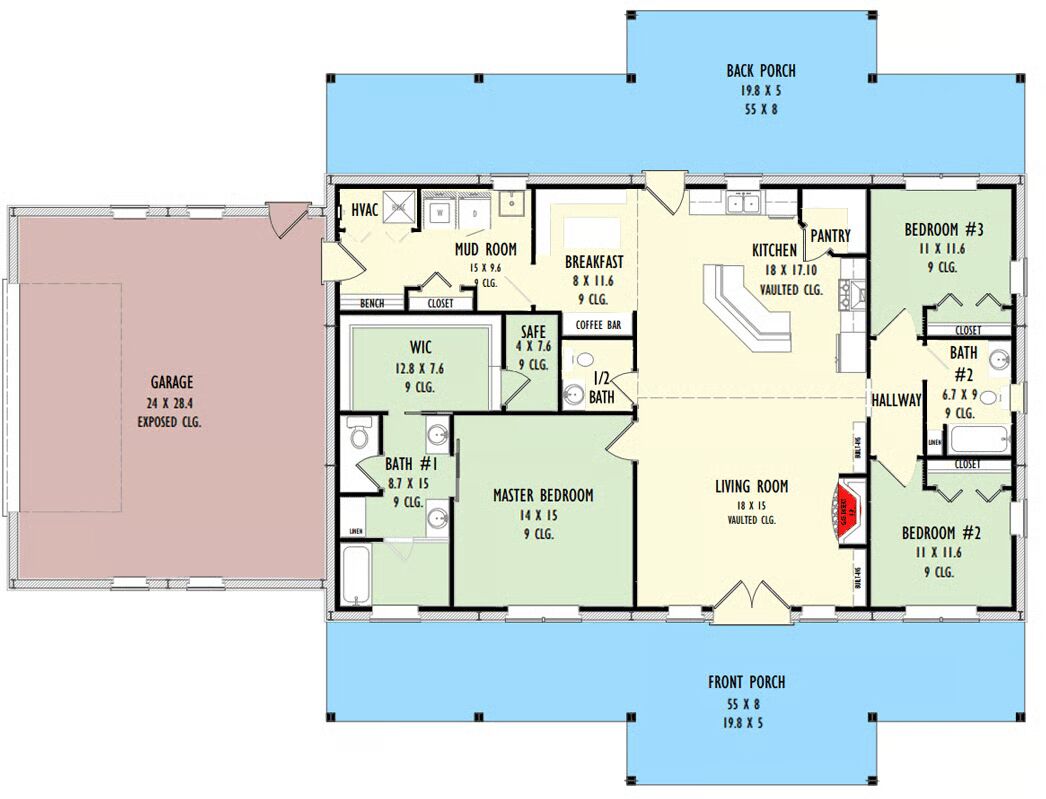 Welcome to the gallery of photos for the Barndominium Under 2000 Square Feet with Front and Rear Porches. The floor plan is shown below: