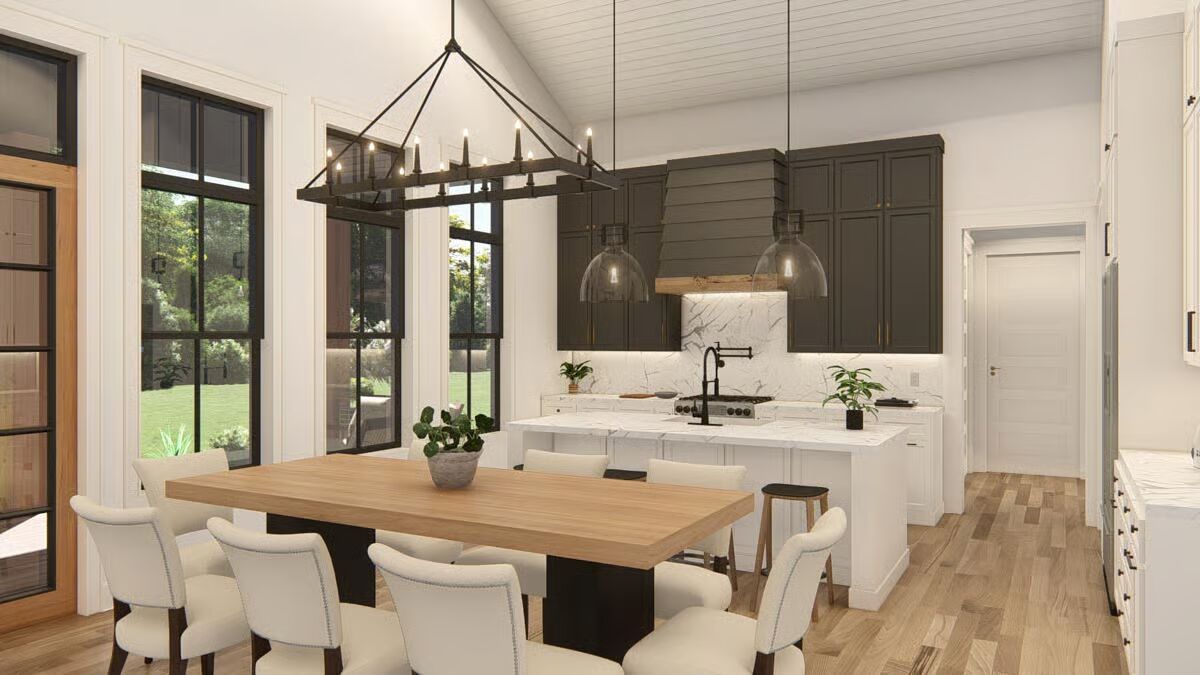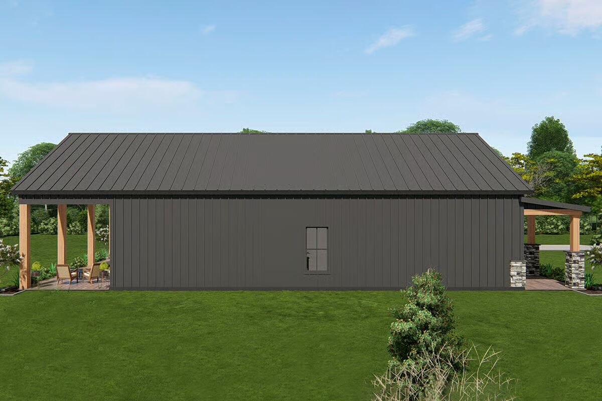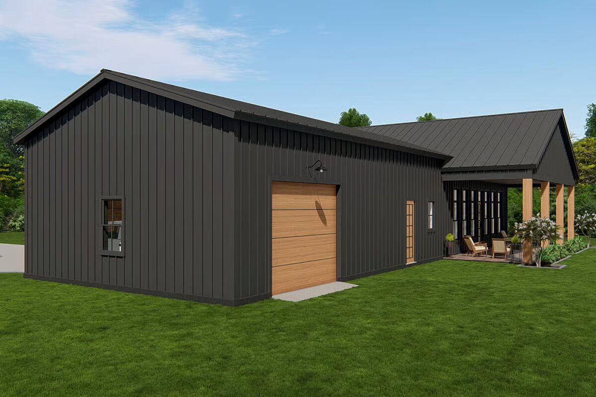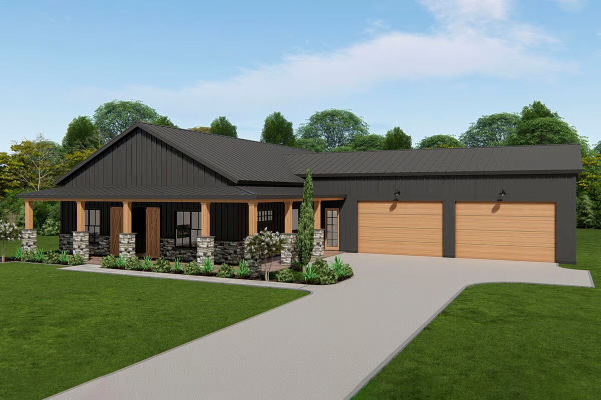 Buy This PlanThis striking barndominium-style home combines a classic porch with stone pillars and two modern garage bays, offering curb appeal and functionality.The angled front view captures the full charm of the barndominium, from its welcoming porch to the dual wood garage doors.A broad concrete driveway leads to the impressive two-car garage, perfectly complementing the home’s inviting front porch.A side view highlights the home’s dark, vertical siding and a stone-clad portico, showcasing a rustic yet refined style.The home’s side profile features a prominent wood garage door and a stylish back entrance, revealing its versatile and practical design.The back of the house features a stylish covered porch with floor-to-ceiling windows and a side garage door.The rear of this barndominium features an inviting covered patio, perfect for relaxing and enjoying the outdoors.The sleek, linear design of the home’s side profile shows off its minimalist aesthetic and generous proportions.The living room is both cozy and chic, with a modern fireplace as the centerpiece and vaulted ceilings that enhance the sense of space.The living room flows effortlessly into the dining area and kitchen, creating an inviting and unified open-concept space.A view from the living room reveals an elegant dining area and a modern kitchen, creating an open and welcoming atmosphere.An open-concept living area with a vaulted ceiling and a wall of windows connects the living room and kitchen seamlessly.This bright and airy kitchen showcases a beautiful blend of dark and white cabinetry, centered around a large dining table.This modern kitchen features a marble-topped island and dark, sleek cabinetry, creating a sophisticated and functional space.This kitchen’s central island provides ample workspace, while tall windows flood the entire space with natural light.A spacious two-car garage with striking wood-paneled doors provides ample room for both vehicles and projects.The spacious garage is an organizer’s dream, with a built-in workbench and plenty of wall space for tools and equipment.