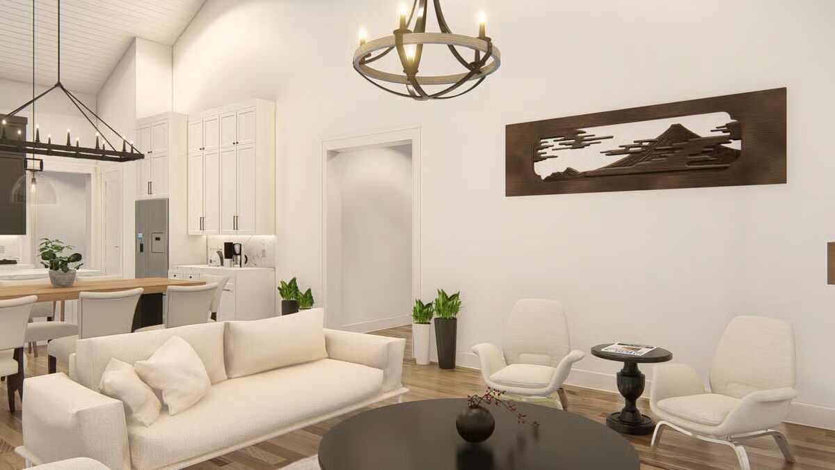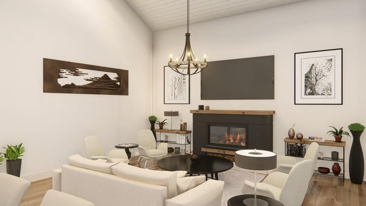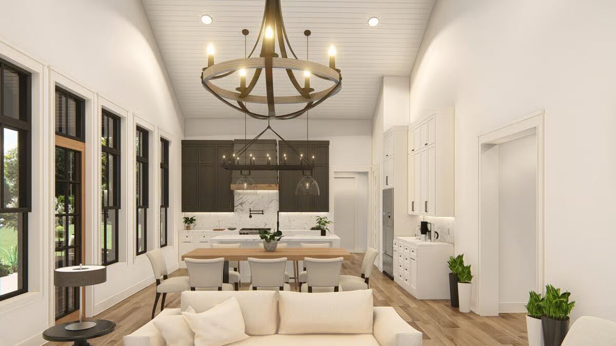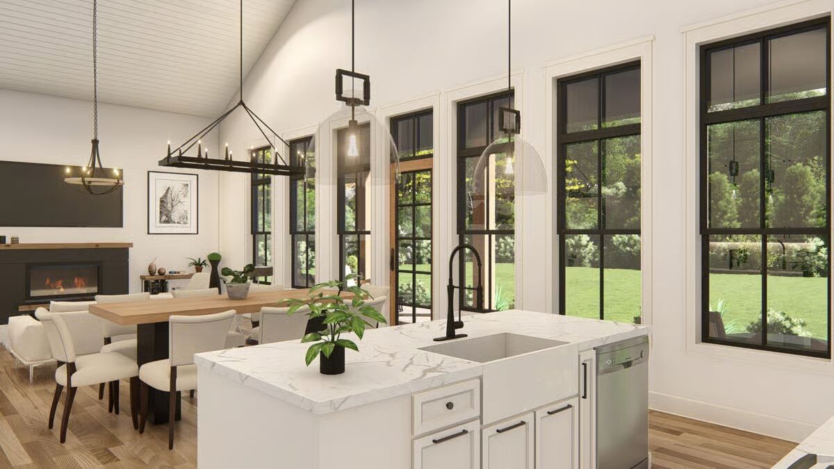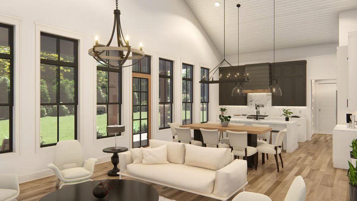 Buy This PlanThis striking barndominium-style home combines a classic porch with stone pillars and two modern garage bays, offering curb appeal and functionality.The angled front view captures the full charm of the barndominium, from its welcoming porch to the dual wood garage doors.A broad concrete driveway leads to the impressive two-car garage, perfectly complementing the home’s inviting front porch.A side view highlights the home’s dark, vertical siding and a stone-clad portico, showcasing a rustic yet refined style.The home’s side profile features a prominent wood garage door and a stylish back entrance, revealing its versatile and practical design.The back of the house features a stylish covered porch with floor-to-ceiling windows and a side garage door.The rear of this barndominium features an inviting covered patio, perfect for relaxing and enjoying the outdoors.The sleek, linear design of the home’s side profile shows off its minimalist aesthetic and generous proportions.The living room is both cozy and chic, with a modern fireplace as the centerpiece and vaulted ceilings that enhance the sense of space.The living room flows effortlessly into the dining area and kitchen, creating an inviting and unified open-concept space.A view from the living room reveals an elegant dining area and a modern kitchen, creating an open and welcoming atmosphere.An open-concept living area with a vaulted ceiling and a wall of windows connects the living room and kitchen seamlessly.This bright and airy kitchen showcases a beautiful blend of dark and white cabinetry, centered around a large dining table.This modern kitchen features a marble-topped island and dark, sleek cabinetry, creating a sophisticated and functional space.This kitchen’s central island provides ample workspace, while tall windows flood the entire space with natural light.A spacious two-car garage with striking wood-paneled doors provides ample room for both vehicles and projects.The spacious garage is an organizer’s dream, with a built-in workbench and plenty of wall space for tools and equipment.