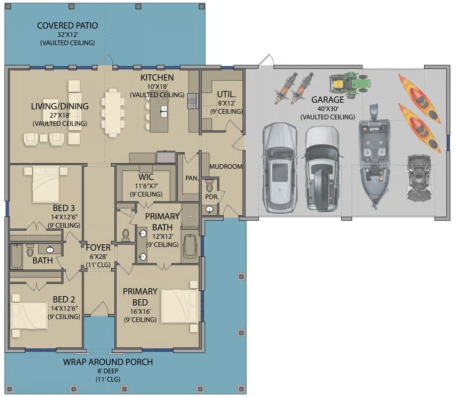 A generous 30′ x 40′ garage/shop with a drive-through bay is accessible through matching 16′ x 10′ overhead doors in the front and a 12′ x 10′ door at the back.