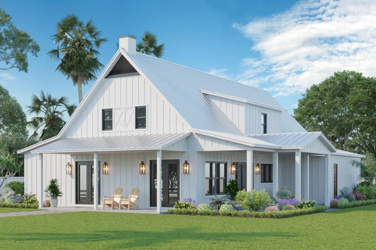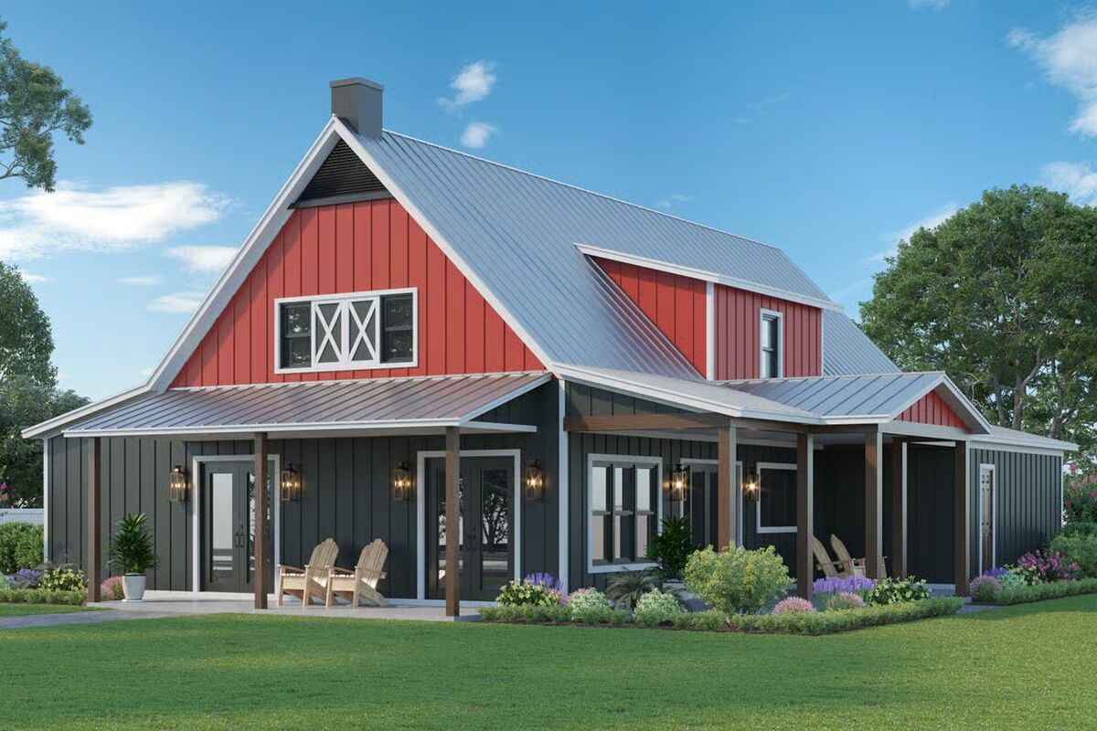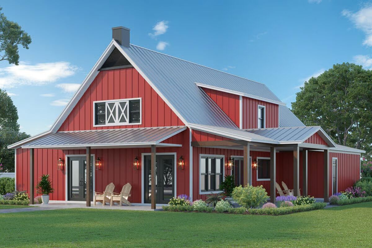 Blending timeless charm with modern convenience, this barndominium-style home features a metal gabled roofline, shed dormer, and board-and-batten siding, evoking the look of a classic country barn.