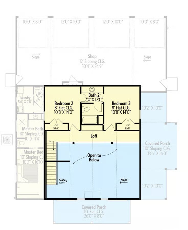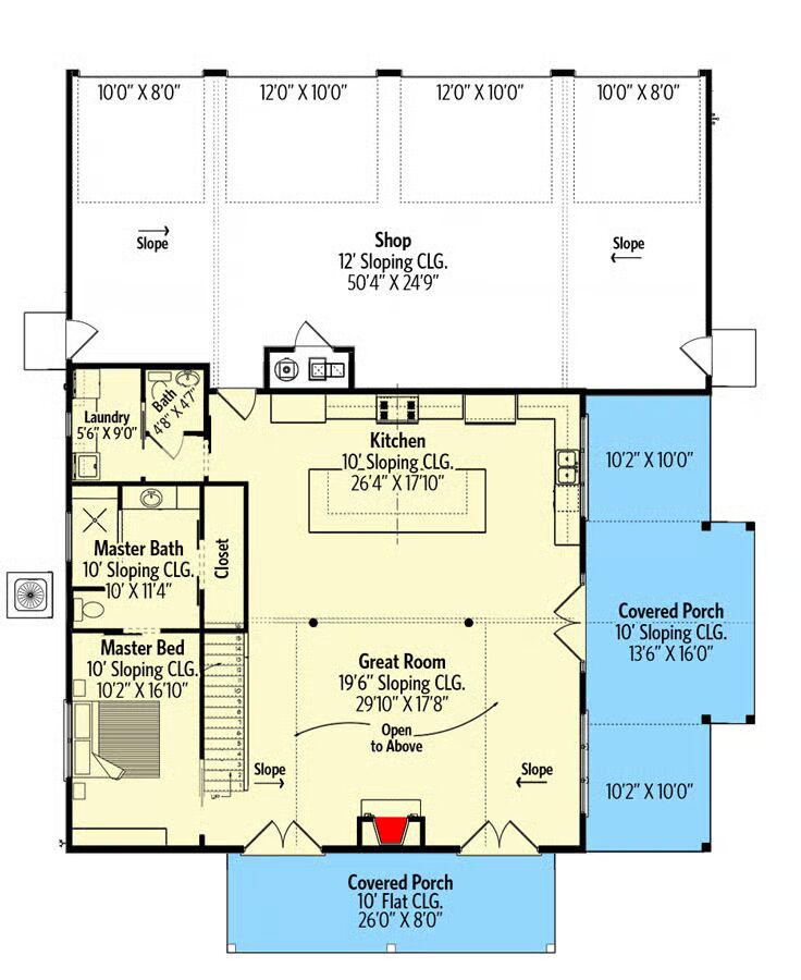 Offering 3 bedrooms and a 4-car garage/workshop, this plan is designed for both comfort and functionality.