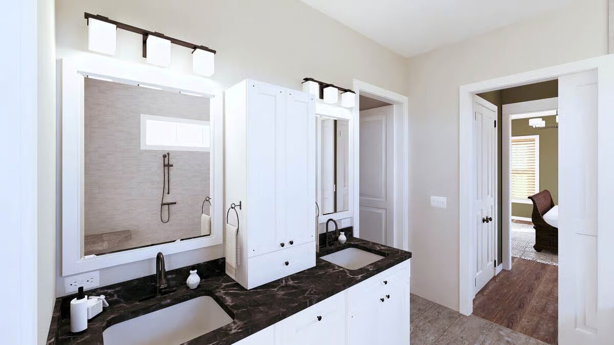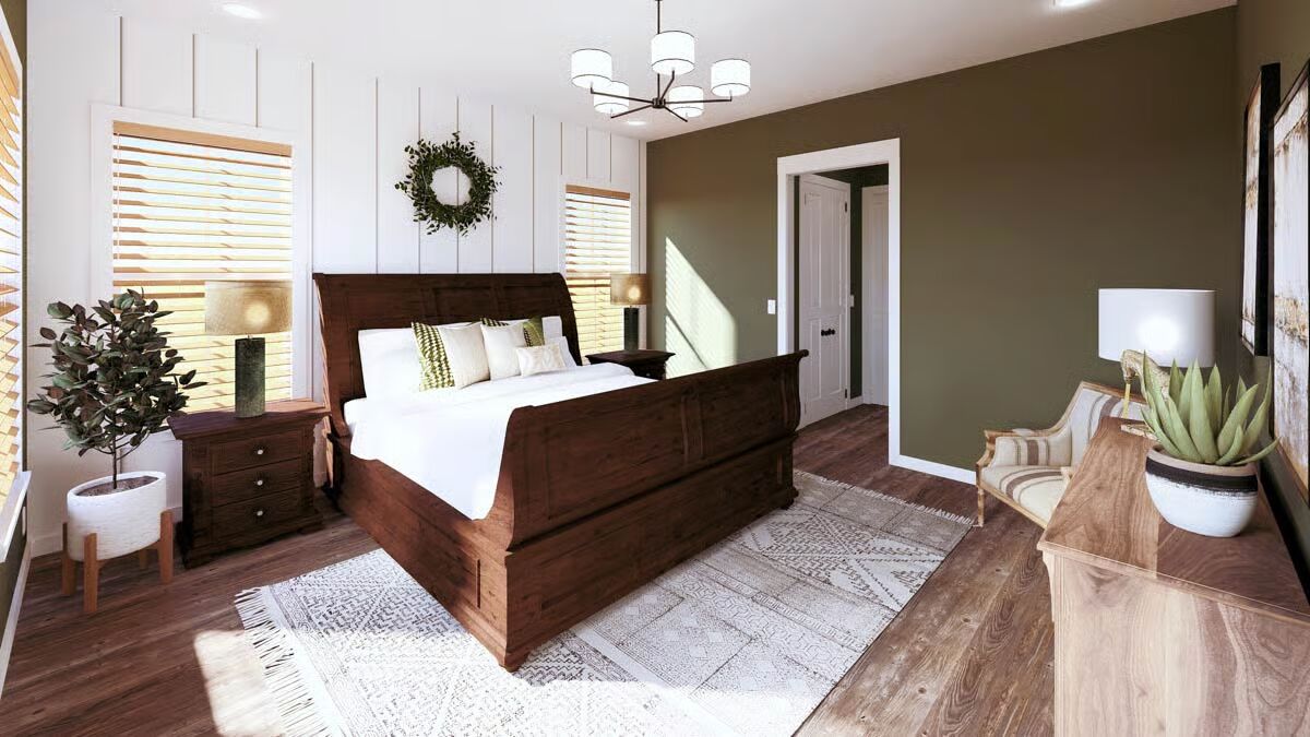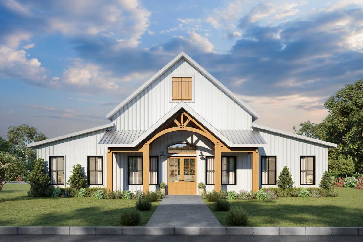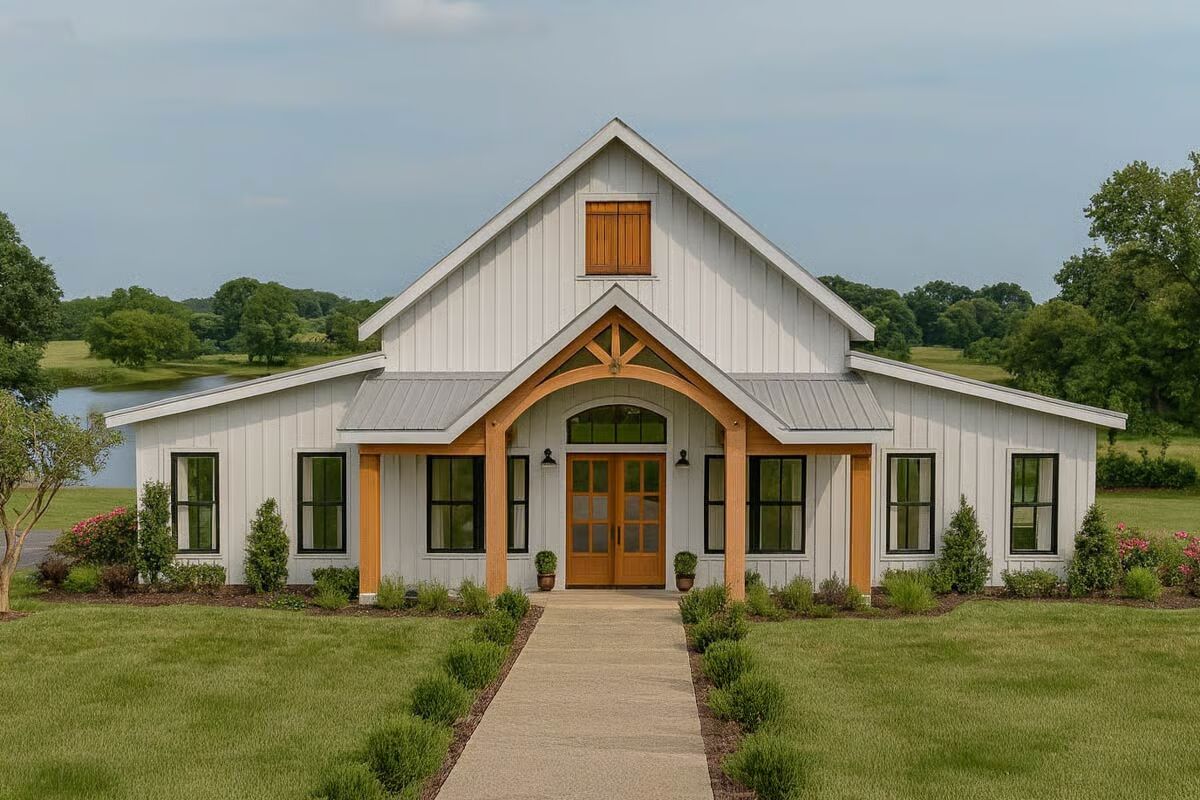 The grand Barndominium-style façade features a high gable roof and a warm, inviting wood-accented entrance.This striking Barndominium-style home is framed by a clear sky and lush greenery, highlighting its dramatic wood-arched entry.A beautiful perspective of the white, vertical-sided Barndominium-style home showcasing its long profile and welcoming front porch.The L-shaped Barndominium-style house offers a covered patio and is set against a serene waterscape with large natural rocks.This spacious open-concept area connects the airy living room with a cozy fireplace to the gourmet kitchen and dining space.The bright great room features a vaulted wood ceiling, exposed beams, and a magnificent fireplace feature wall.The expansive kitchen boasts a large dining table, a central island with seating, and a striking pot-rack chandelier.A perfect view of the open-plan kitchen, dining, and living areas with rustic wood floors and a stunning marble island.The sunlit laundry room offers a functional space with a long countertop, sink, and stylish framed botanical art.A cozy bedroom featuring a dark wood sleigh bed, an olive-green accent wall, and a rustic wreath above the headboard.A modern bathroom showcases a double vanity with a dark marble countertop and a clear view into the spacious tiled shower.The spa-like master bath features a freestanding soaking tub, a zero-entry shower with a bench, and sleek light-toned tilework.This serene bedroom is accented with warm olive-green walls, a planked wood ceiling, and a captivating triptych of horses.This full bathroom includes a double vanity with a dark countertop and a large mirror that reflects the bright natural light.An inviting bedroom with deep olive walls, a modern bed, and a comfortable armchair for a perfect reading nook.