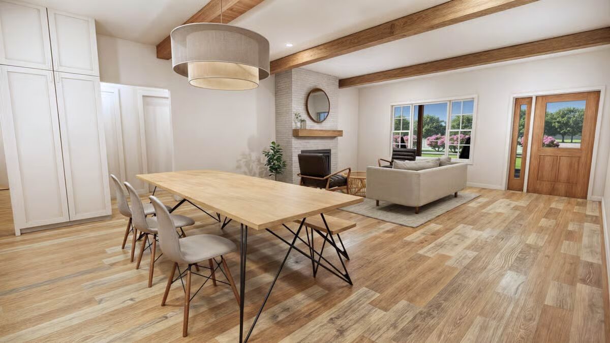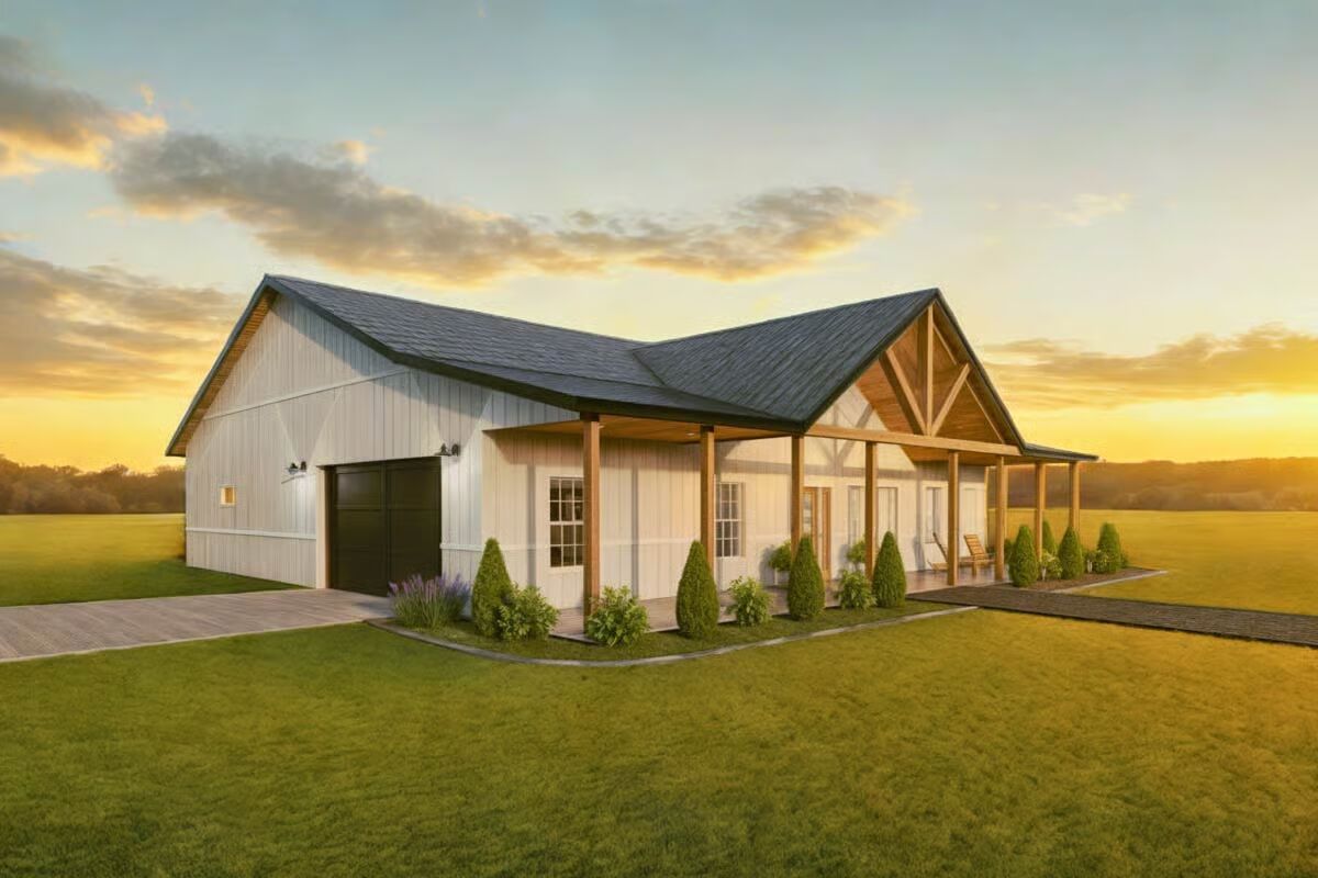 This barndominium-style home features a prominent gabled roof and a welcoming covered porch, blending rustic charm with modern design.A beautiful front view of a barndominium-style house showcasing its symmetrical design and expansive covered porch at sunset.The barndominium-style residence boasts a large attached garage and an inviting side porch, offering both utility and curb appeal.This view highlights the spacious rear porch of the barndominium-style home, perfect for outdoor relaxation and enjoying the natural surroundings.An open-concept living area seamlessly connects to the kitchen, featuring a cozy fireplace and warm wooden accents throughout.The modern kitchen and dining area are bright and inviting, with a large island, ample cabinetry, and direct access to the outdoors.A stylish dining table with bench seating takes center stage, complementing the contemporary kitchen with its large pendant light and exposed beams.The well-appointed kitchen features sleek stainless steel appliances, a spacious island with seating, and a view of the expansive backyard.This perspective captures the flow from the elegant dining space to the comfortable living room, anchored by a charming fireplace.A serene bedroom offers a comfortable retreat with a neutral color palette, natural light, and thoughtful decorative touches.
