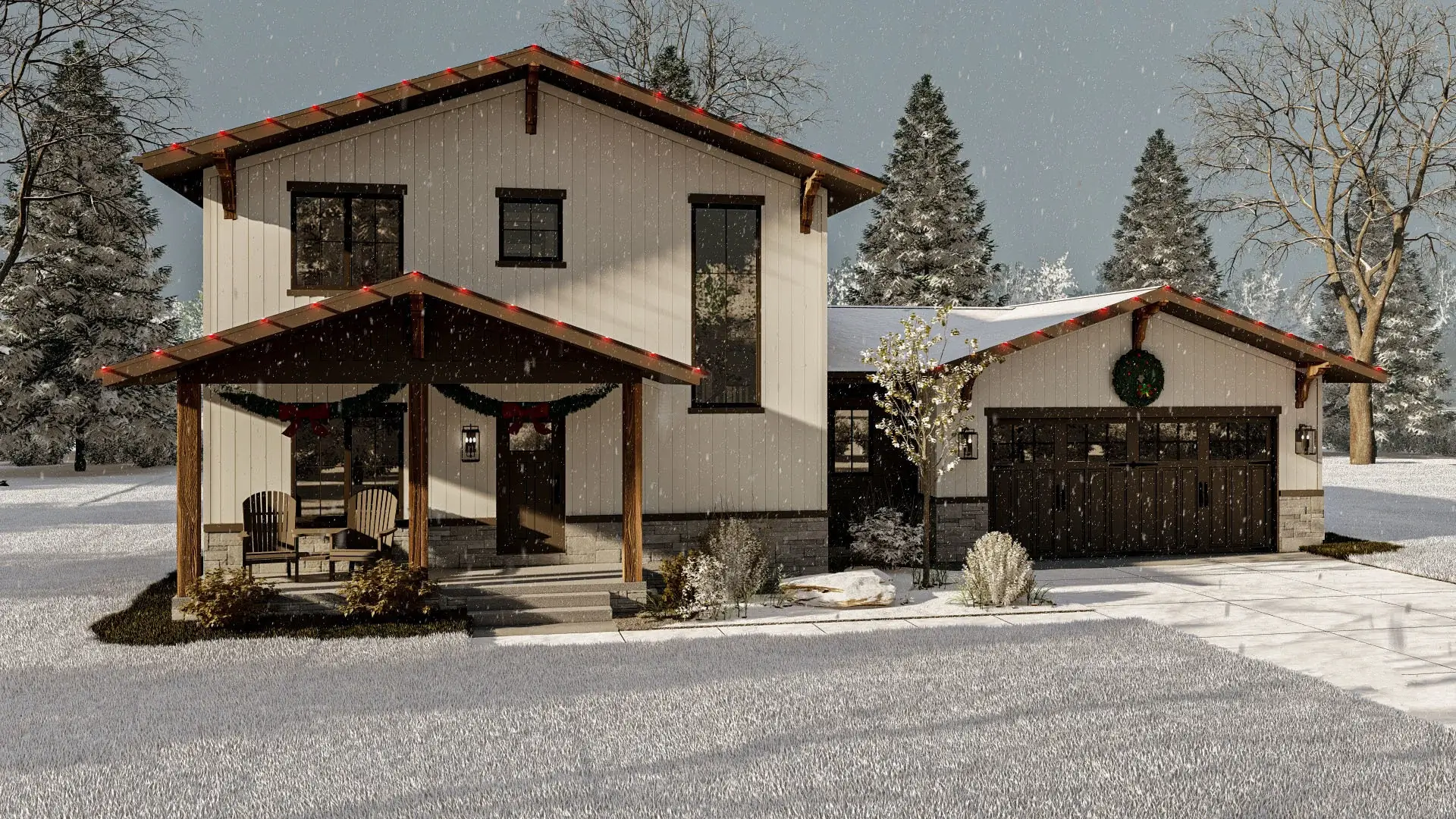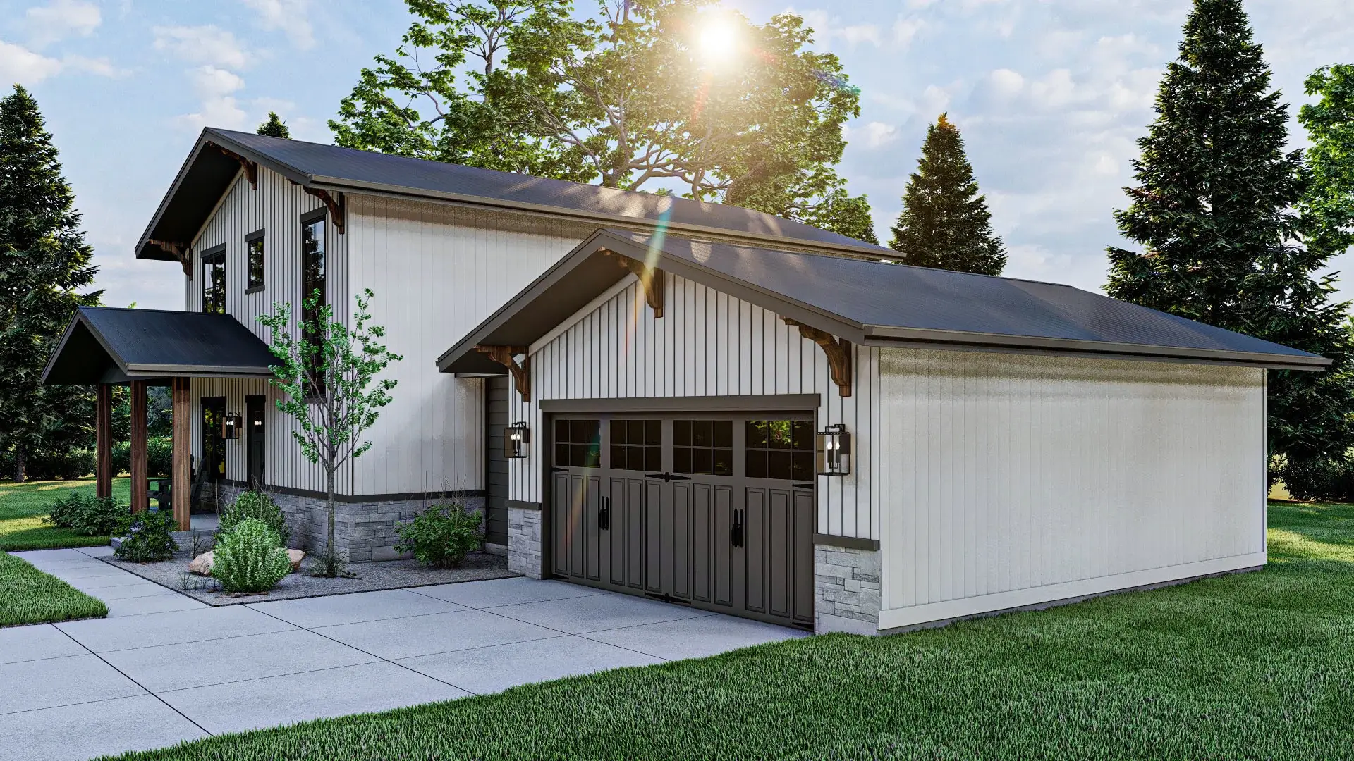 The two-car garage, robust and spacious, features a rear garage door for seamless lawn equipment access, encapsulating functionality with a touch of elegance.