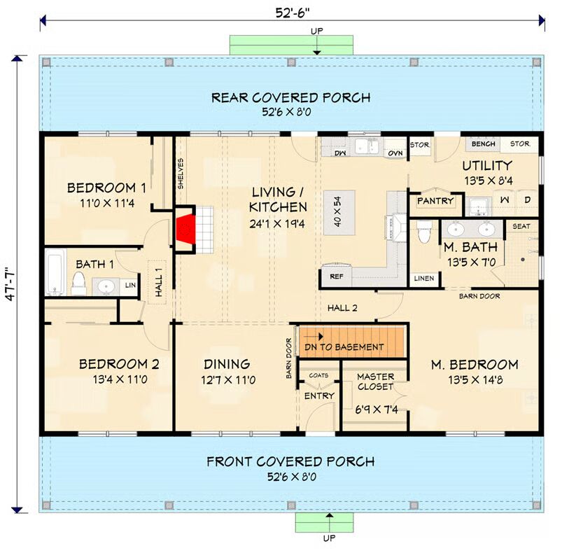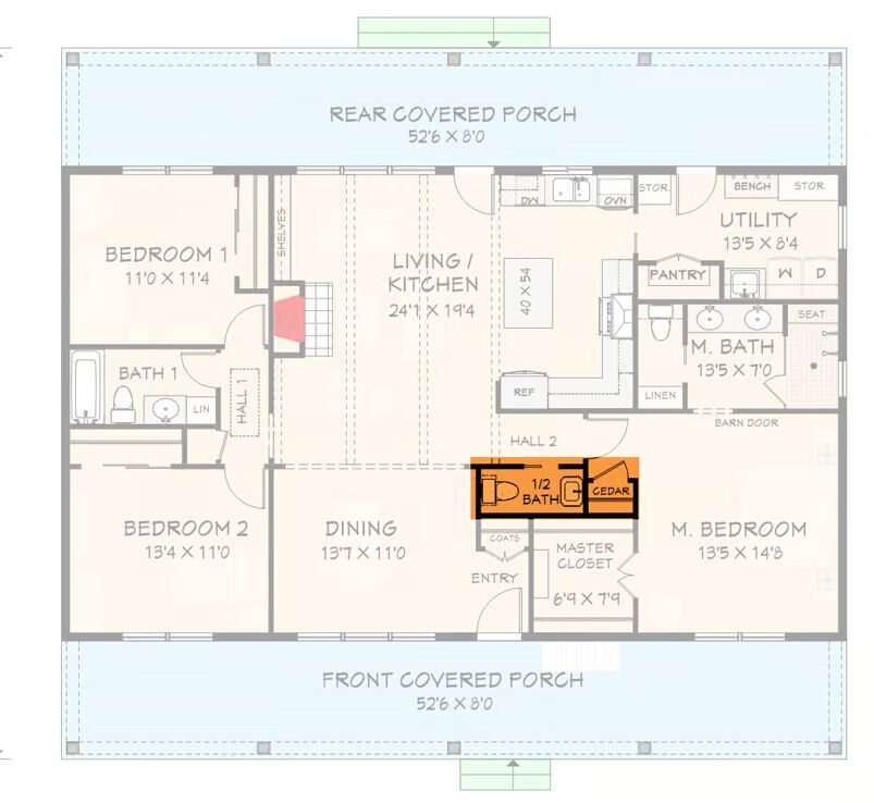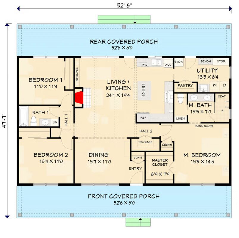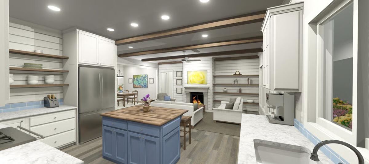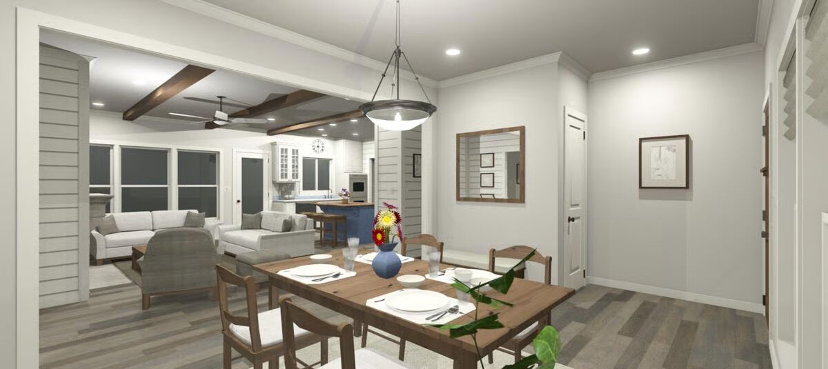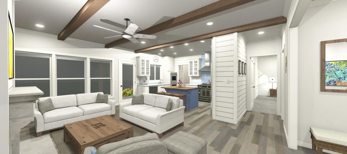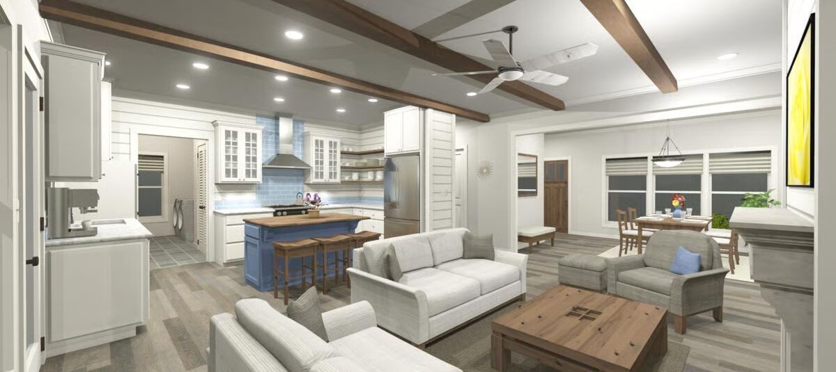 A pair of 8’-deep porches span the full width of the home, creating inviting outdoor living spaces at both the front and back. Inside, the design embraces simplicity with a bright open-concept layout, where the living room, dining area, and kitchen flow together seamlessly.