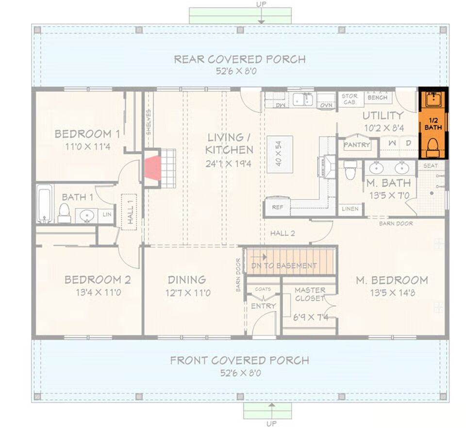 With its efficient footprint, modest square footage, and simple roofline, this home plan offers both style and economy. For added convenience, an optional powder room can be included for a central half-bath near the kitchen.