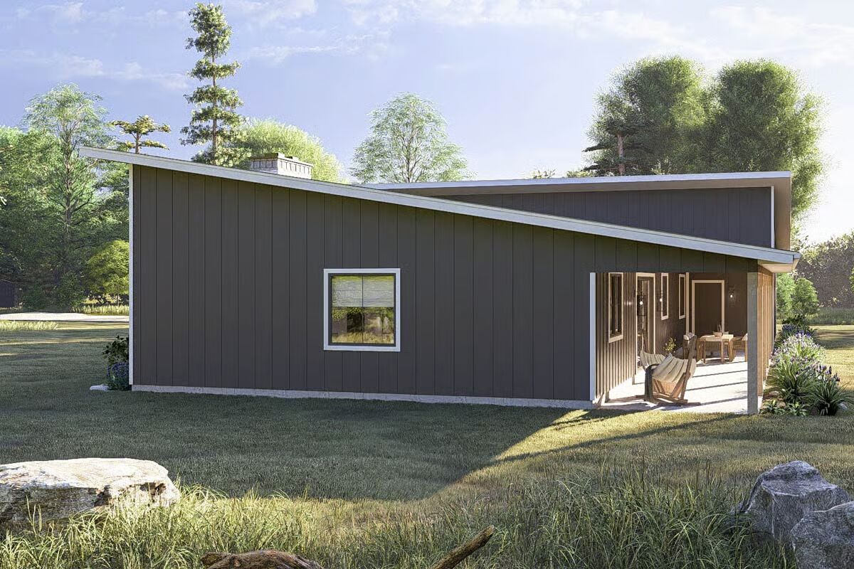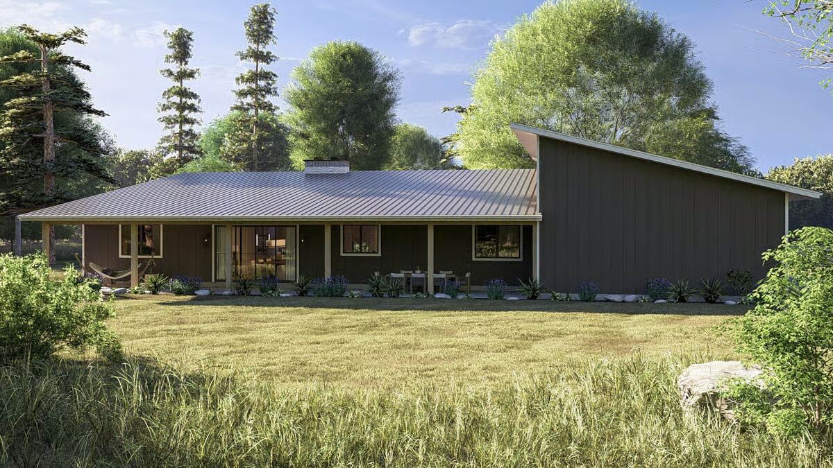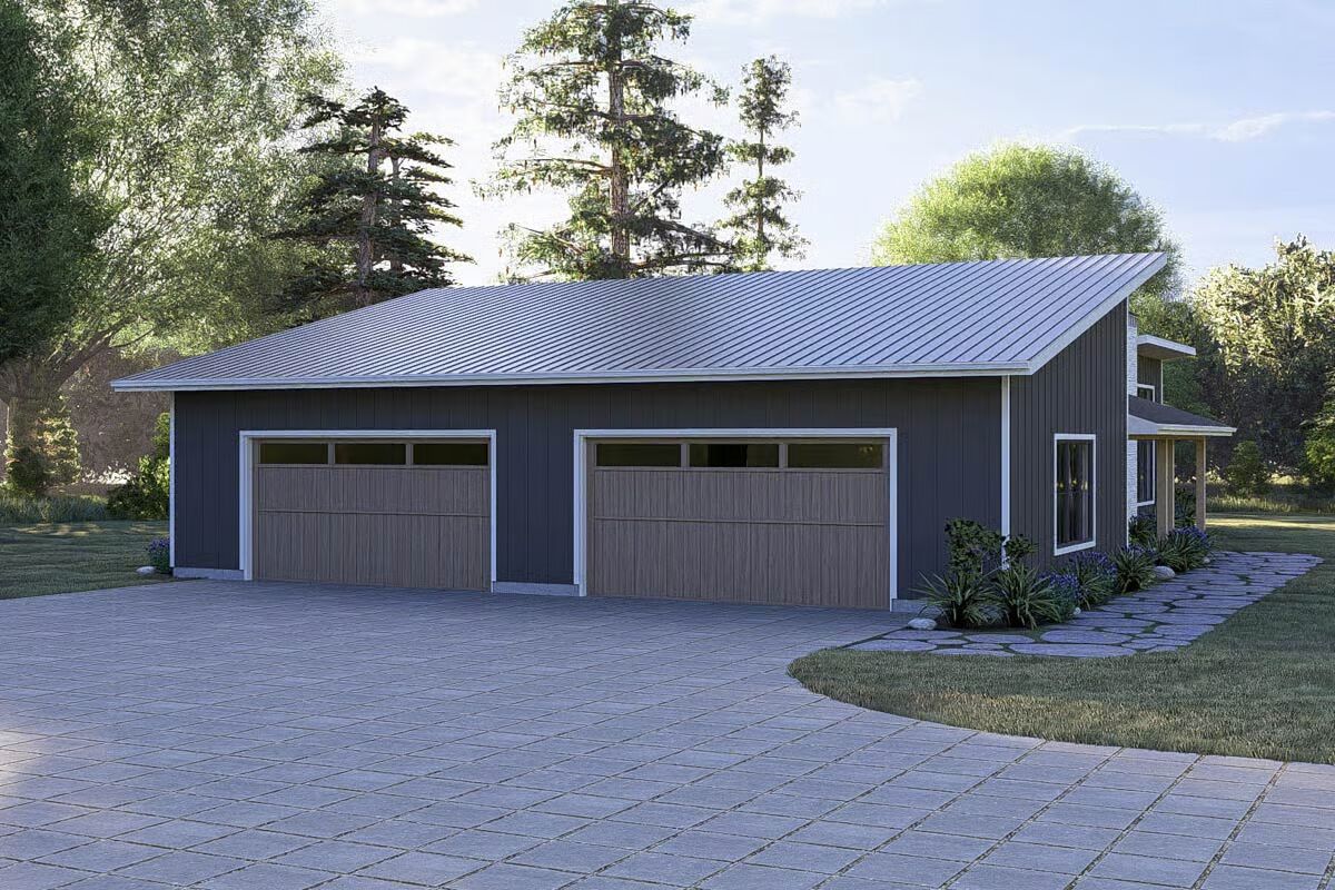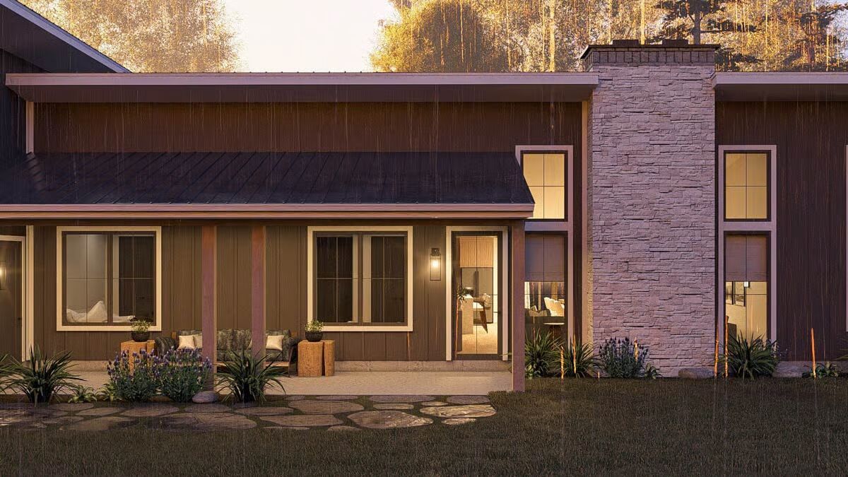 Introducing a striking 1,651 sq. ft. Contemporary Barndominium, showcasing 2 bedrooms, 2 full bathrooms, and an impressive 1,059 sq. ft. 3-car garage, all wrapped in a sleek exterior of dark vertical siding complemented by natural stone accents for exceptional curb appeal.