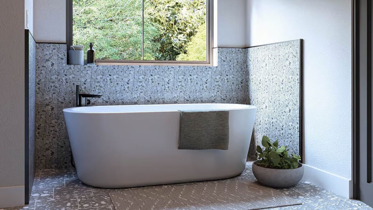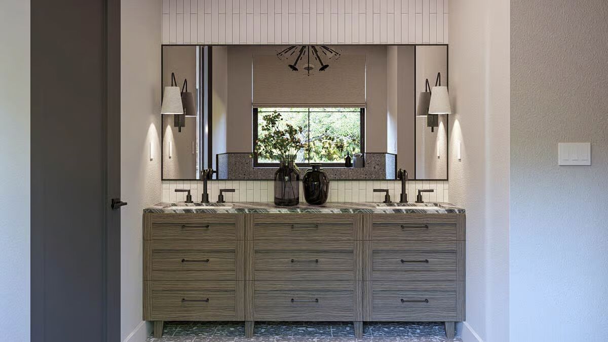 The striking modern Barndominium stands out with a dark facade, crisp white trim, and a stunning stacked stone chimney.A generously-sized, detached two-car garage features stylish wood-look doors and a clean, paved entryway.Long and low, the home features a sleek sloping roof and a covered porch that is perfect for enjoying the peaceful, grassy surroundings.The extended covered patio offers an ideal outdoor living space, complete with a hammock, surrounded by native landscaping.This clean, minimalist profile showcases the modern aesthetic of the board-and-batten-style siding and expansive windows.A cozy covered entryway is highlighted by the contrast between the dark siding and the prominent natural stone chimney feature.The living room boasts a dramatic floor-to-ceiling stone fireplace flanked by large windows that fill the space with natural light.This view captures the open-concept flow between the cozy living area and the contemporary, wood-toned kitchen cabinetry.The central kitchen island serves as a sleek focal point with its crisp white countertop and comfortable counter-height bar seating.A substantial wooden dining table is beautifully illuminated by a striking linear chandelier, perfect for entertaining.This wide shot showcases the seamless transition from the living area to the dining space, all anchored by warm hardwood flooring.The primary bedroom is a peaceful retreat featuring a stunning nature-inspired mural and a large window overlooking the lush exterior.A stylish double vanity with a wood grain finish, marble countertop, and chic wall sconces offers a touch of refined elegance.Double built-in ovens and a unique gray mosaic backsplash define this functional and stylish cooking prep area.Relax in the deep, free-standing soaking tub, set against a backdrop of eye-catching patterned tile and a verdant window view.