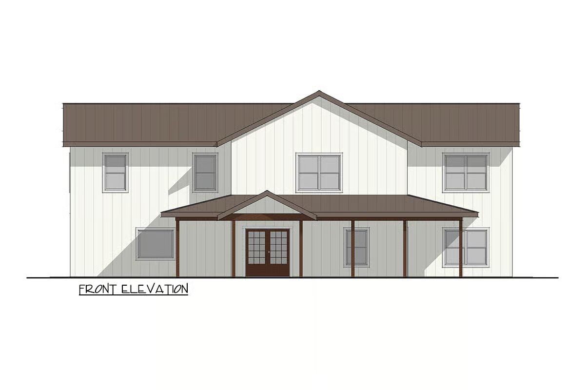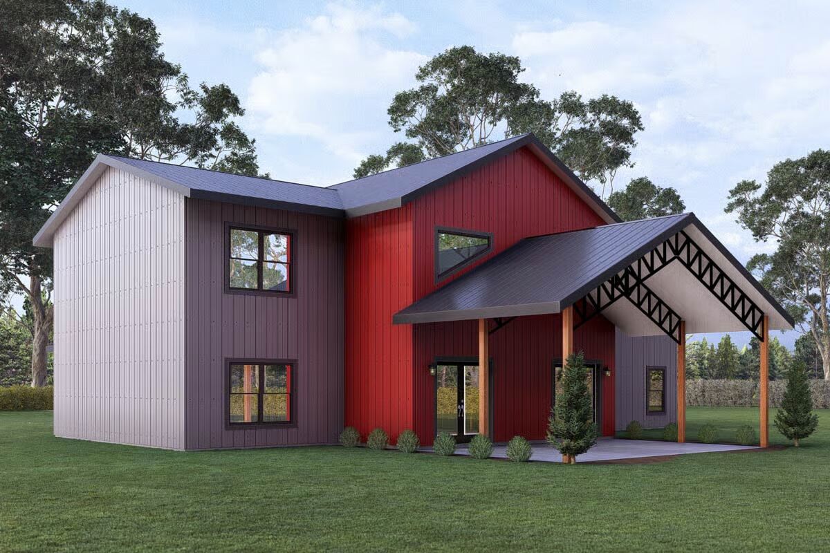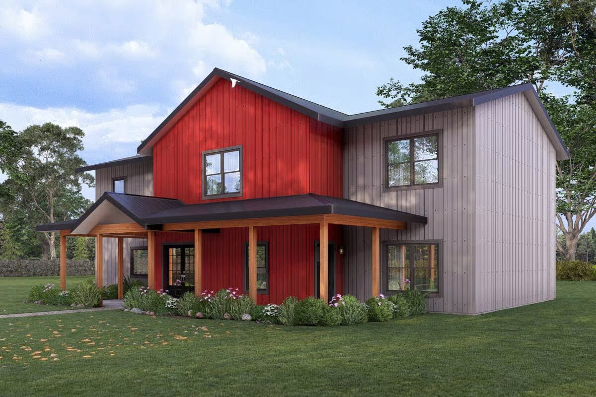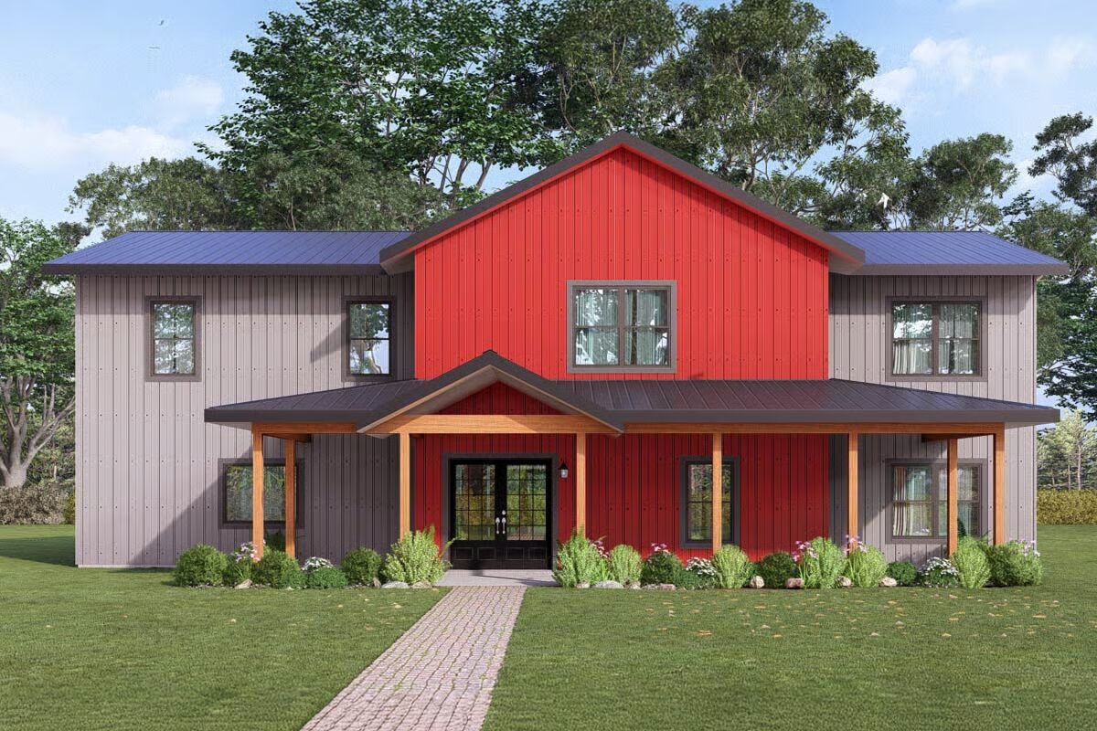 Showcasing a striking modern rustic aesthetic, this impressive 3,003 sq. ft. Barndominium-style residence features bold red and gray vertical metal siding and an expansive 423 sq. ft. covered front porch that sets the tone for warm, inviting living.