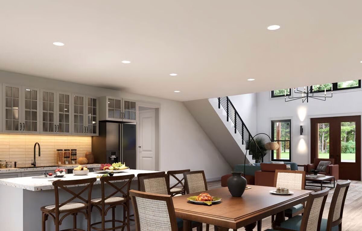 The Great Room flows seamlessly into the dining area and a beautifully designed kitchen, highlighted by a spacious island and convenient access to the rear porch—perfect for outdoor dining and entertaining.