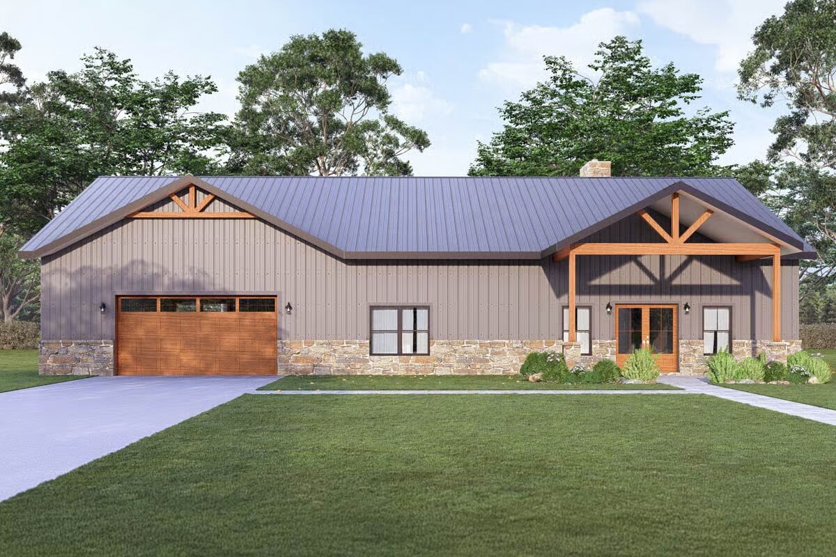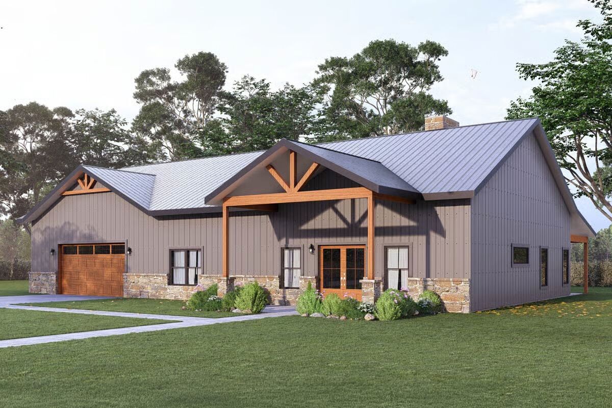 Discover modern farmhouse charm blended with practical design in this 1,841 sq. ft. Barndominium, offering 3 bedrooms, 2 full bathrooms, and an expansive 1,197 sq. ft. attached 3-car garage.