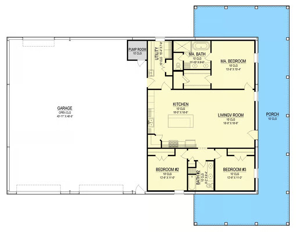 Welcome to the gallery of photos for the Modern Barndominium House with Workshop and Wrap-Around Porch. The floor plan is shown below: