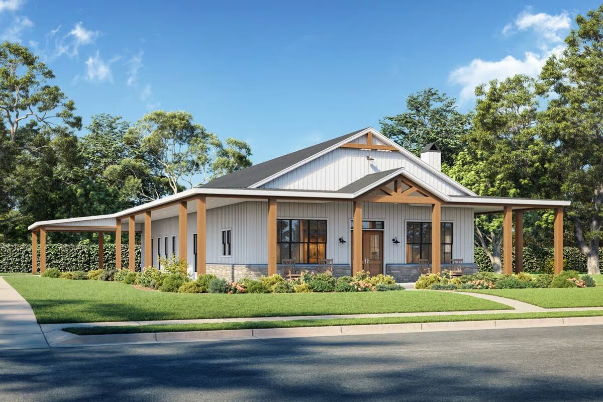 This 2,994 sq. ft. modern farmhouse barndominium blends timeless charm with contemporary comfort, offering 3 bedrooms, 3 full bathrooms, and a 638 sq. ft. side-entry two-car carport, all wrapped in an attractive mix of metal and stone for standout curb appeal.
