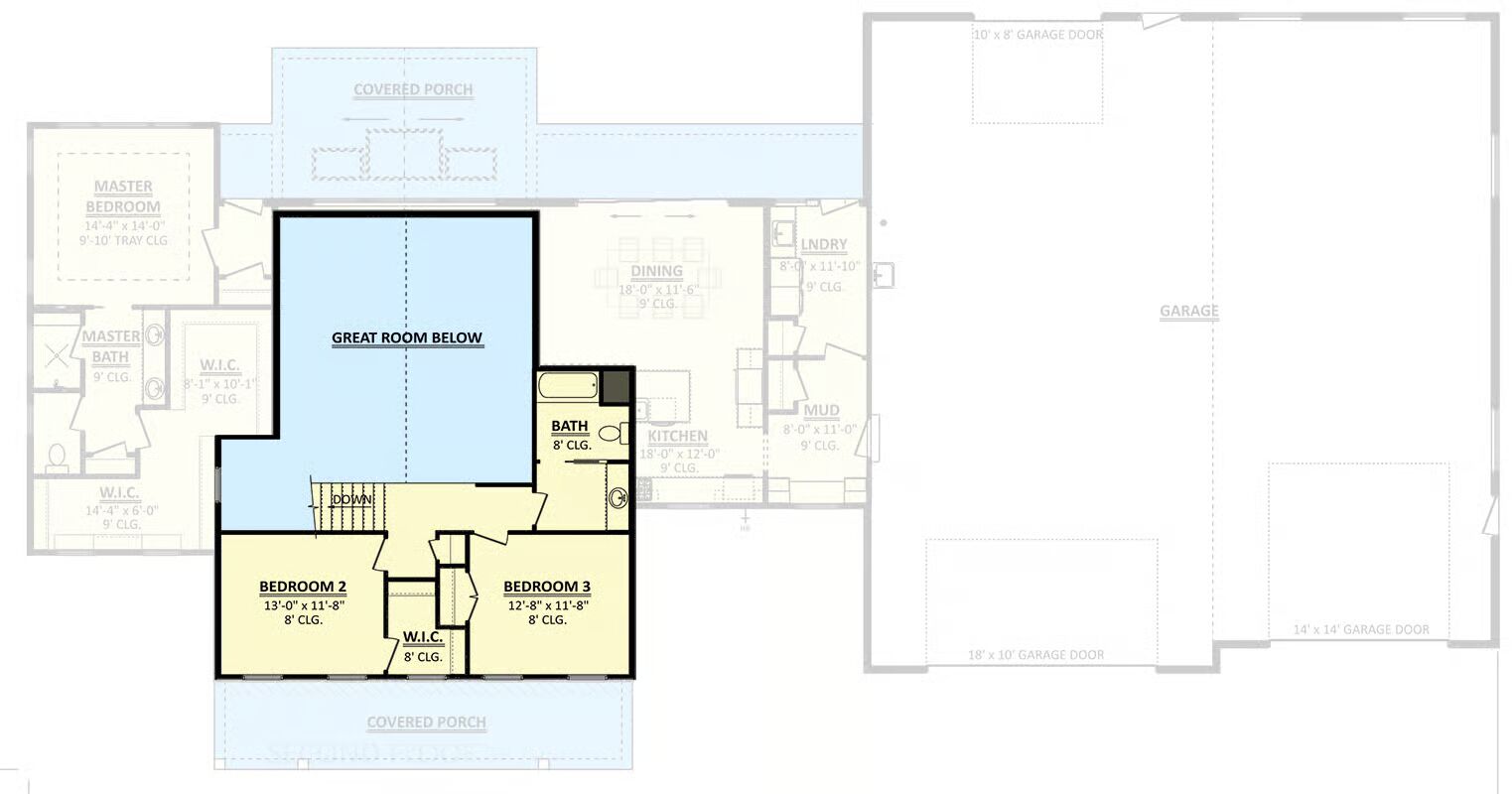 The expansive garage is designed for versatility, boasting an RV bay with a 14′ x 14′ overhead door, a double bay with an 18′ x 10′ door, and a rear-entry bay (10′ x 8′)—perfect for a workshop, hobby area, or recreational vehicle storage.
