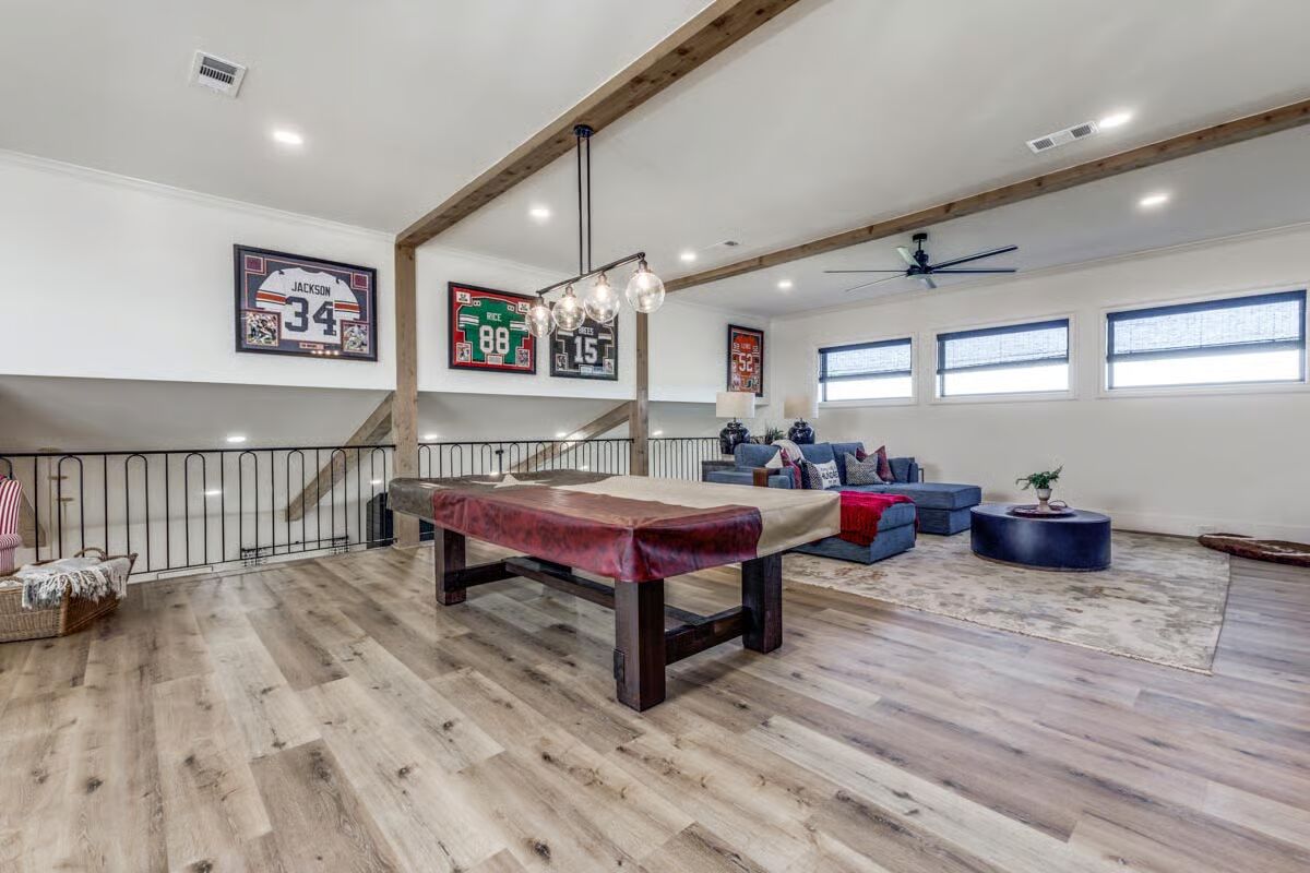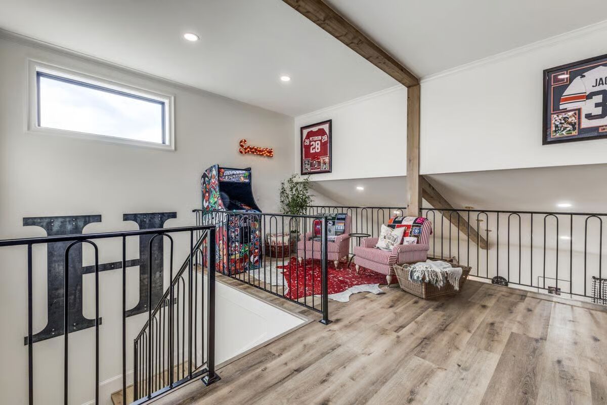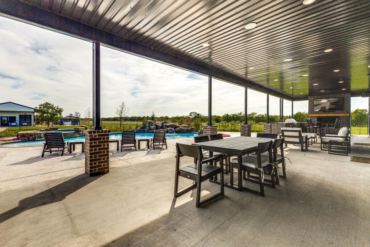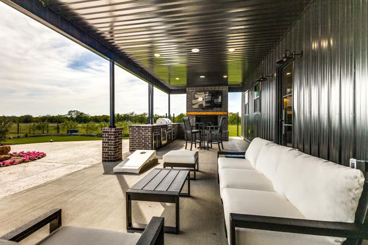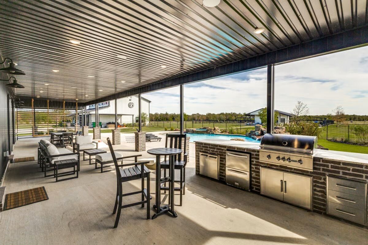 Buy This PlanA welcoming aerial view showcases the modern dark-metal barndominium with its charming covered front porch and expansive green lawn.The ultimate outdoor oasis, this barndominium has a sprawling pool, a hot tub, and a vast covered patio perfect for entertaining guests.This striking barndominium features sleek dark siding and a prominent entryway with a deep covered porch set against a big sky.The gourmet kitchen anchors the open main floor with a massive island, dark cabinetry, and striking light fixtures under the loft space.An arcade game and charming striped armchairs create a fun and cozy reading nook within the bright, airy loft area.Game on! This loft serves as an ultimate man cave with a pool table, comfy seating, and framed sports jerseys adorning the walls.The grand entertainment loft features a large sectional sofa, a dedicated bar area, and exposed wood beams for a rustic-modern feel.The modern master bathroom boasts a dark wood vanity, a marble countertop, and a walk-in shower with vertical subway tile.The spacious covered patio offers a large outdoor dining area and a separate seating spot, all overlooking the beautiful pool.Relax and gather in this stylish covered patio featuring a brick fireplace/grill area, comfortable white seating, and a lush country view.A chef’s dream, the covered patio provides a full outdoor kitchen, ample seating, and a clear view of the sparkling pool and backyard.