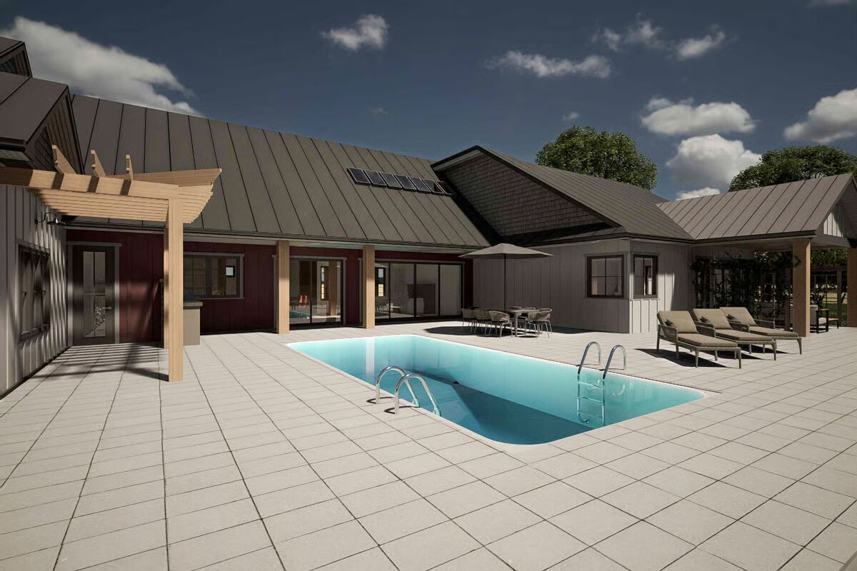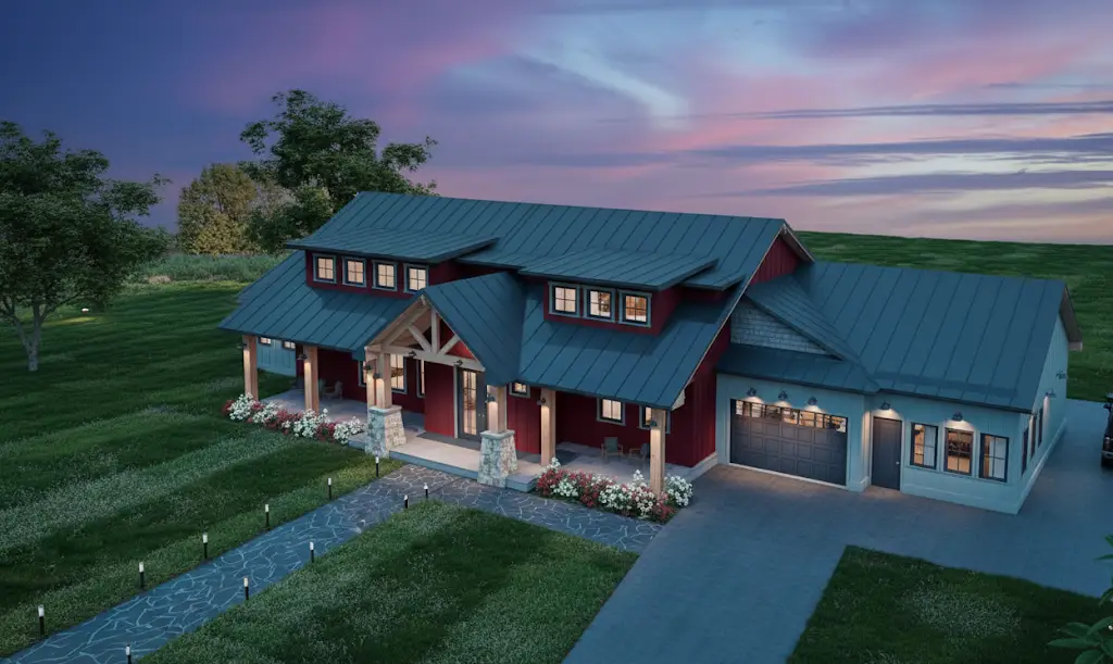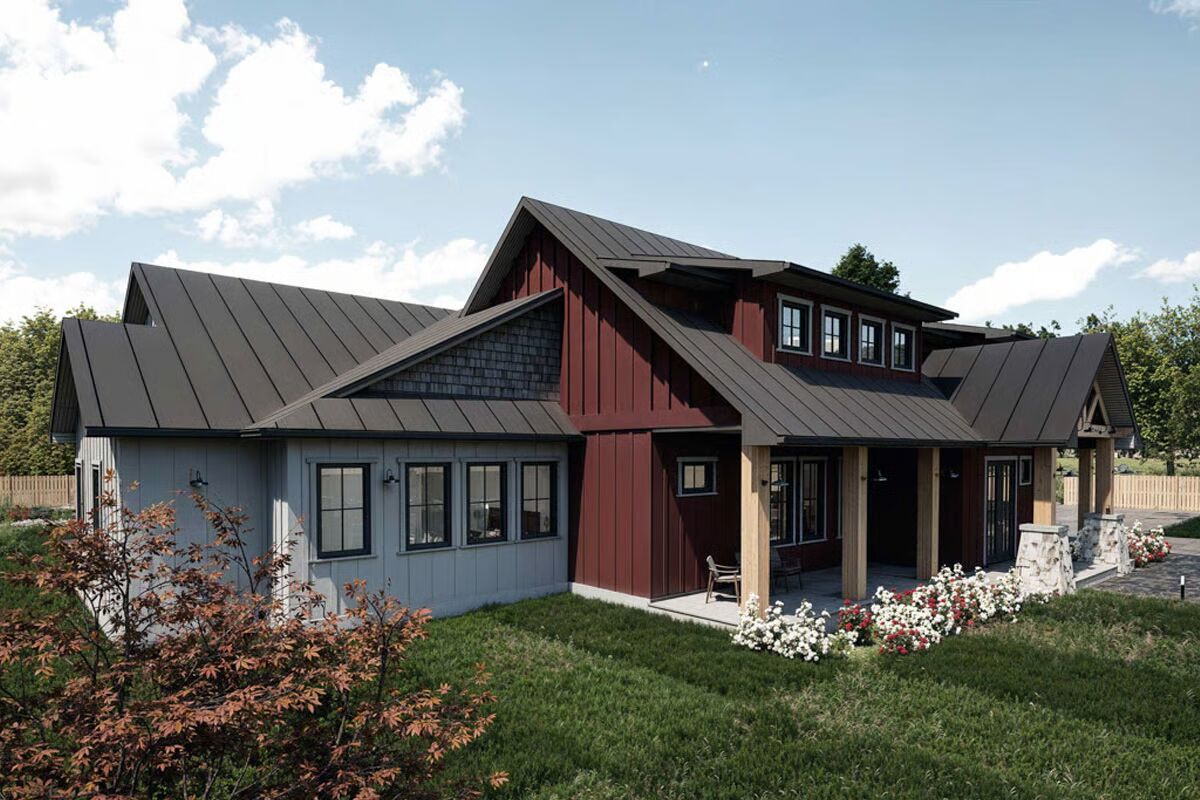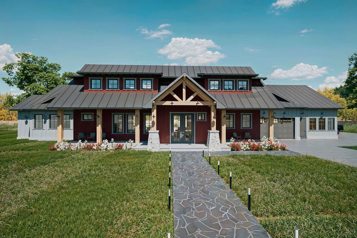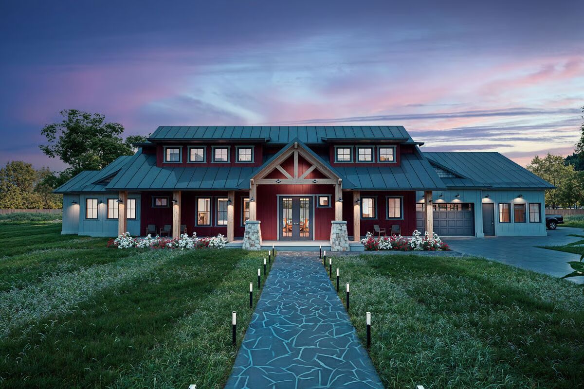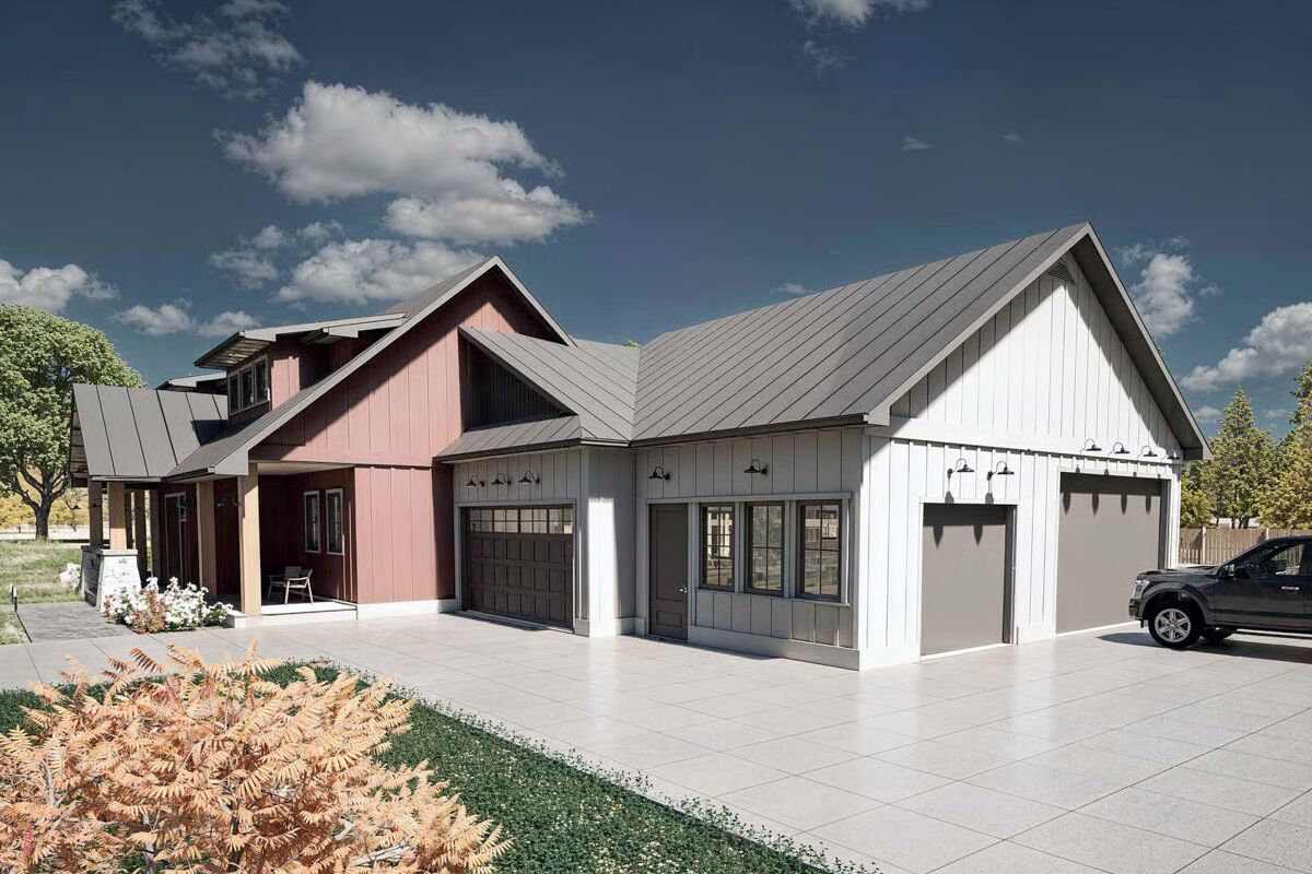 Step into 3,111 sq. ft. of thoughtfully designed living with this New American barndominium plan, offering 3 bedrooms, 4.5 bathrooms, and an expansive 1,435 sq. ft. garage with room for up to 5 vehicles.