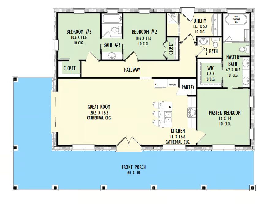 Welcome to the gallery of photos for the One-Level Barndominium Style House with 10′ Deep Wraparound Porch. The floor plan is shown below: