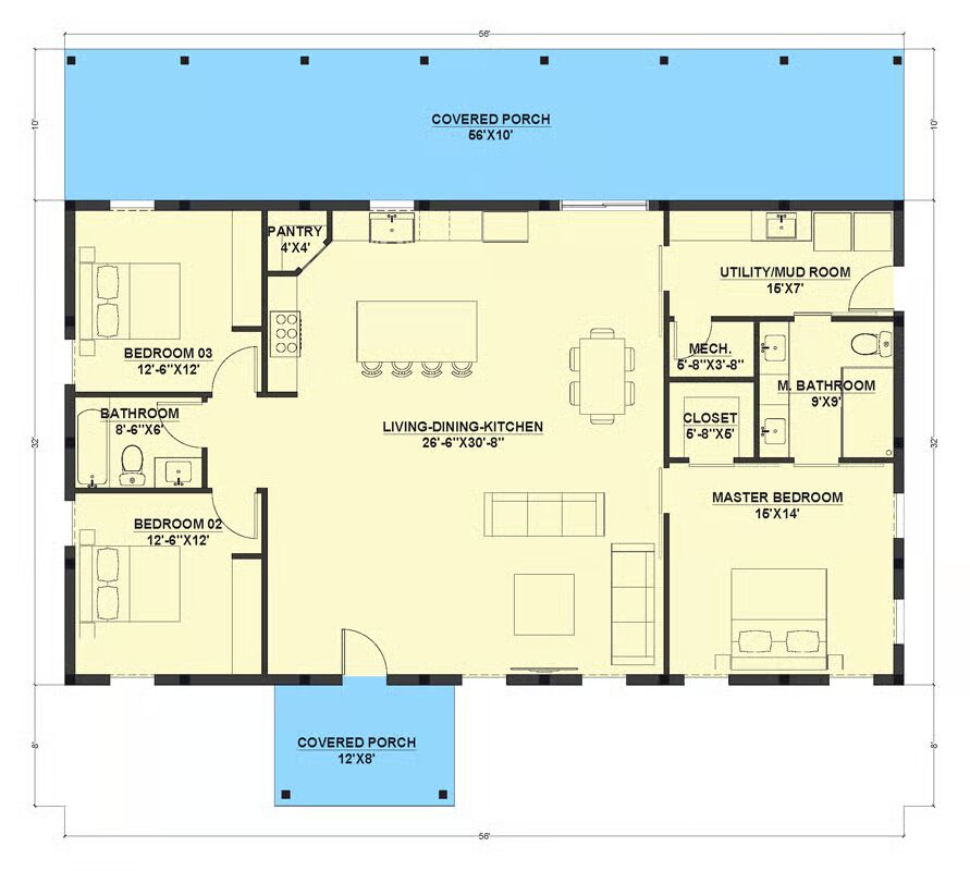 This 32′ x 56′ Post-Frame/Pole Barn home plan combines traditional charm with modern efficiency, offering 1,792 sq. ft. of heated living space with 3 bedrooms and 2 baths. Designed with value and comfort in mind, this home delivers both functionality and style.