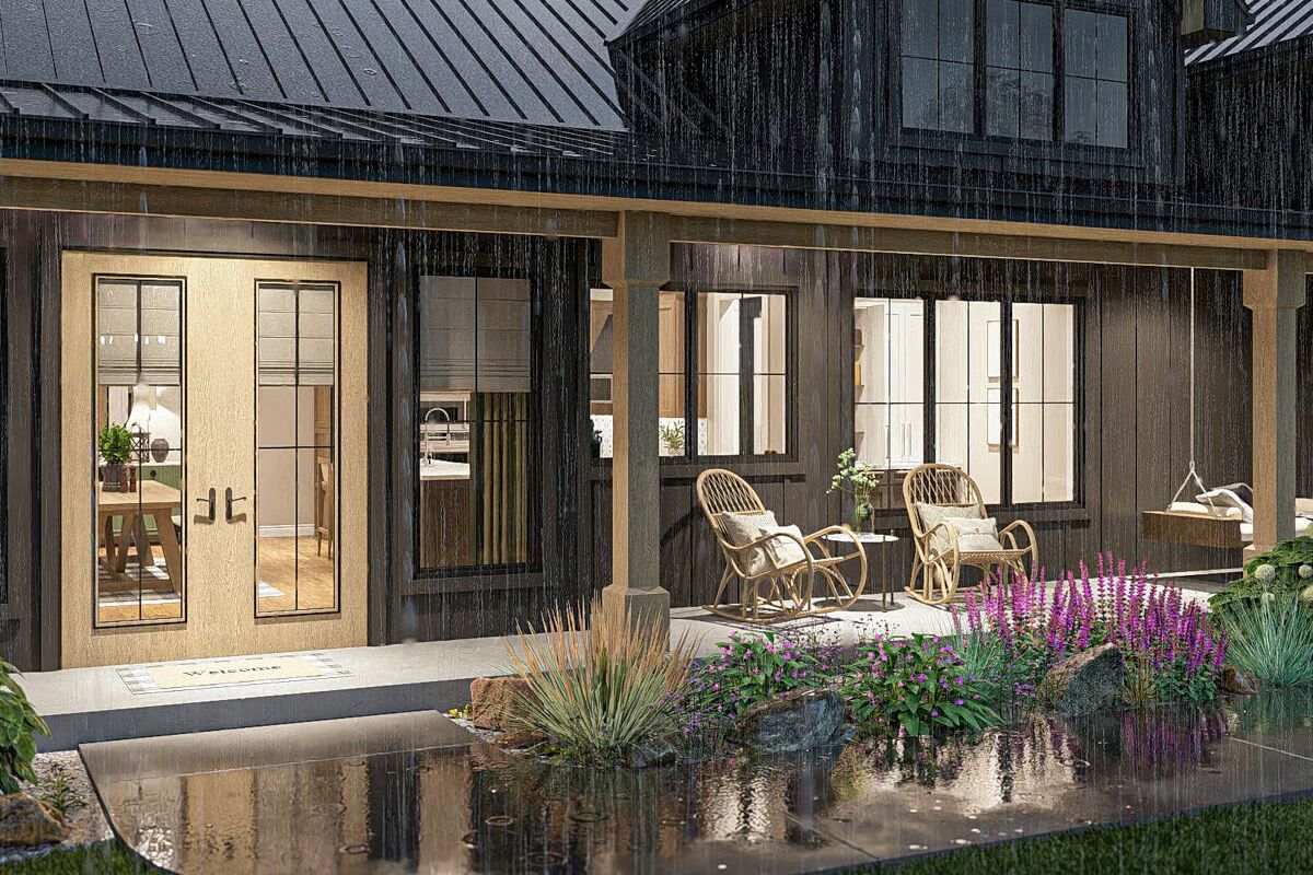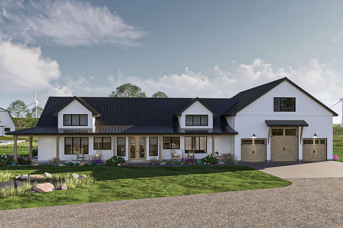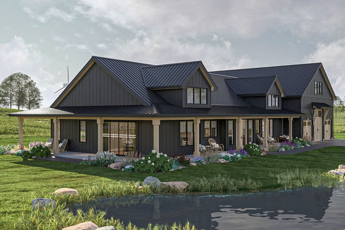 Blending rustic charm with modern functionality, this single-story barndominium features board-and-batten siding, wood accents, and a durable steel roof. A wide wraparound porch invites you to enjoy outdoor living in style.