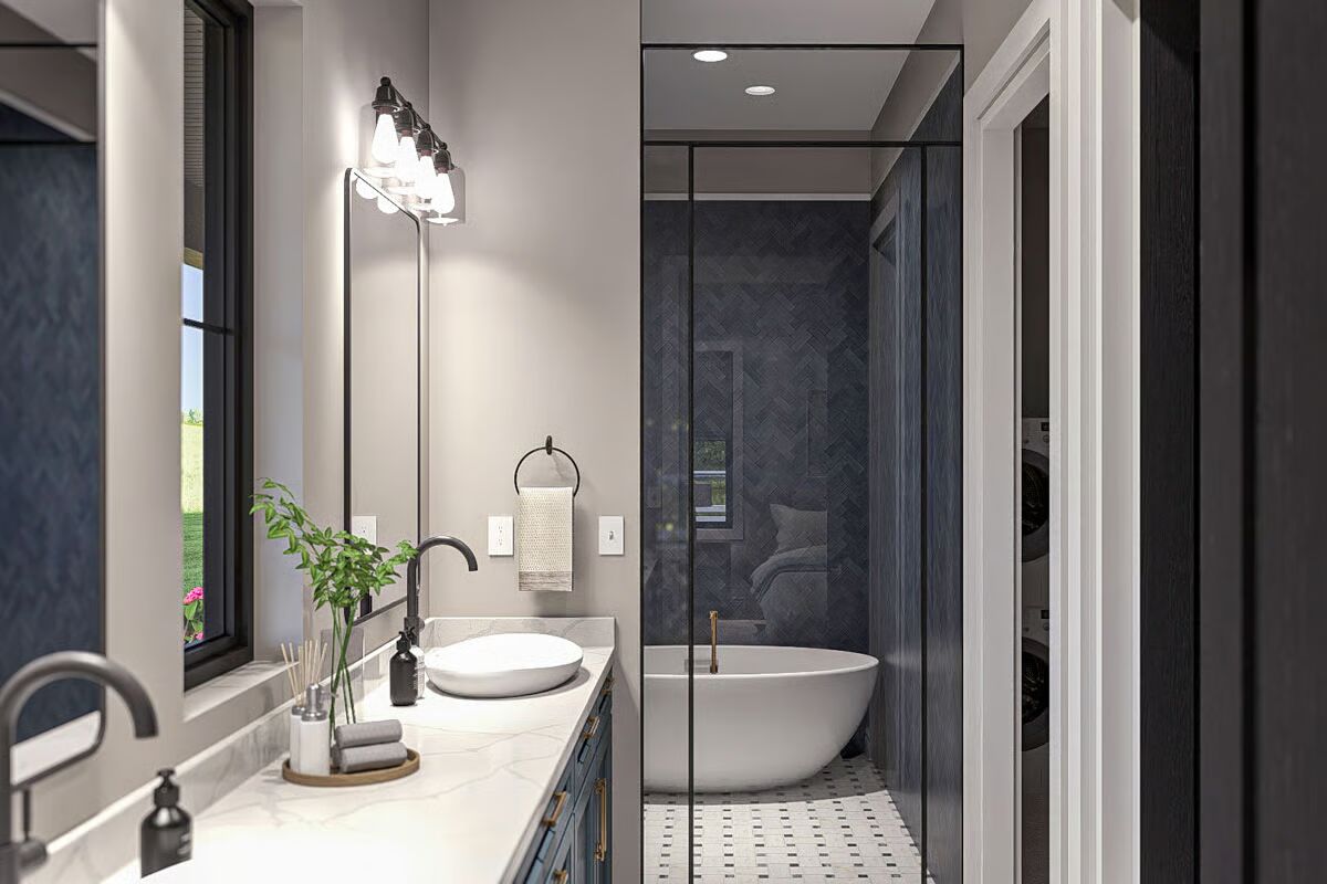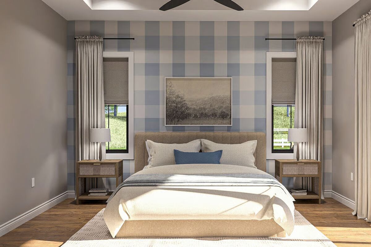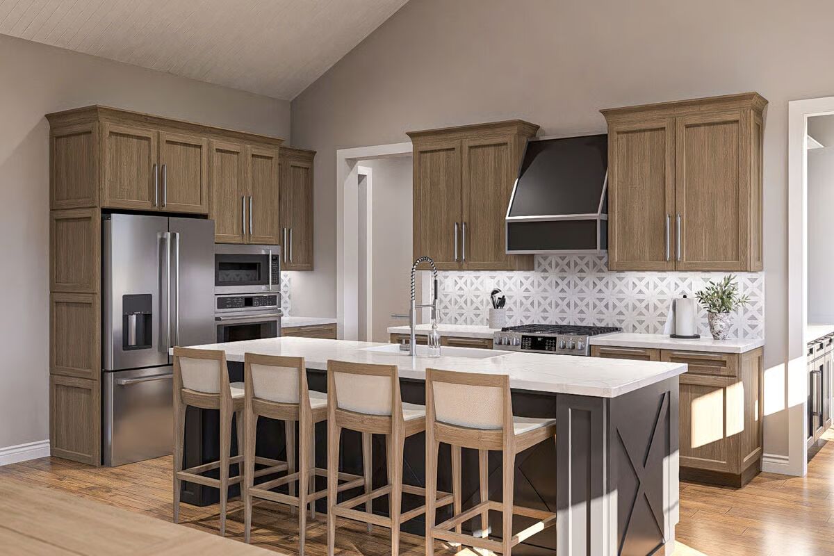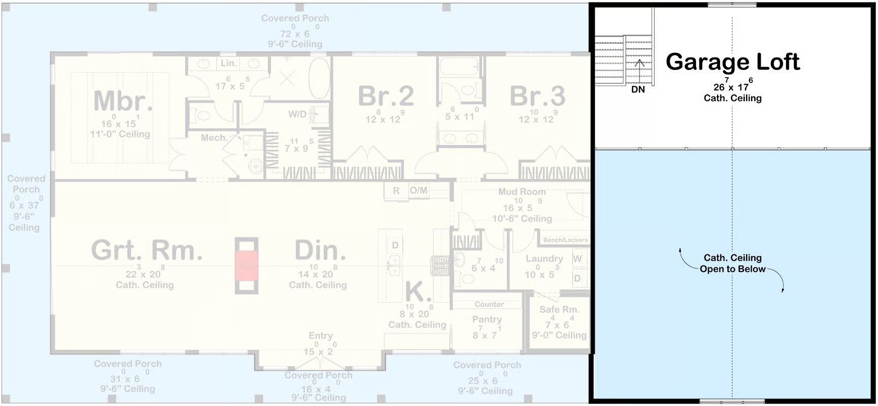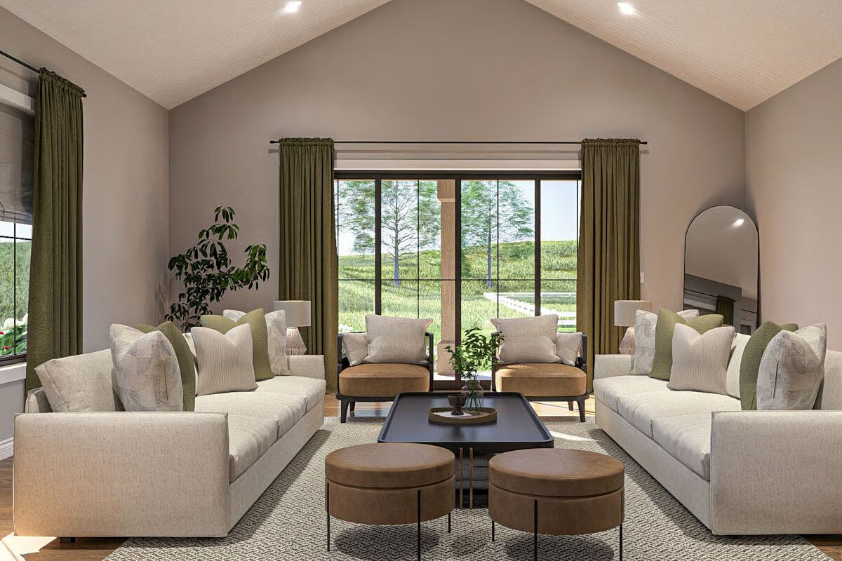 Three bedrooms complete the layout, including a spacious master suite and a dedicated safe room for added peace of mind. Built with conventional wood framing and sturdy 2×6 exterior walls, this plan combines lasting durability with timeless appeal.