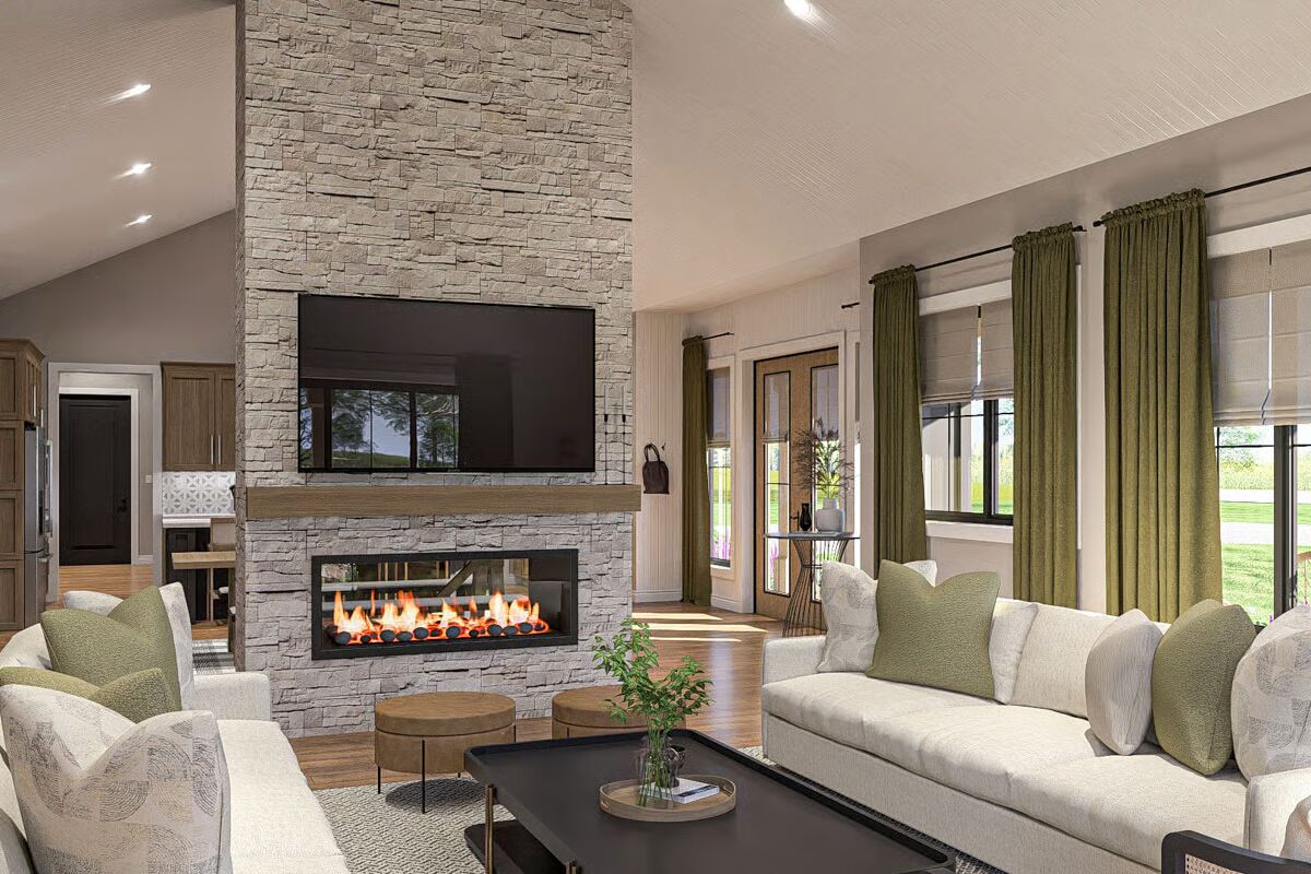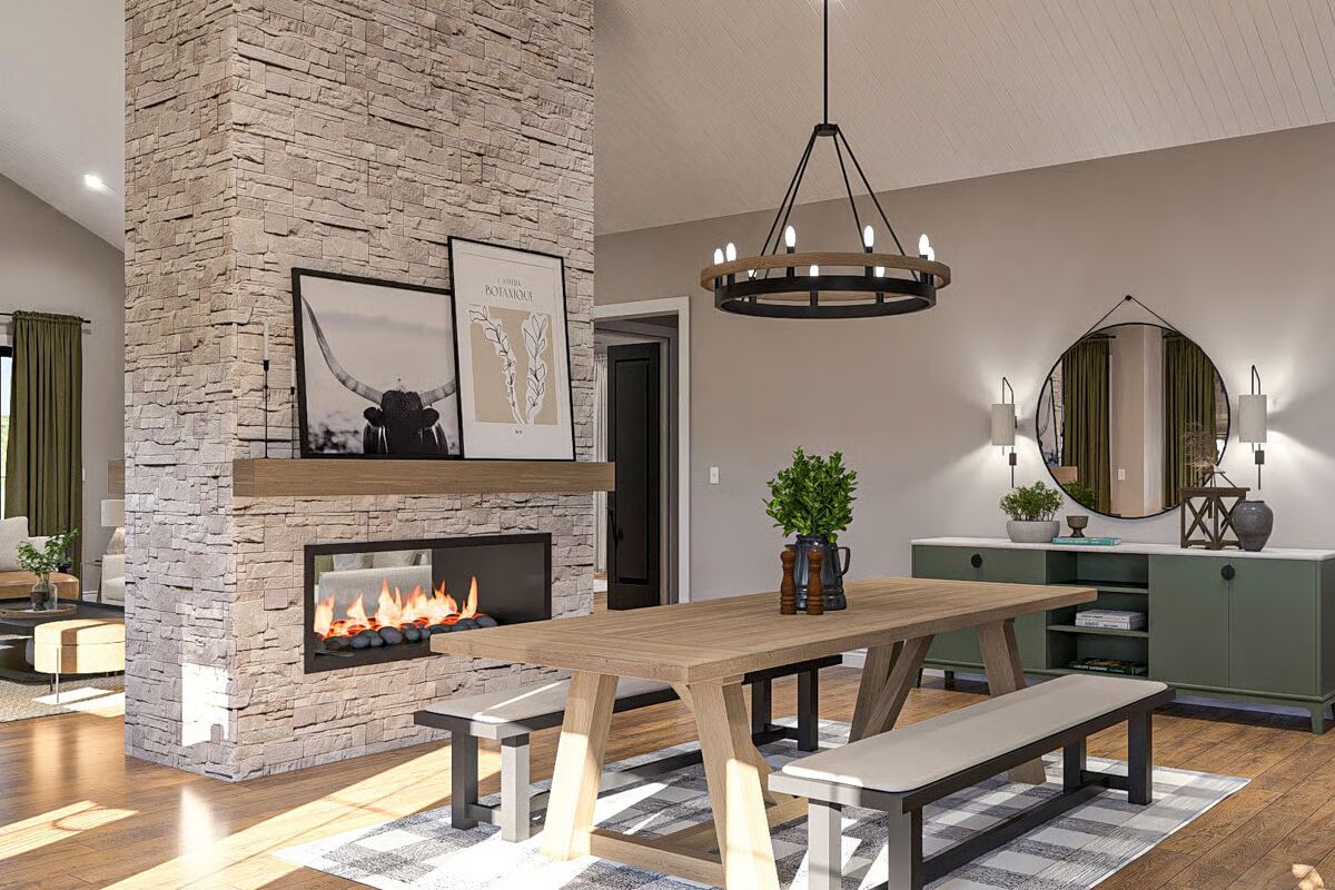 Inside, the open-concept kitchen, dining room, and great room sit beneath a soaring cathedral ceiling. A dual-sided fireplace adds warmth and ambiance, serving both the living and dining areas.