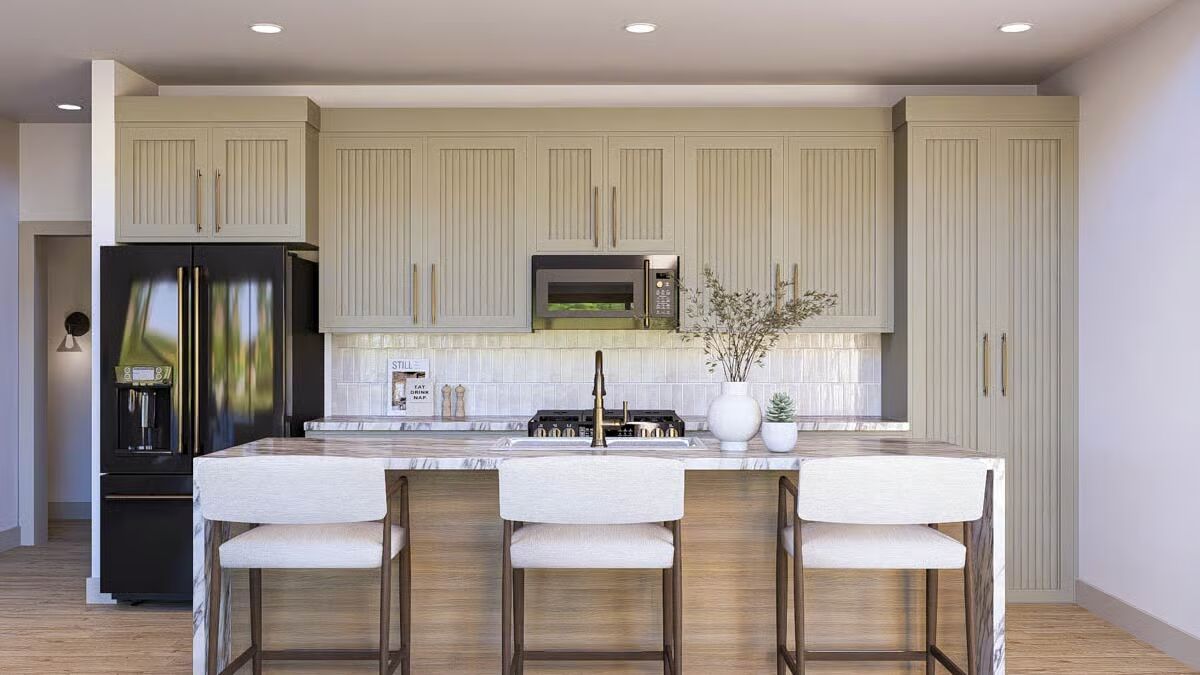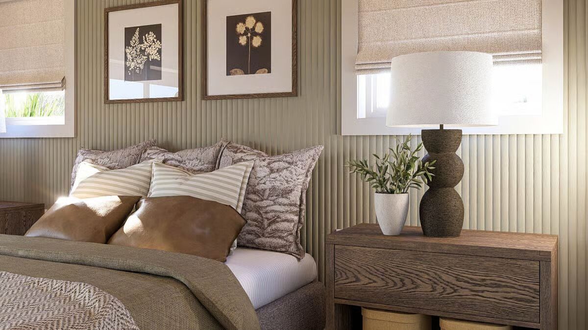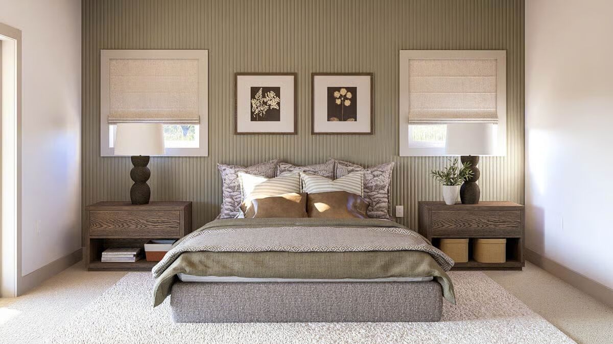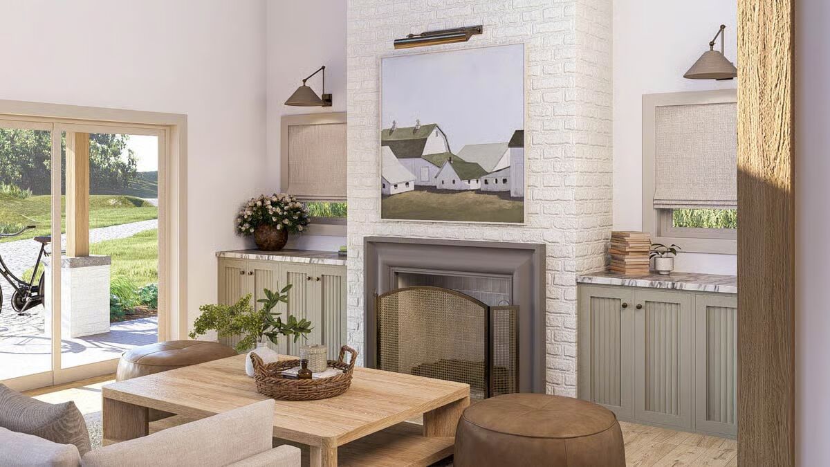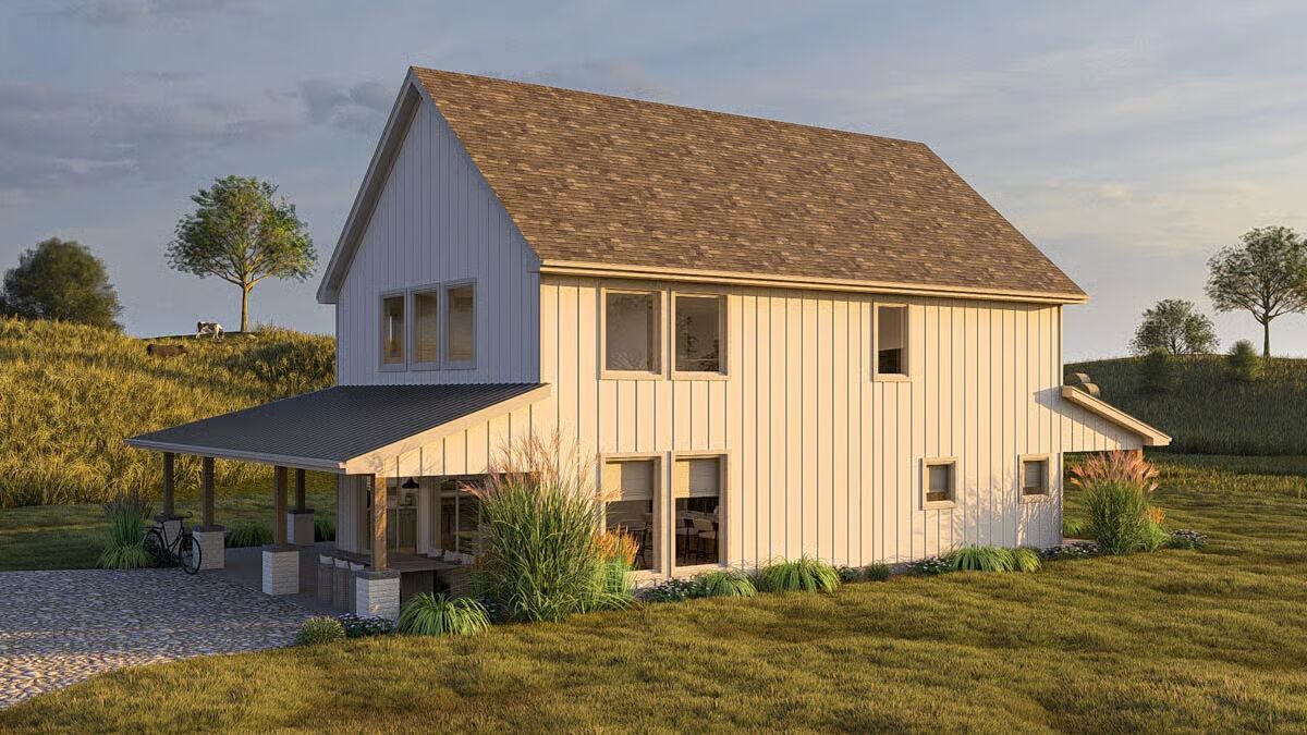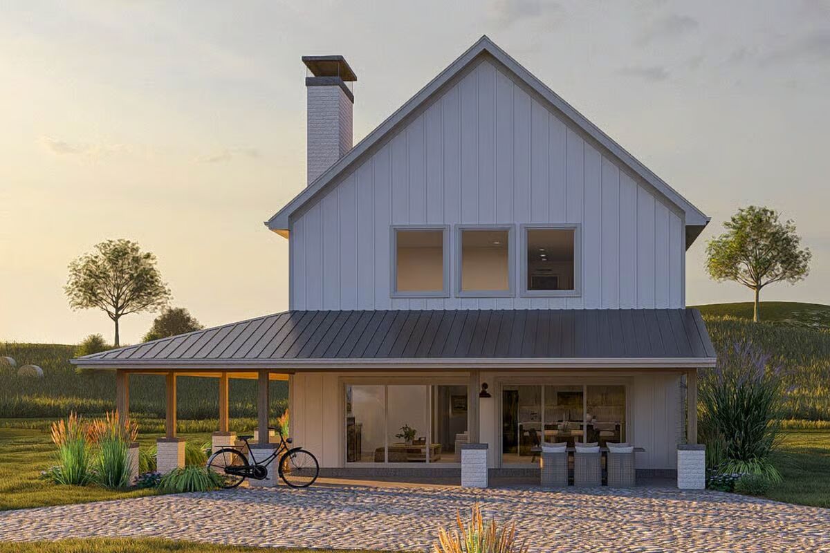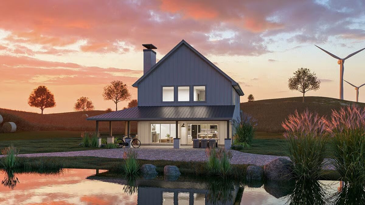 The inviting front view of the barndominium, showcasing large sliding doors and a cozy outdoor seating area.This modern barndominium-style home features a spacious, shaded wraparound porch, perfect for relaxing at sunset.A classic board-and-batten barndominium design with a welcoming covered entry and an expansive upper level.The ultimate country retreat: a barndominium-style house featuring a prominent brick chimney and a deep covered porch.A stunning barndominium silhouette reflected in a pond at sunset, with vast open fields and wind turbines in the distance.A bright dining area with a rustic wooden table, striking black spindle chairs, and sunlit views of the meadow.The open-concept kitchen and dining area features sleek sage green cabinetry and a light wood dining table.A close-up of the modern kitchen island, highlighting the veined marble countertop and chic white counter stools.Contemporary kitchen design featuring textured sage green cabinets, brass hardware, and a stylish subway tile backsplash.A view from the living room showcasing a comfortable light sofa and the seamless transition to the adjacent kitchen space.The cozy living room fireplace with a white painted brick hearth and sliding doors that open to the patio.A symmetrical and charming vignette featuring the fireplace, built-in cabinets, and barn-themed wall art.The tranquil bedroom features a textured sage accent wall, dark wood nightstands, and soft, layered bedding.A close-up of the bedside area, showcasing a sculptural lamp and framed botanical prints against the fluted accent wall.A well-appointed bathroom featuring a double vanity with a louvered cabinet and a large mirror framed by contemporary lighting.