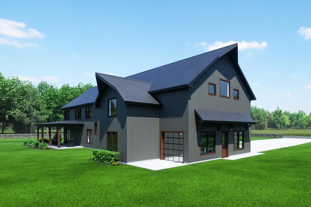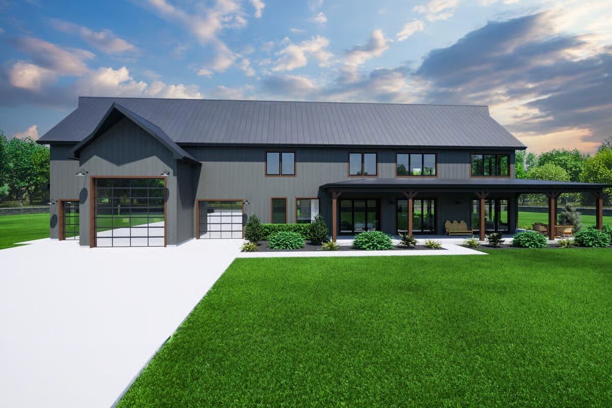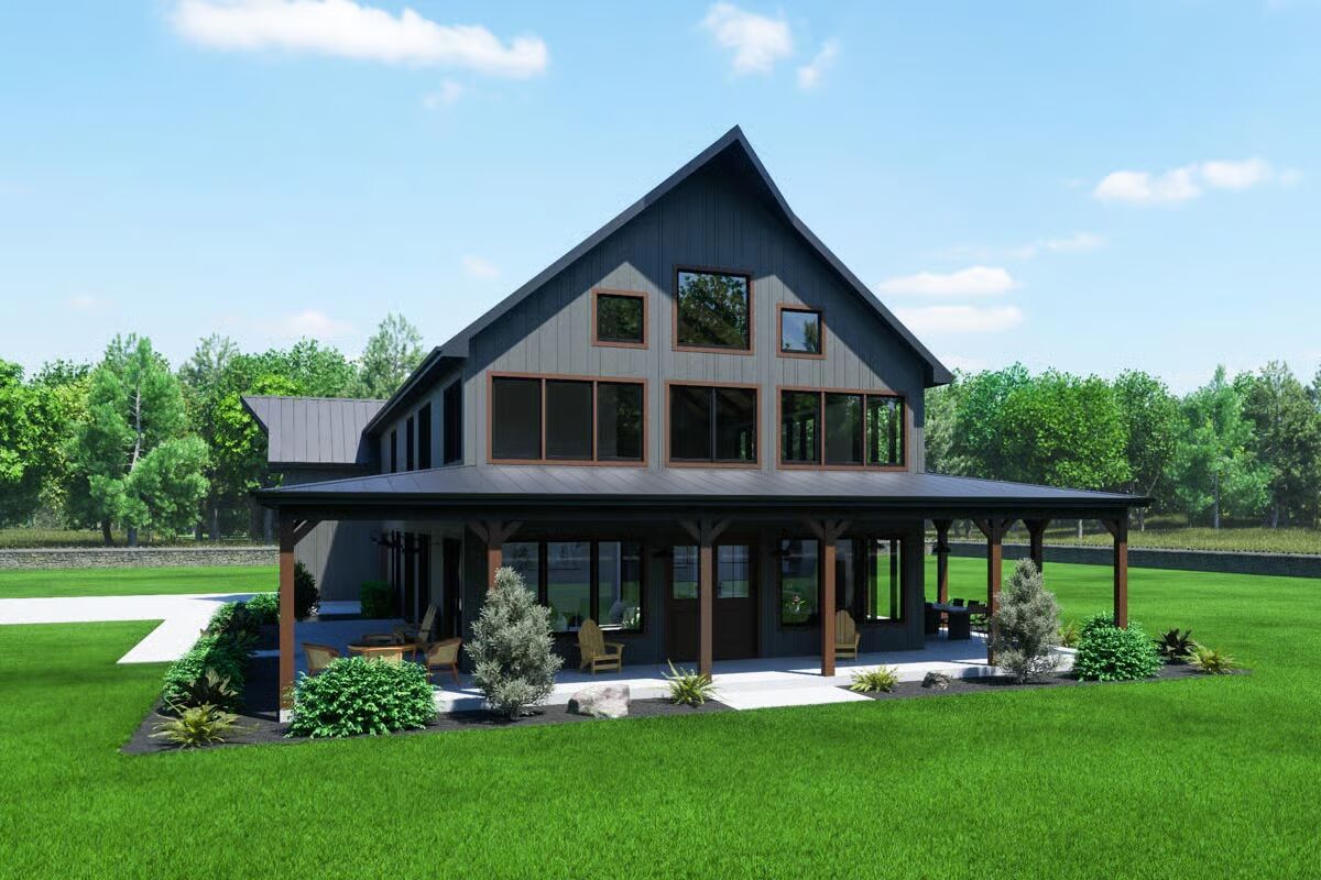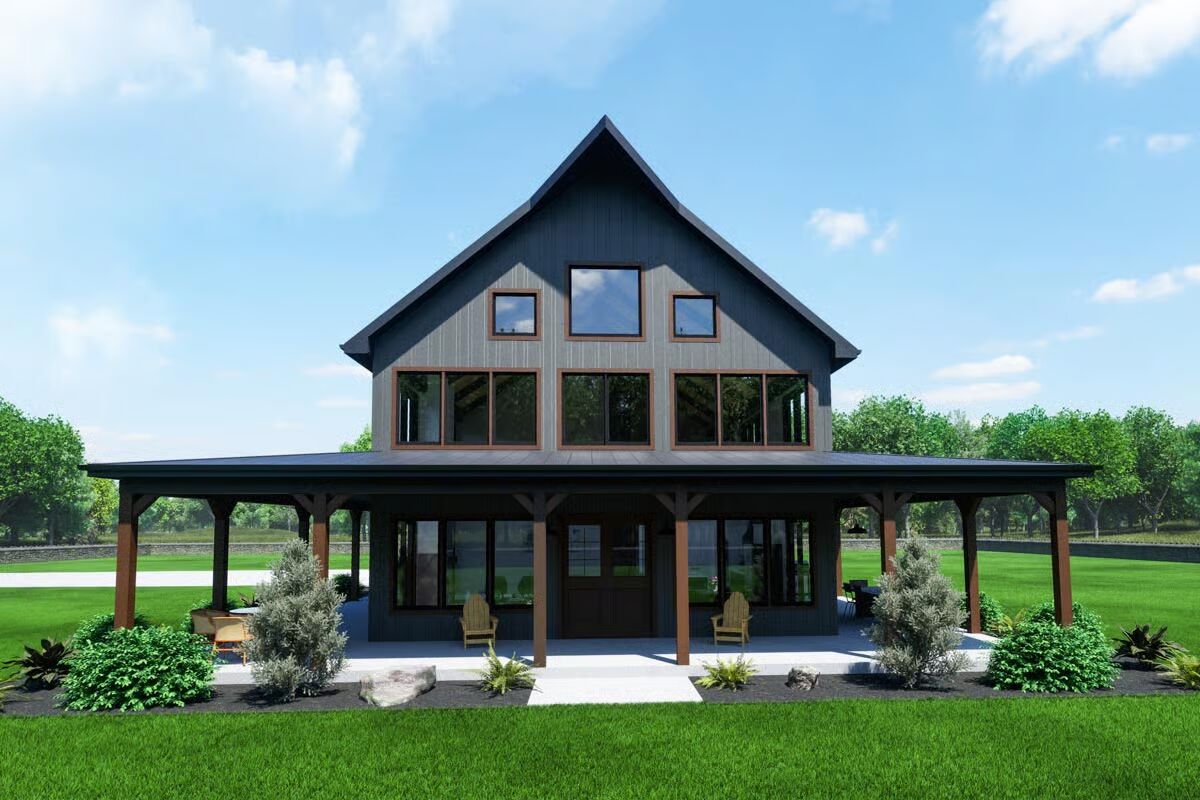 Experience modern farm living with this stylish barndominium, featuring an expansive garage and an inviting covered porch.Discover the striking angles and contemporary appeal of this unique barndominium, framed by lush greenery.Admire the sleek, dark exterior and abundant windows that bring the outdoors in on this impressive barndominium.Unwind on the spacious covered patio of this elegant barndominium, offering seamless indoor-outdoor living.Be captivated by the grand facade and welcoming wrap-around porch of this stunning barndominium.Savor the charm of this barndominium’s outdoor spaces, from the relaxed porch to the well-landscaped surroundings.Step into a bright and airy living room, boasting soaring ceilings, a modern fireplace, and picturesque outdoor views.Gather around the sleek island in this contemporary kitchen, designed for both culinary creativity and effortless entertaining.Ascend to a charming loft space, featuring vaulted ceilings and a cozy nook perfect for reading or relaxation.Marvel at the open-concept design from above, showcasing a fluid transition between living, dining, and kitchen areas bathed in natural light.Retreat to a tranquil bedroom, where a rustic bed frame and scenic art create a peaceful, inviting sanctuary.Relax in a modern bathroom with a chic double vanity and a soaking tub perfect for unwinding.Enjoy the bright, clean lines of this modern shower, featuring striking tiled accents and a large window for natural light.