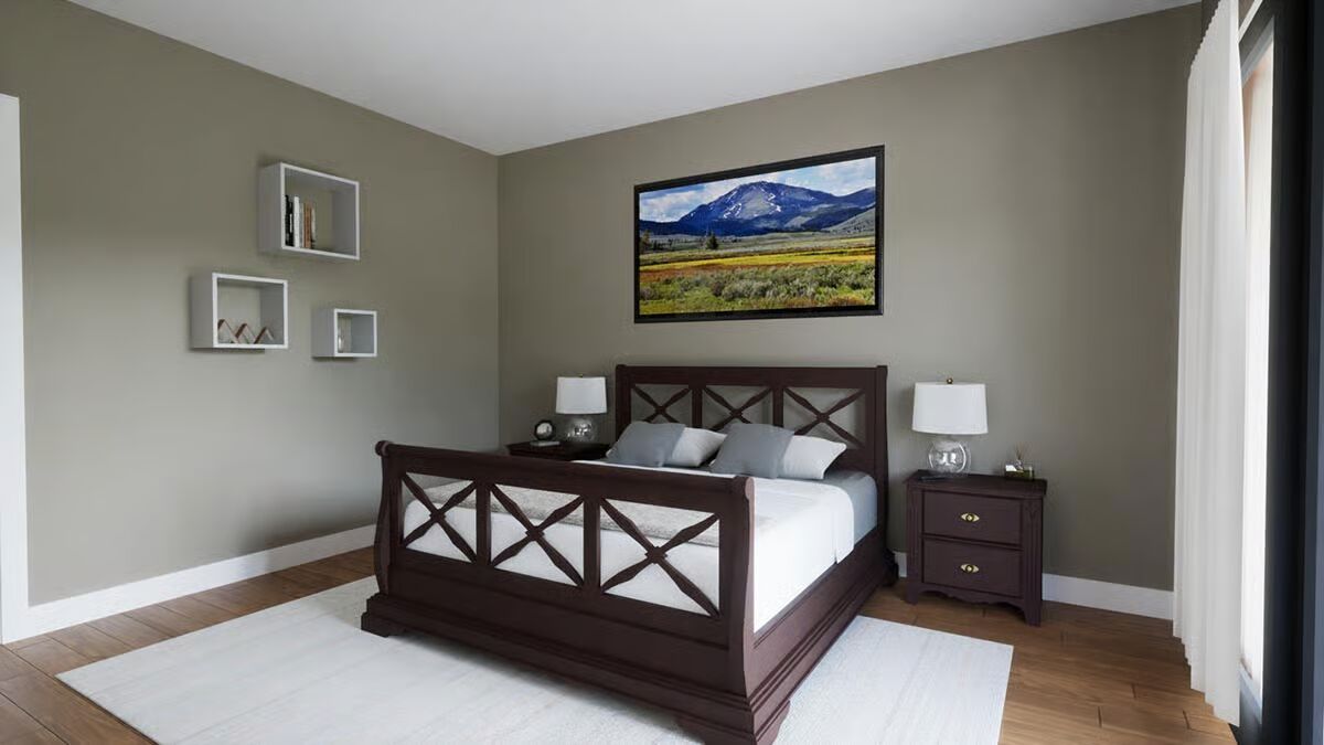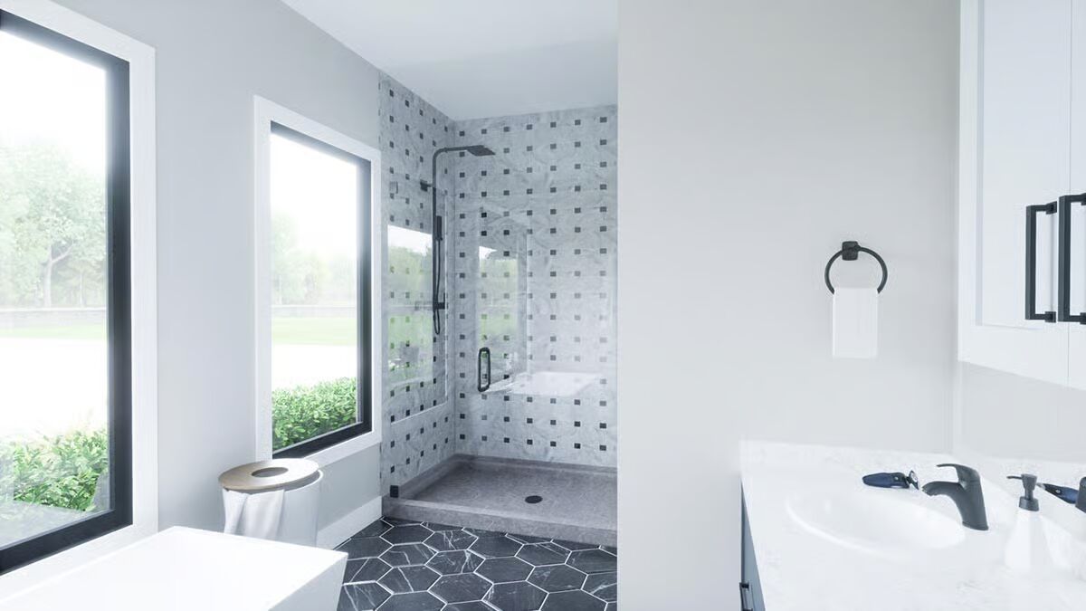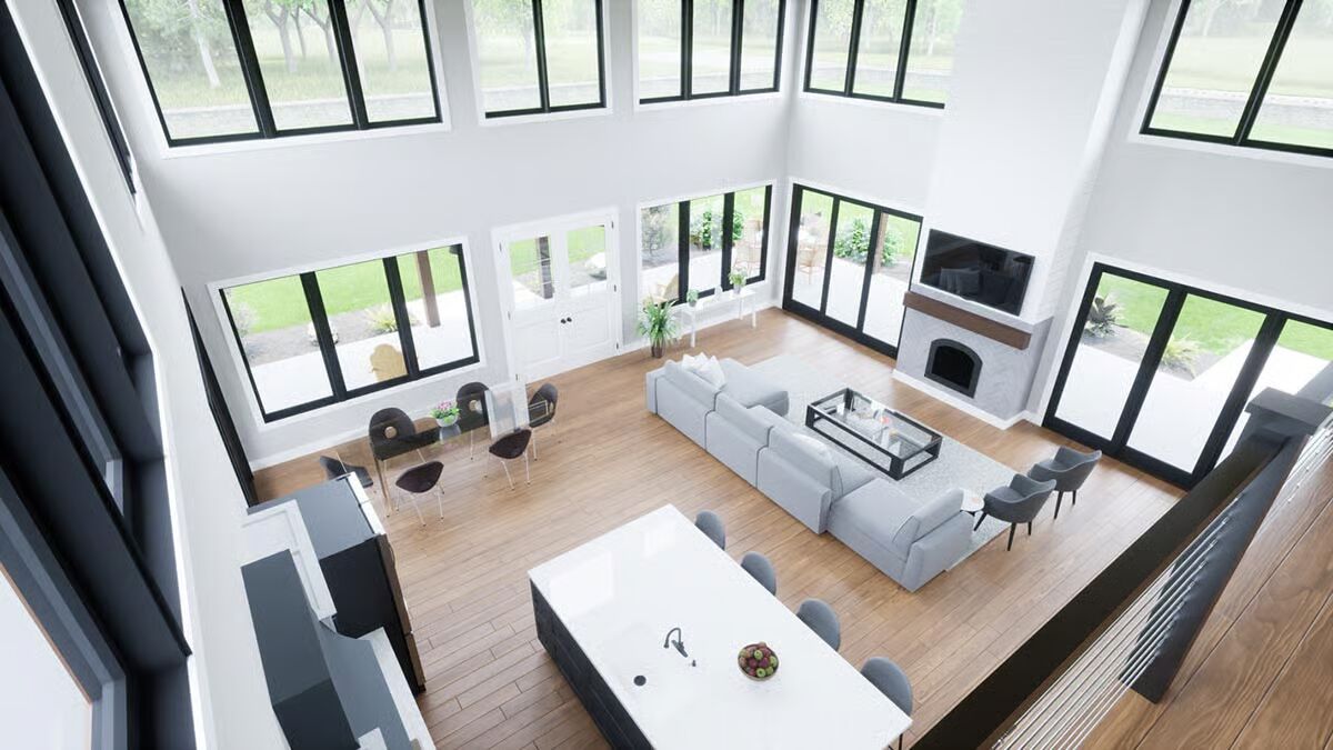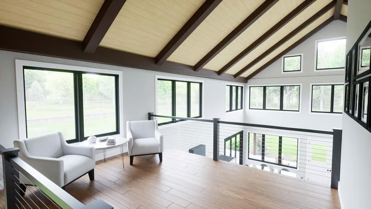 Experience modern farm living with this stylish barndominium, featuring an expansive garage and an inviting covered porch.Discover the striking angles and contemporary appeal of this unique barndominium, framed by lush greenery.Admire the sleek, dark exterior and abundant windows that bring the outdoors in on this impressive barndominium.Unwind on the spacious covered patio of this elegant barndominium, offering seamless indoor-outdoor living.Be captivated by the grand facade and welcoming wrap-around porch of this stunning barndominium.Savor the charm of this barndominium’s outdoor spaces, from the relaxed porch to the well-landscaped surroundings.Step into a bright and airy living room, boasting soaring ceilings, a modern fireplace, and picturesque outdoor views.Gather around the sleek island in this contemporary kitchen, designed for both culinary creativity and effortless entertaining.Ascend to a charming loft space, featuring vaulted ceilings and a cozy nook perfect for reading or relaxation.Marvel at the open-concept design from above, showcasing a fluid transition between living, dining, and kitchen areas bathed in natural light.Retreat to a tranquil bedroom, where a rustic bed frame and scenic art create a peaceful, inviting sanctuary.Relax in a modern bathroom with a chic double vanity and a soaking tub perfect for unwinding.Enjoy the bright, clean lines of this modern shower, featuring striking tiled accents and a large window for natural light.