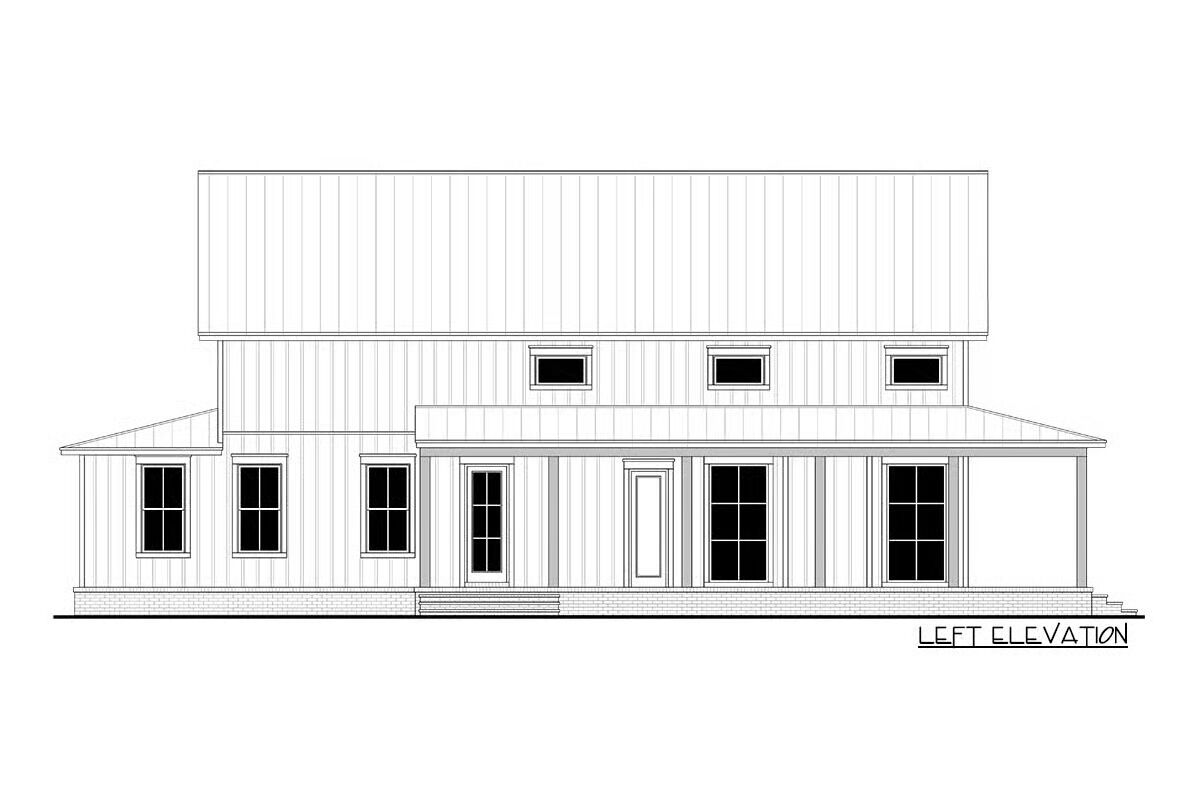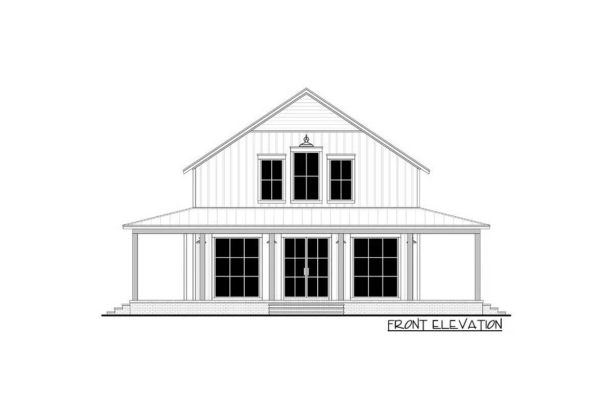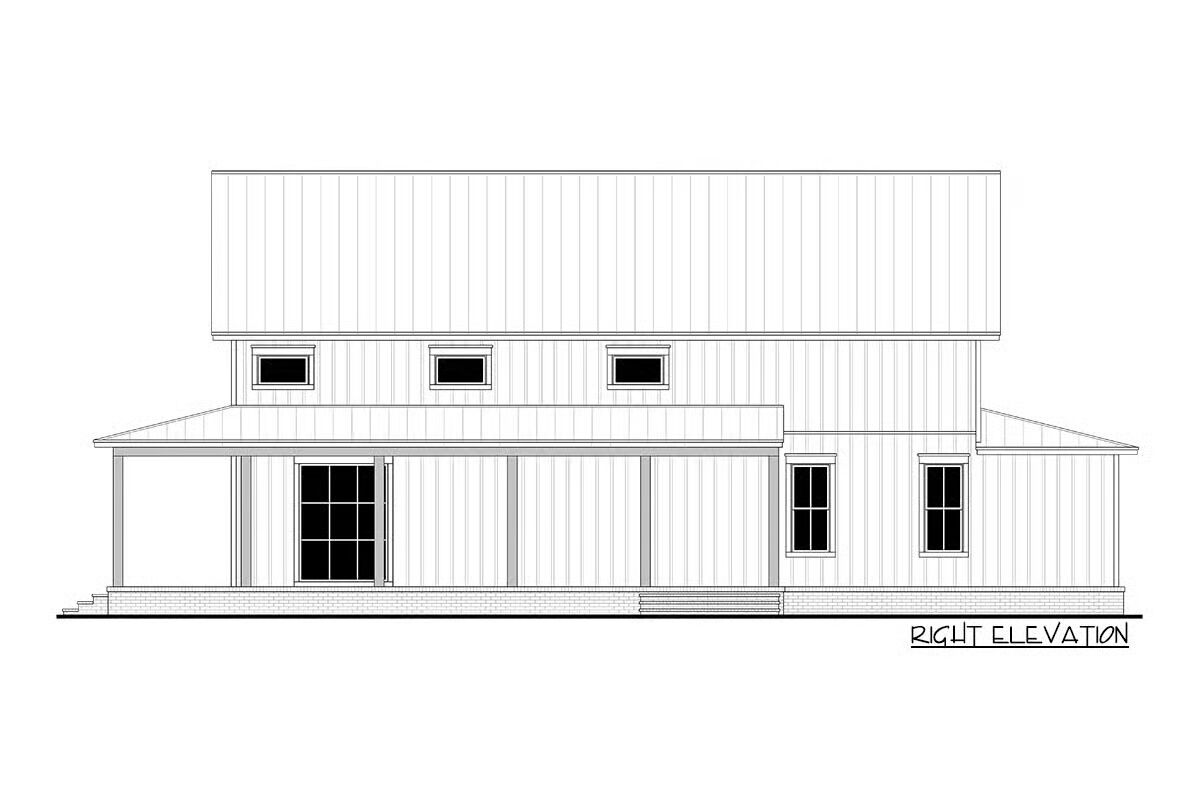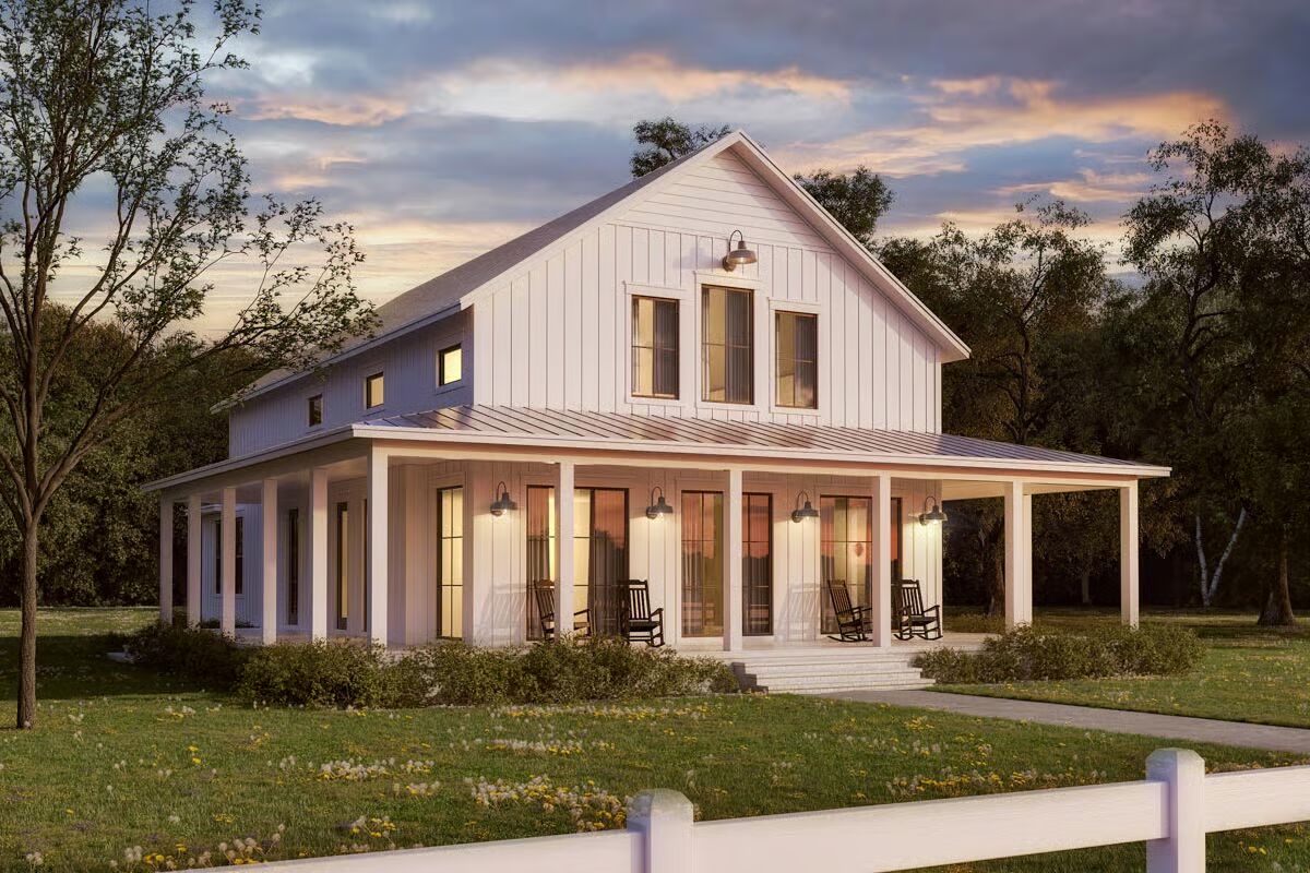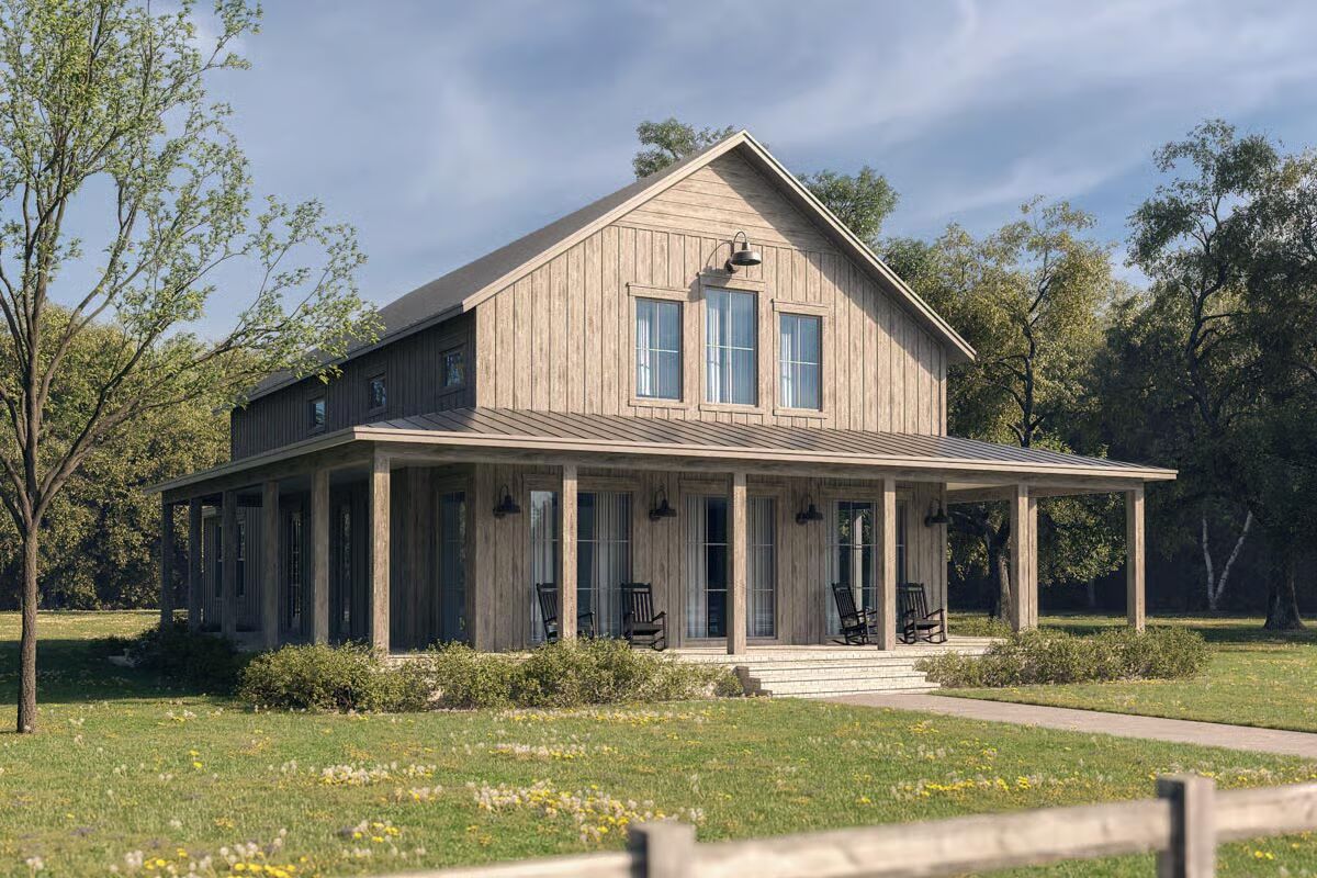 Built with conventional 2×6 framing, the exterior showcases classic board-and-batten siding paired with a metal shed roof over the expansive wraparound porch, creating timeless country appeal.