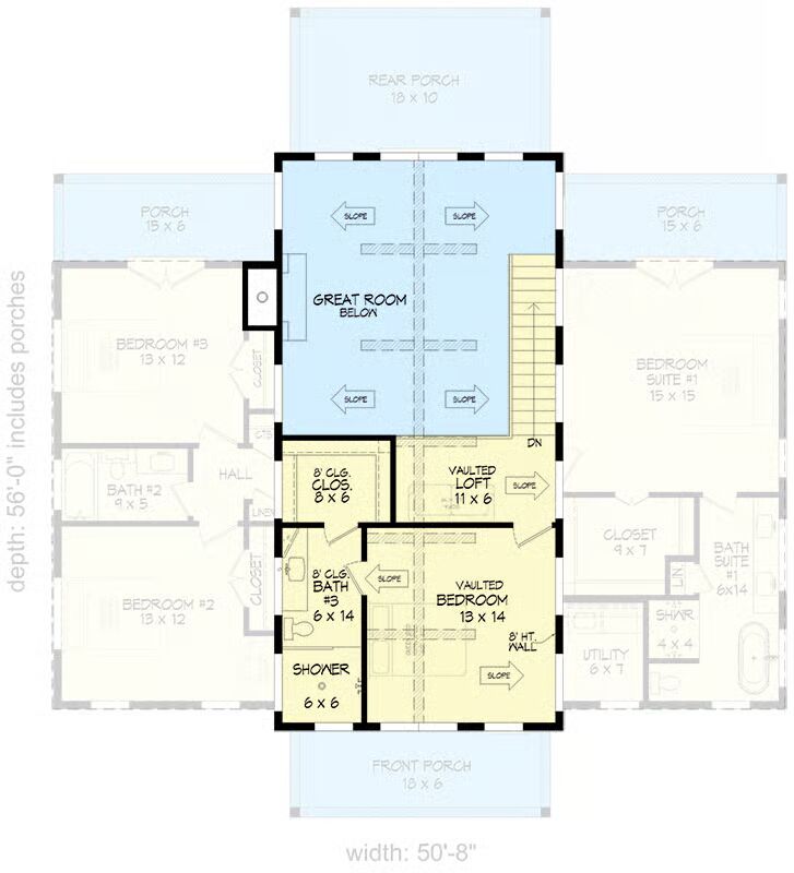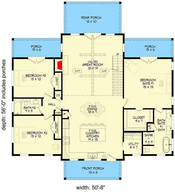 Outdoor living is a highlight, with each rear bedroom enjoying access to its own private 15′ x 6′ covered porch, while the great room extends to a spacious 18′ x 10′ rear porch, perfect for entertaining or relaxing.