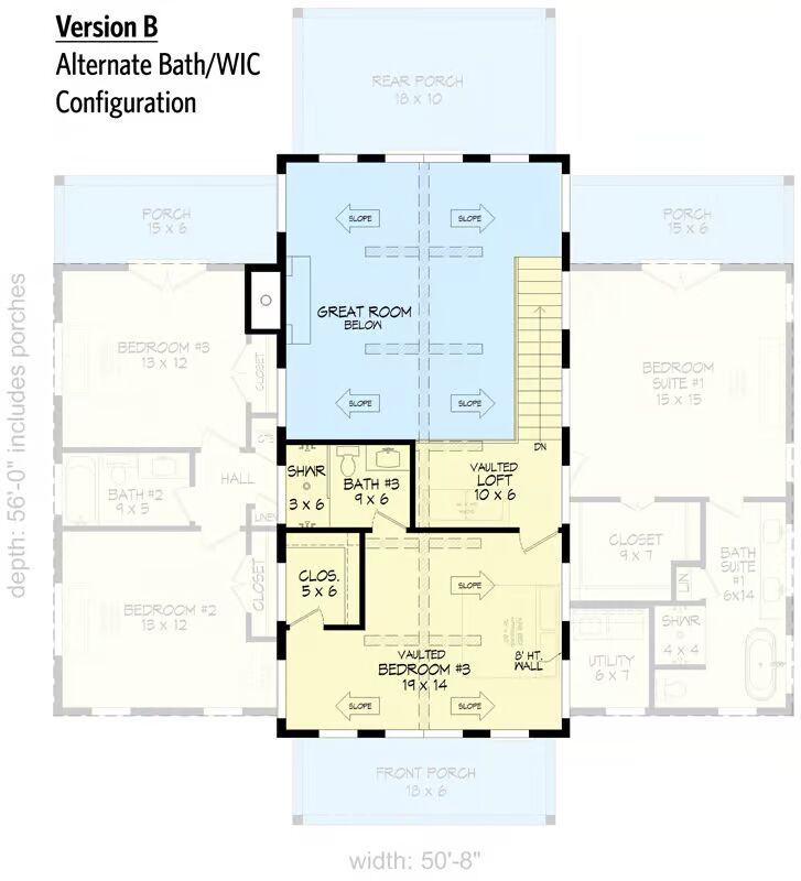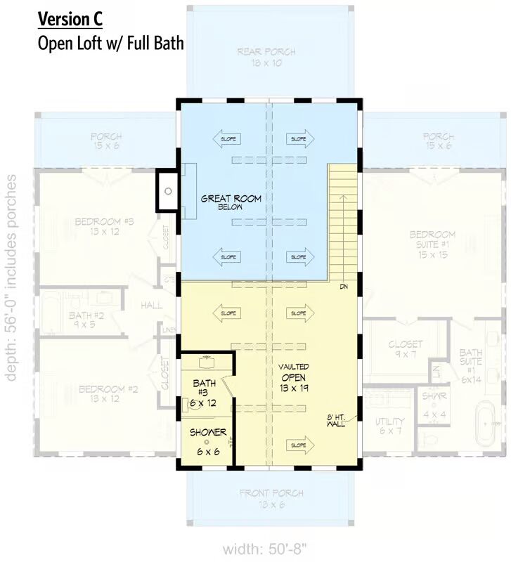 - Version B: Open loft space with full bath in place of a bedroom.