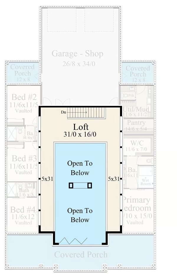 A smaller version of plan 85363MS, it can be built as a single-level home with an unfinished upper floor above the garage — or expanded into a multi-level design with bonus living space.