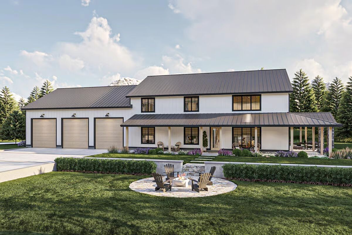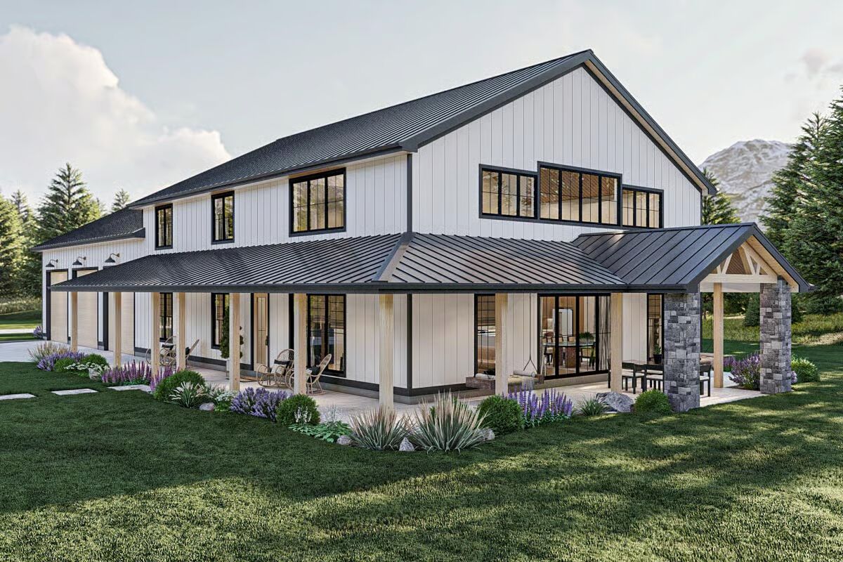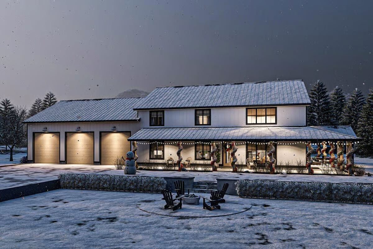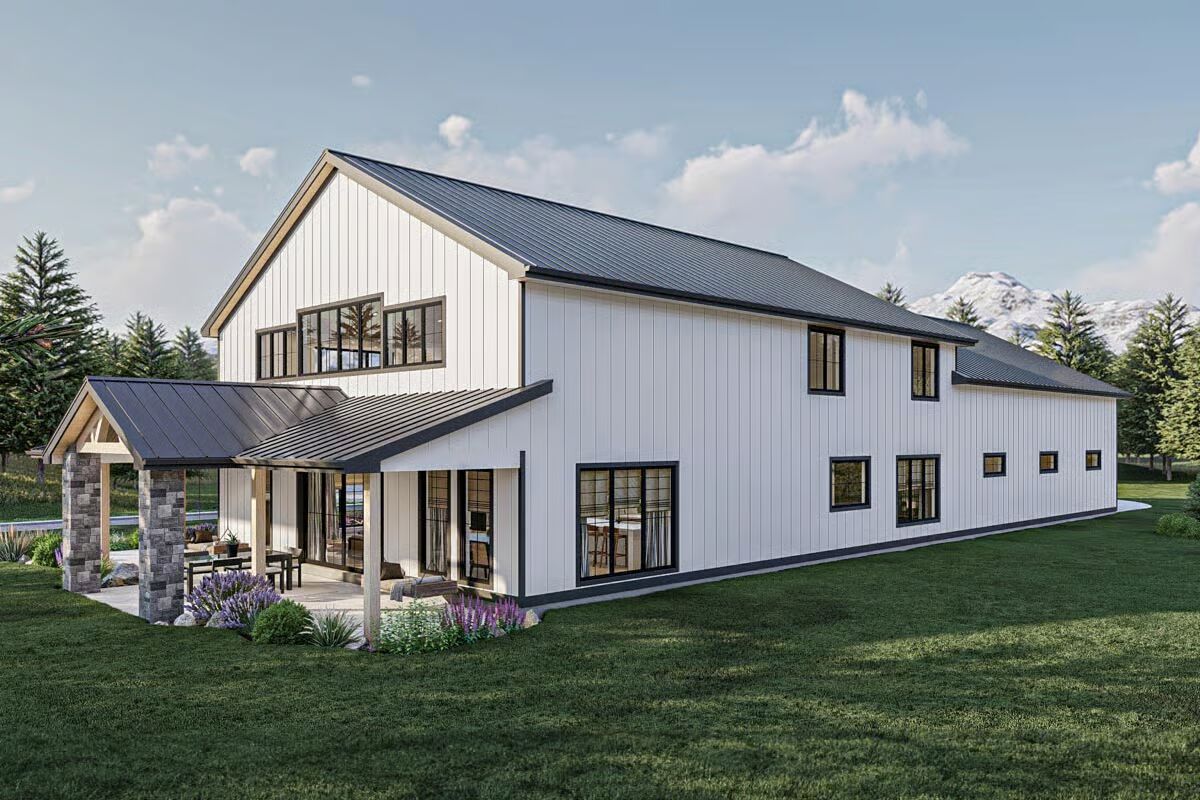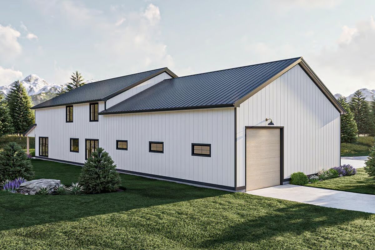 Buy This PlanThis classic Barndominium-style house features a wide front porch and a picturesque fire pit area on the manicured lawn.A clean white Barndominium-style home boasts a three-car garage and a welcoming covered front porch.The side profile of this Barndominium-style structure highlights its long, gabled roofline and convenient side garage door access.This Barndominium-style home shows its expansive side view with a covered outdoor dining area and a durable metal roof.An elegant Barndominium-style design features an extensive wrap-around covered patio perfect for all-weather outdoor entertaining.The striking rear view of the Barndominium-style house at twilight showcases a central glass entry and inviting patio swing benches.This festive Barndominium-style home glows warmly in a snowy setting, beautifully adorned with holiday lights and a snowman.A grand living room features high ceilings, a lofted balcony, and stylish leather sofas accented by dark barn doors.The home office is a stylish retreat with dark green shiplap walls, built-in shelving, and a sleek white and metal desk.An elegant dining area features a unique oval stone table, caned dining chairs, and tall windows framed by striped curtains.The modern kitchen showcases light wood cabinetry, a white marble backsplash, and a large center island with bar seating.This stunning open-concept space features vaulted ceilings with wood accents, a towering fireplace, and seamless flow between the dining and living areas.The bedroom is a sophisticated haven with a dark accent wall, woven bed details, and large windows with heavy curtains.A luxurious master bathroom features a sculptural soaking tub centered beneath a large window, surrounded by dramatic dark marble walls.This chic bathroom includes a dark vanity with vessel sinks, brass fixtures, and a glass-enclosed walk-in shower.The laundry room is both functional and stylish with dark cabinetry, a utility sink, and a decorative floral wallpaper backdrop.A dedicated pet bathing or utility shower area features subway tile wainscoting and charming vintage-style laundry artwork.A cozy media room offers a neutral palette, a plush sectional sofa, a textured rug, and a wide wall-mounted TV.