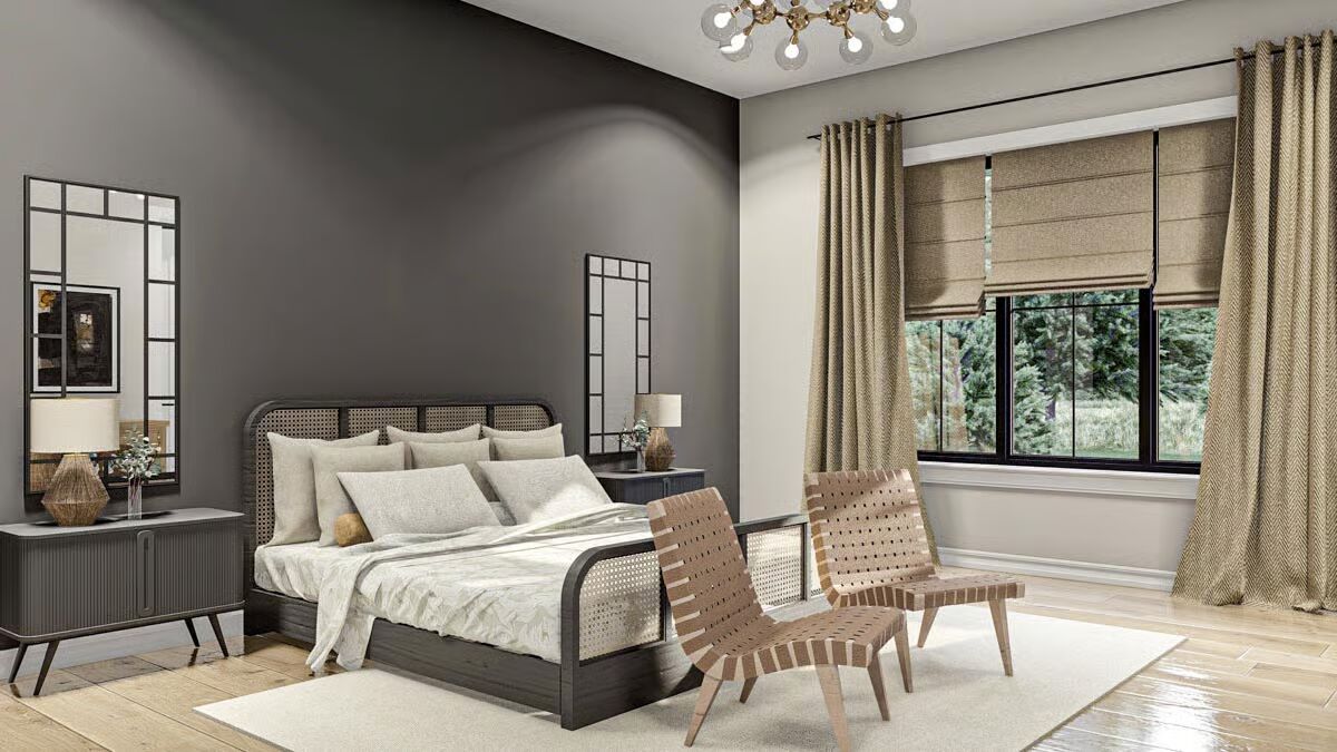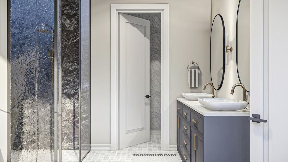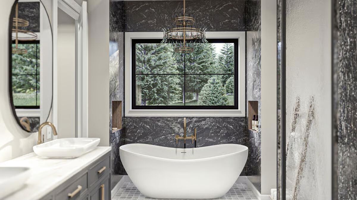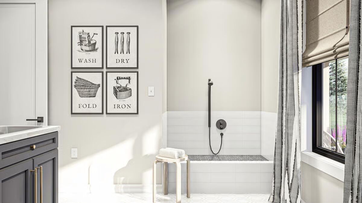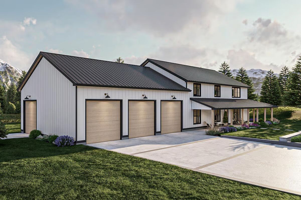 Buy This PlanThis classic Barndominium-style house features a wide front porch and a picturesque fire pit area on the manicured lawn.A clean white Barndominium-style home boasts a three-car garage and a welcoming covered front porch.The side profile of this Barndominium-style structure highlights its long, gabled roofline and convenient side garage door access.This Barndominium-style home shows its expansive side view with a covered outdoor dining area and a durable metal roof.An elegant Barndominium-style design features an extensive wrap-around covered patio perfect for all-weather outdoor entertaining.The striking rear view of the Barndominium-style house at twilight showcases a central glass entry and inviting patio swing benches.This festive Barndominium-style home glows warmly in a snowy setting, beautifully adorned with holiday lights and a snowman.A grand living room features high ceilings, a lofted balcony, and stylish leather sofas accented by dark barn doors.The home office is a stylish retreat with dark green shiplap walls, built-in shelving, and a sleek white and metal desk.An elegant dining area features a unique oval stone table, caned dining chairs, and tall windows framed by striped curtains.The modern kitchen showcases light wood cabinetry, a white marble backsplash, and a large center island with bar seating.This stunning open-concept space features vaulted ceilings with wood accents, a towering fireplace, and seamless flow between the dining and living areas.The bedroom is a sophisticated haven with a dark accent wall, woven bed details, and large windows with heavy curtains.A luxurious master bathroom features a sculptural soaking tub centered beneath a large window, surrounded by dramatic dark marble walls.This chic bathroom includes a dark vanity with vessel sinks, brass fixtures, and a glass-enclosed walk-in shower.The laundry room is both functional and stylish with dark cabinetry, a utility sink, and a decorative floral wallpaper backdrop.A dedicated pet bathing or utility shower area features subway tile wainscoting and charming vintage-style laundry artwork.A cozy media room offers a neutral palette, a plush sectional sofa, a textured rug, and a wide wall-mounted TV.