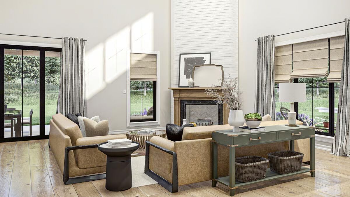 A 9-foot–deep wraparound porch embraces two sides of the home, highlighted by a vaulted outdoor living area perfect for year-round relaxation and entertaining.
