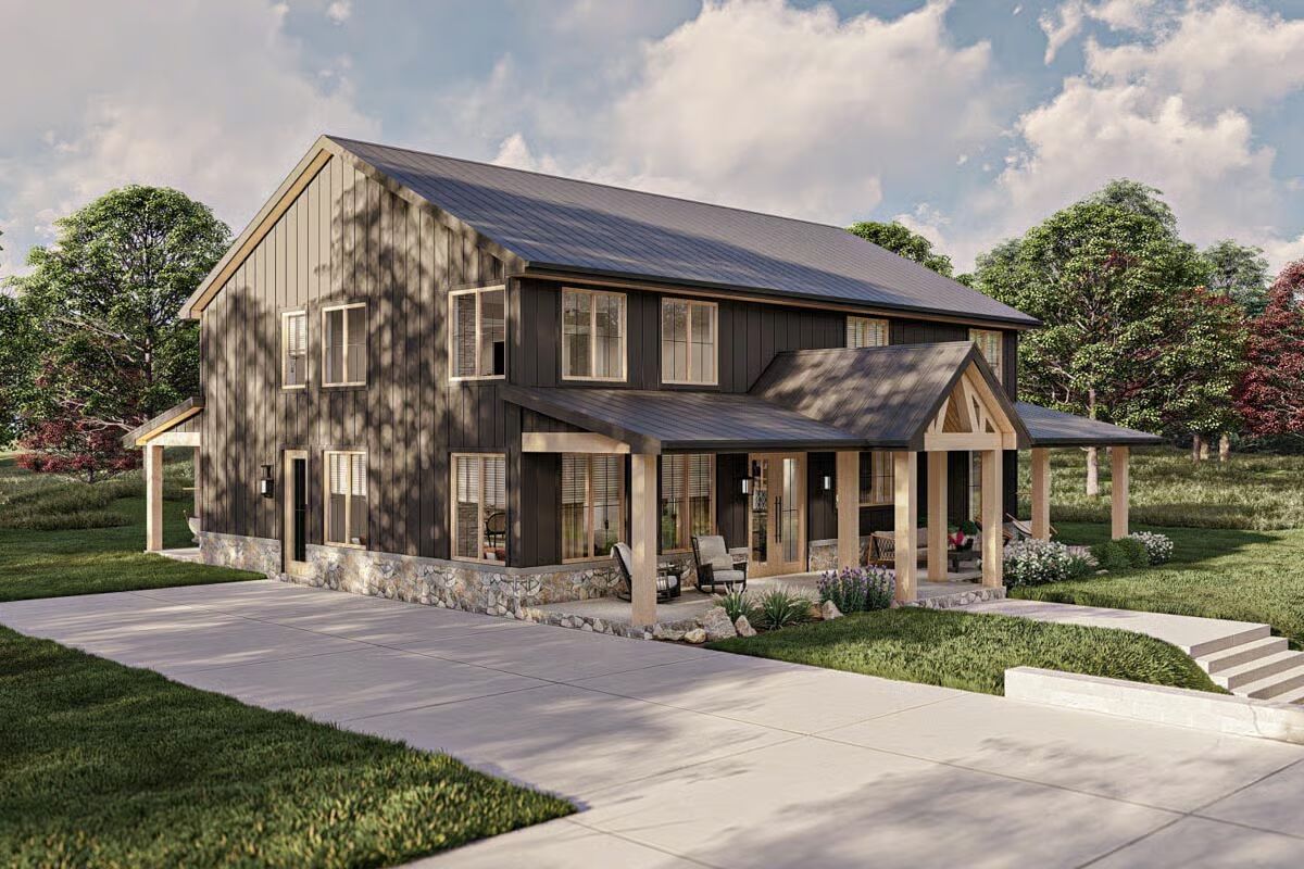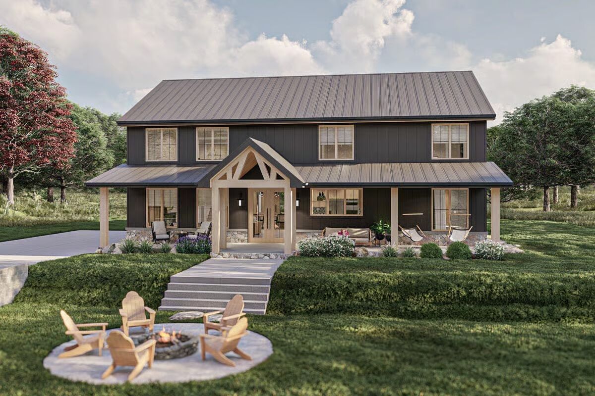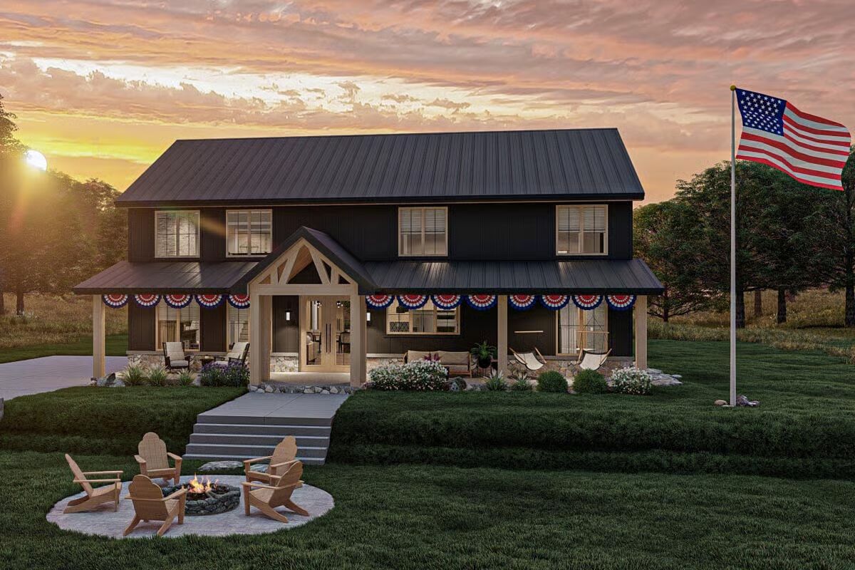 The impressive dark-sided Barndominium is framed by lush greenery, a wide front porch, and a prepared fire pit area.A patriotic Barndominium-style home featuring a dark metal roof, a wide porch, and a cozy fire pit at sunset.A clear-day view of the Barndominium’s front elevation, showcasing the stone skirting and the inviting covered entry with wood posts.This rear corner view highlights the home’s dark modern exterior, blending vertical siding and stone with a spacious covered porch.The Barndominium’s back corner features a seamless blend of dark vertical siding and metal roofing, extending over a covered patio.An angled view emphasizing the home’s contemporary farmhouse aesthetic with a deep porch, natural wood accents, and a large yard.The elegant dining area is highlighted by a long oval table, modern chairs, and a striking linear chandelier.A soaring two-story living room featuring a dramatic floor-to-ceiling stone fireplace and a light, contemporary seating arrangement.A bright, open living space focused on a comfortable sofa and armchairs, with a peek into the stylish kitchen beyond.The grand open-concept design shows the living room with a loft overlook, connecting the dining and kitchen areas.A close-up of a charming rustic-industrial clock on a side table, with the modern staircase and open living area blurred in the background.The contemporary kitchen shines with light wood cabinetry, a massive black marble island, and a chic patterned backsplash.A slightly different perspective of the light and dark kitchen, emphasizing the gorgeous black marble island and the detailed backsplash.A cozy bedroom featuring a dramatic black accent wall, a cane headboard, and a rustic sliding barn door.This luxurious bathroom boasts a freestanding tub, light wood double vanity, and striking black and white marble and tile work.A stylish home office with bold patterned wallpaper and clean white furniture, offering a bright and focused workspace.A fun and cozy loft/bonus room featuring a leather sectional, a black and white teepee, and a casual entertainment area.