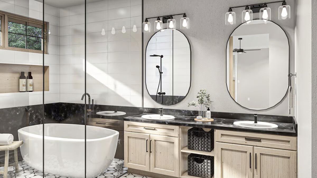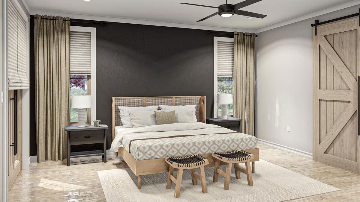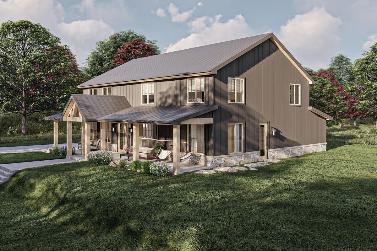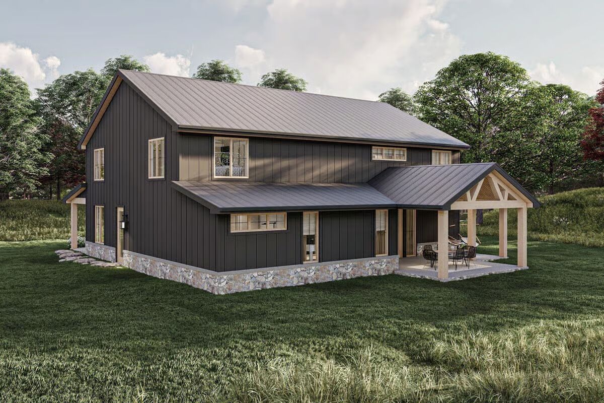 The impressive dark-sided Barndominium is framed by lush greenery, a wide front porch, and a prepared fire pit area.A patriotic Barndominium-style home featuring a dark metal roof, a wide porch, and a cozy fire pit at sunset.A clear-day view of the Barndominium’s front elevation, showcasing the stone skirting and the inviting covered entry with wood posts.This rear corner view highlights the home’s dark modern exterior, blending vertical siding and stone with a spacious covered porch.The Barndominium’s back corner features a seamless blend of dark vertical siding and metal roofing, extending over a covered patio.An angled view emphasizing the home’s contemporary farmhouse aesthetic with a deep porch, natural wood accents, and a large yard.The elegant dining area is highlighted by a long oval table, modern chairs, and a striking linear chandelier.A soaring two-story living room featuring a dramatic floor-to-ceiling stone fireplace and a light, contemporary seating arrangement.A bright, open living space focused on a comfortable sofa and armchairs, with a peek into the stylish kitchen beyond.The grand open-concept design shows the living room with a loft overlook, connecting the dining and kitchen areas.A close-up of a charming rustic-industrial clock on a side table, with the modern staircase and open living area blurred in the background.The contemporary kitchen shines with light wood cabinetry, a massive black marble island, and a chic patterned backsplash.A slightly different perspective of the light and dark kitchen, emphasizing the gorgeous black marble island and the detailed backsplash.A cozy bedroom featuring a dramatic black accent wall, a cane headboard, and a rustic sliding barn door.This luxurious bathroom boasts a freestanding tub, light wood double vanity, and striking black and white marble and tile work.A stylish home office with bold patterned wallpaper and clean white furniture, offering a bright and focused workspace.A fun and cozy loft/bonus room featuring a leather sectional, a black and white teepee, and a casual entertainment area.