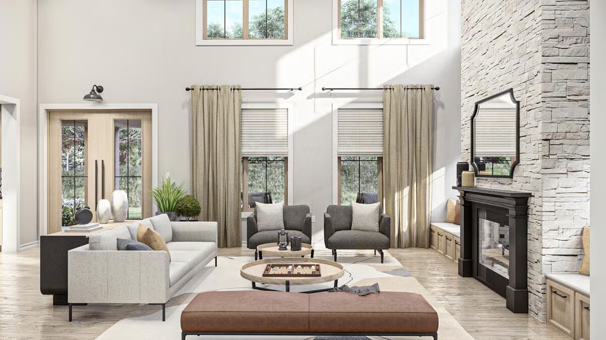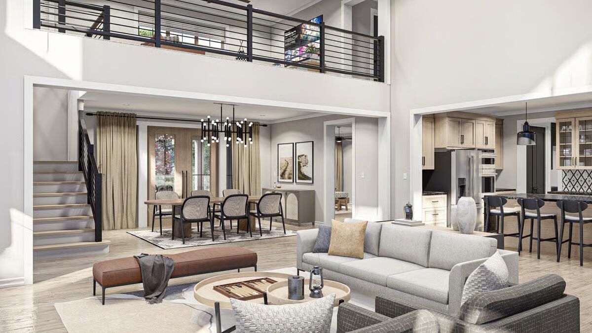 A dramatic two-story entry opens into the grand great room, where expansive windows flood the interior with natural light and create an unforgettable first impression.