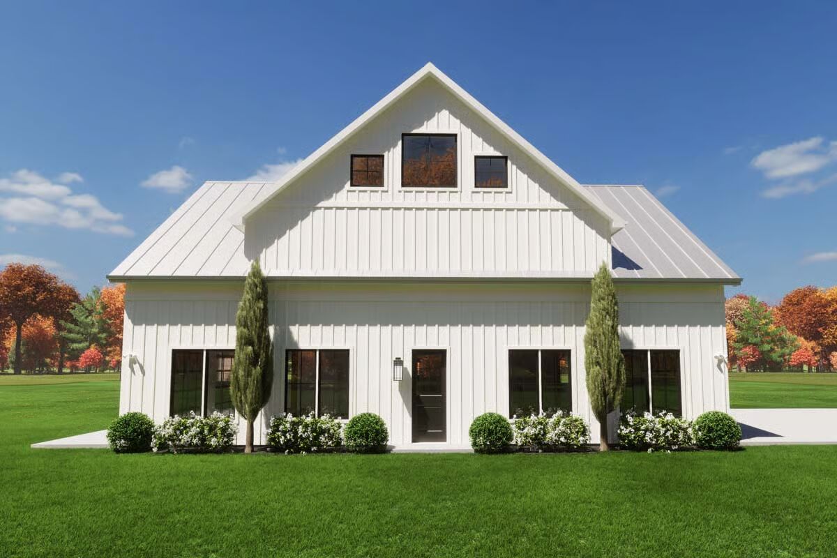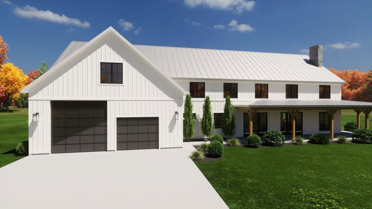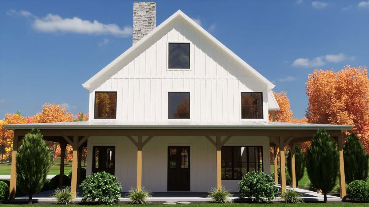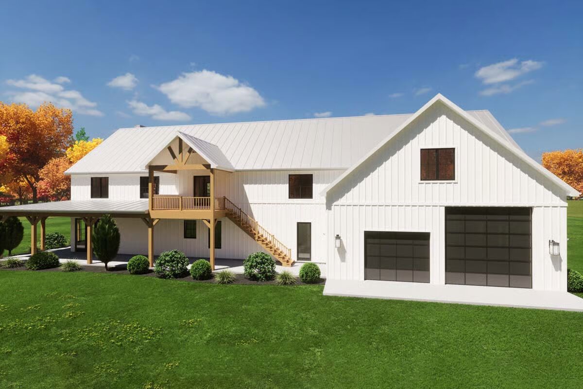 A grand front entrance features a towering chimney and a deep covered porch supported by rustic wood columns.This contemporary design mixes board-and-batten siding with a sleek metal roof and an appealing second-story balcony.This classic white Barndominium features a symmetrical front with a clean gable roofline and large black-framed windows.The side view highlights a two-car garage under a prominent gable and a long, welcoming covered porch stretching across the main body of the house.A modern back view of the house showcases a large garage door, an upper balcony with exterior stairs, and an extended covered patio.This charming facade is defined by a central stone chimney, an expansive wrap-around porch, and clean vertical white siding.The stunning living room is anchored by a floor-to-ceiling stone fireplace under an airy, vaulted ceiling.An elegant dining area boasts a vaulted ceiling, a modern chandelier, and oversized glass doors leading to the exterior.The bright, open-concept kitchen features white cabinetry, a large marble-topped island with seating, and stylish black industrial bar stools.A cozy bedroom includes an eye-catching framed gallery wall above the bed and direct access to the outdoors via a large glass sliding door.The sleek bathroom is a bright, white retreat with a built-in tub, a large window, and double vanity sinks.An impressive loft area overlooks the kitchen below, featuring vaulted ceilings with exposed wood beams and cable railing for a modern look.