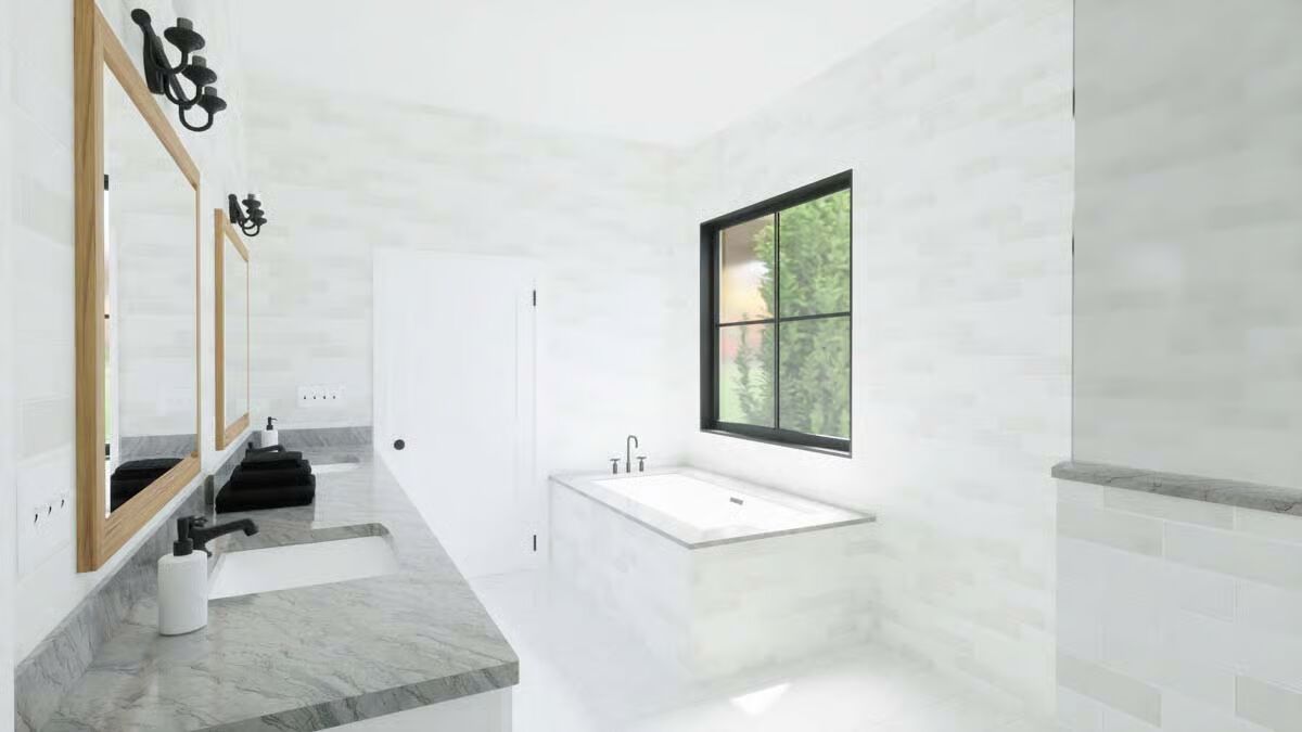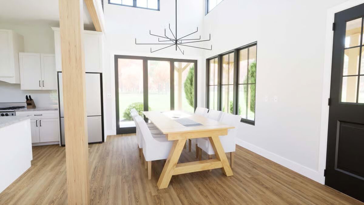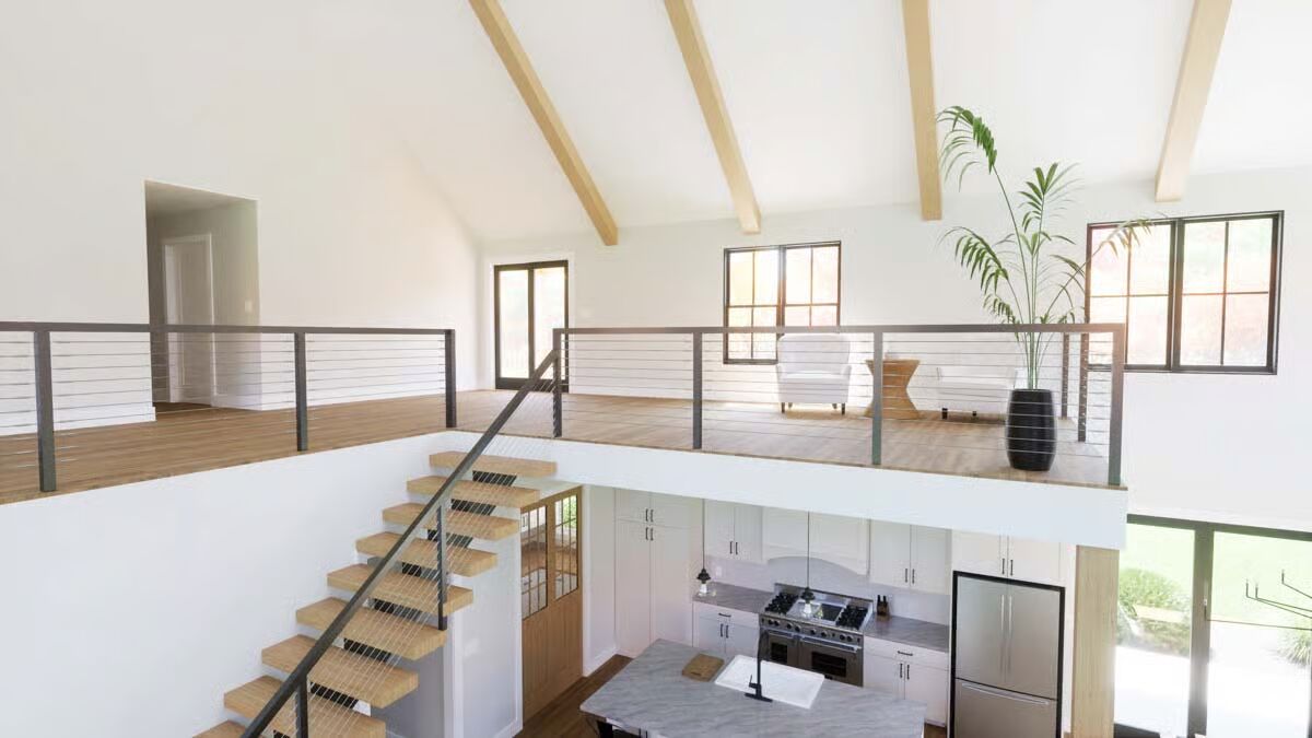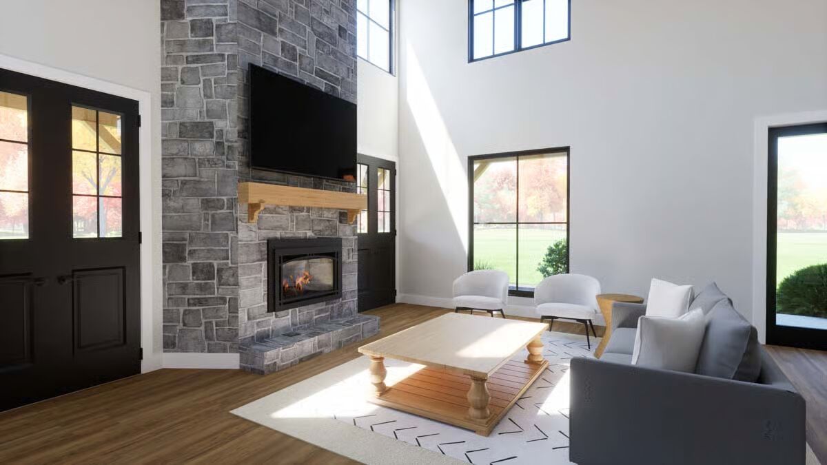 A grand front entrance features a towering chimney and a deep covered porch supported by rustic wood columns.This contemporary design mixes board-and-batten siding with a sleek metal roof and an appealing second-story balcony.This classic white Barndominium features a symmetrical front with a clean gable roofline and large black-framed windows.The side view highlights a two-car garage under a prominent gable and a long, welcoming covered porch stretching across the main body of the house.A modern back view of the house showcases a large garage door, an upper balcony with exterior stairs, and an extended covered patio.This charming facade is defined by a central stone chimney, an expansive wrap-around porch, and clean vertical white siding.The stunning living room is anchored by a floor-to-ceiling stone fireplace under an airy, vaulted ceiling.An elegant dining area boasts a vaulted ceiling, a modern chandelier, and oversized glass doors leading to the exterior.The bright, open-concept kitchen features white cabinetry, a large marble-topped island with seating, and stylish black industrial bar stools.A cozy bedroom includes an eye-catching framed gallery wall above the bed and direct access to the outdoors via a large glass sliding door.The sleek bathroom is a bright, white retreat with a built-in tub, a large window, and double vanity sinks.An impressive loft area overlooks the kitchen below, featuring vaulted ceilings with exposed wood beams and cable railing for a modern look.