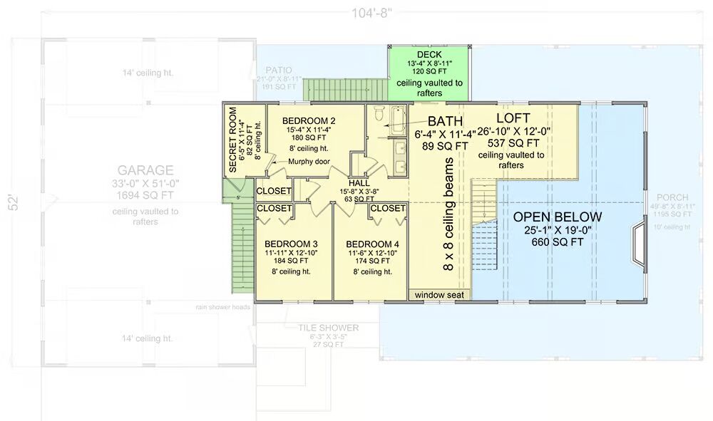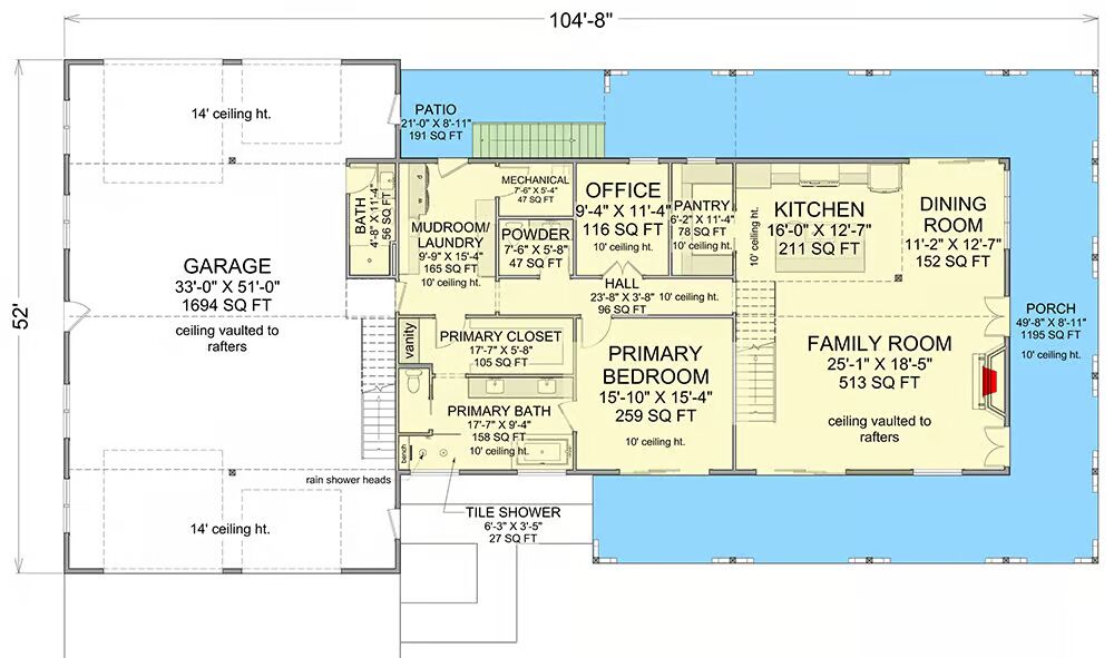 A highlight of this plan is the spacious 4-car RV-friendly garage, featuring drive-through capability and 1,695 square feet of parking—perfect for large vehicles or hobby enthusiasts. A convenient full bath at the rear of the garage provides a practical clean-up space after a day’s work.