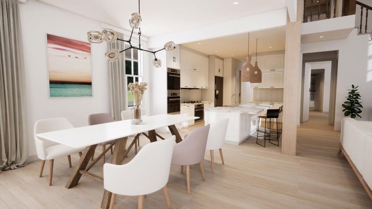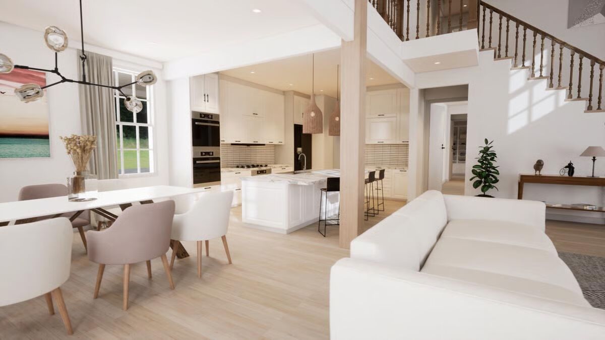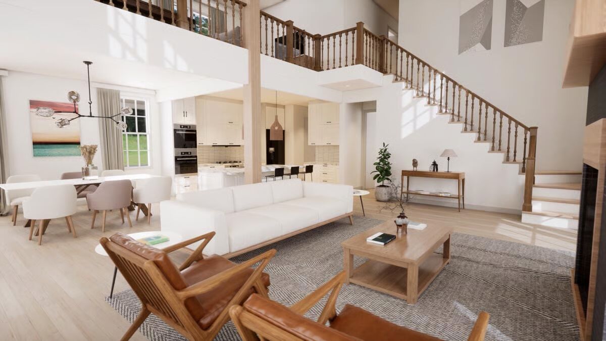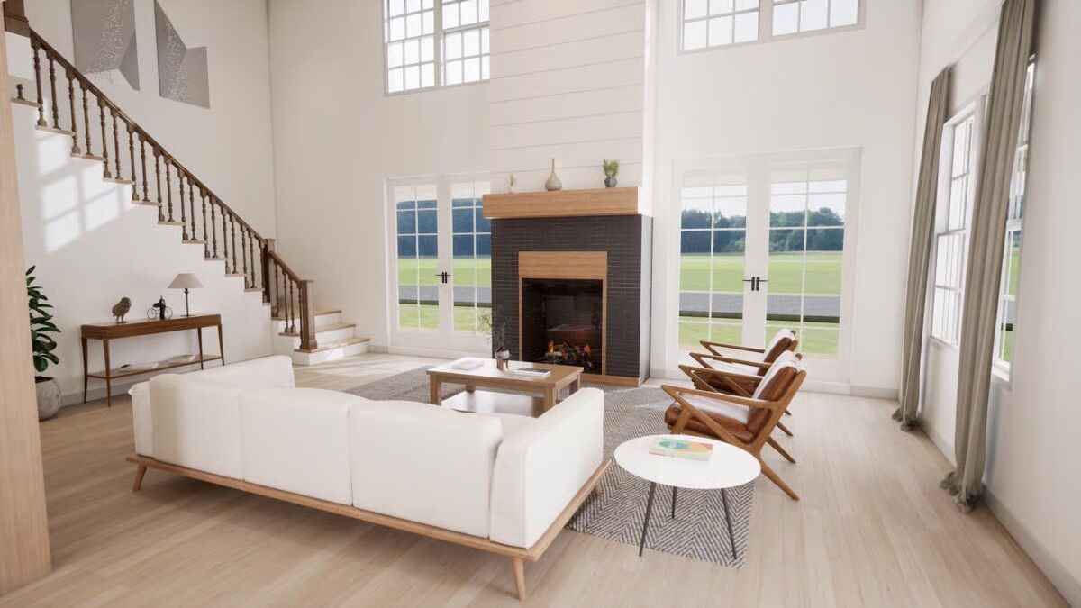 The main level features an inviting living room with a cozy fireplace and three sets of French doors leading to the porch, seamlessly blending indoor and outdoor living. The open layout continues into the dining room and kitchen, perfect for gatherings.